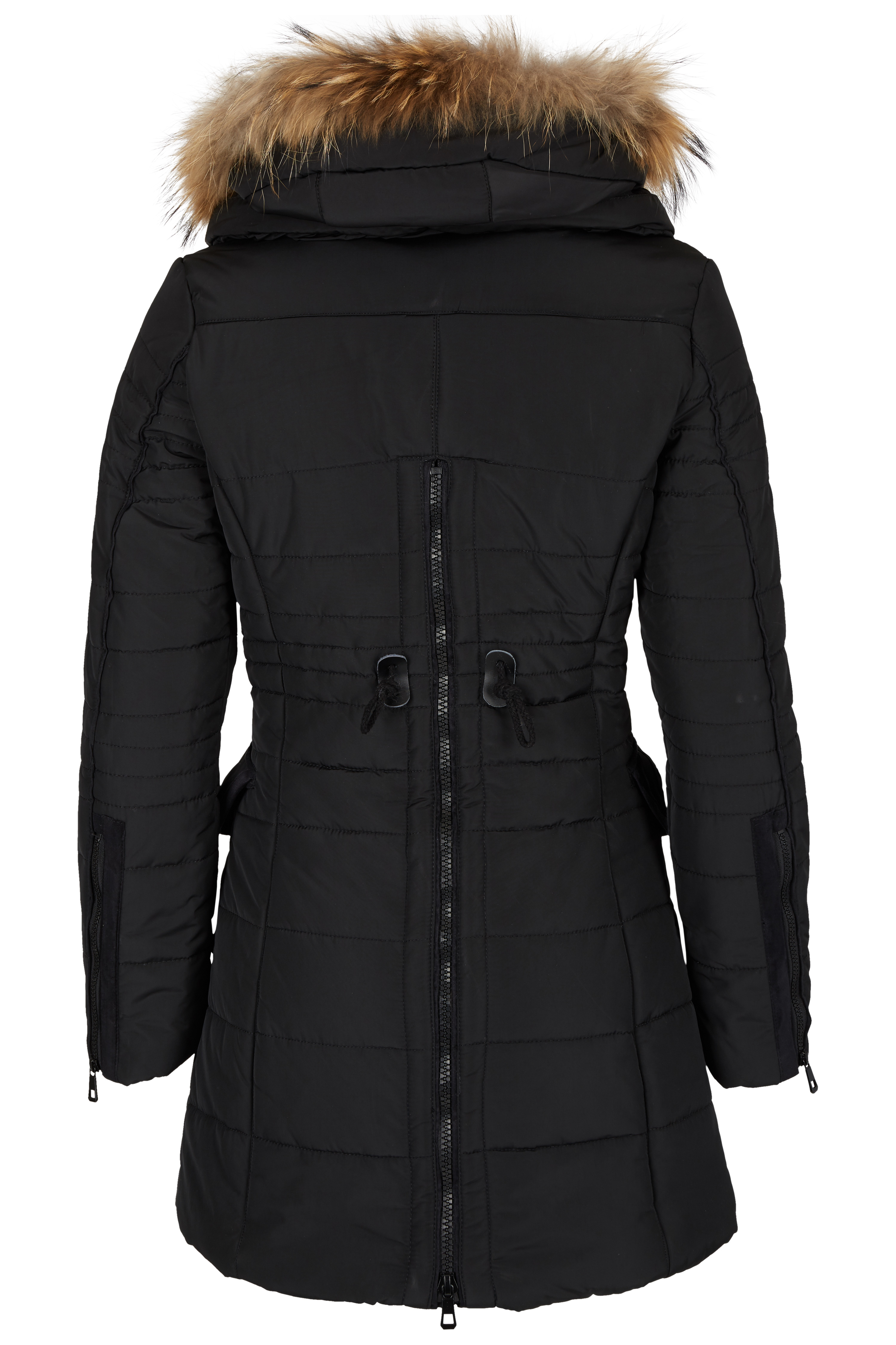 Die Jacke ist ganz toll geschnitten. Sie ist tailliert mit Reißverschluß am Rücken, wo die Weite und Form verstellt werden kann. Sie ist mit Daunen gefüttert, hat echtes Fell am Kragen und wird über einen Reißverschluuß verschlossen.