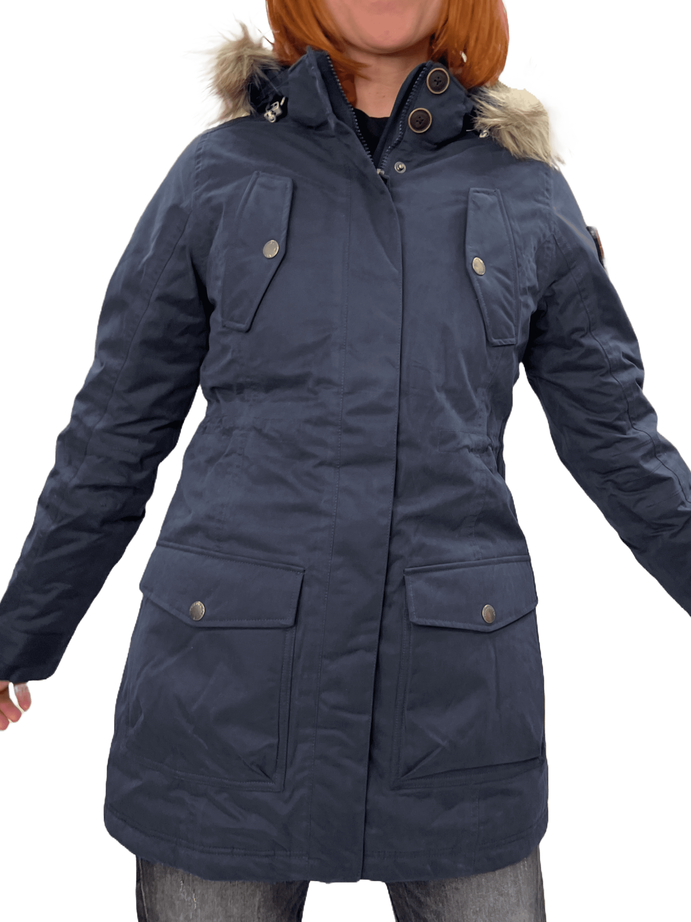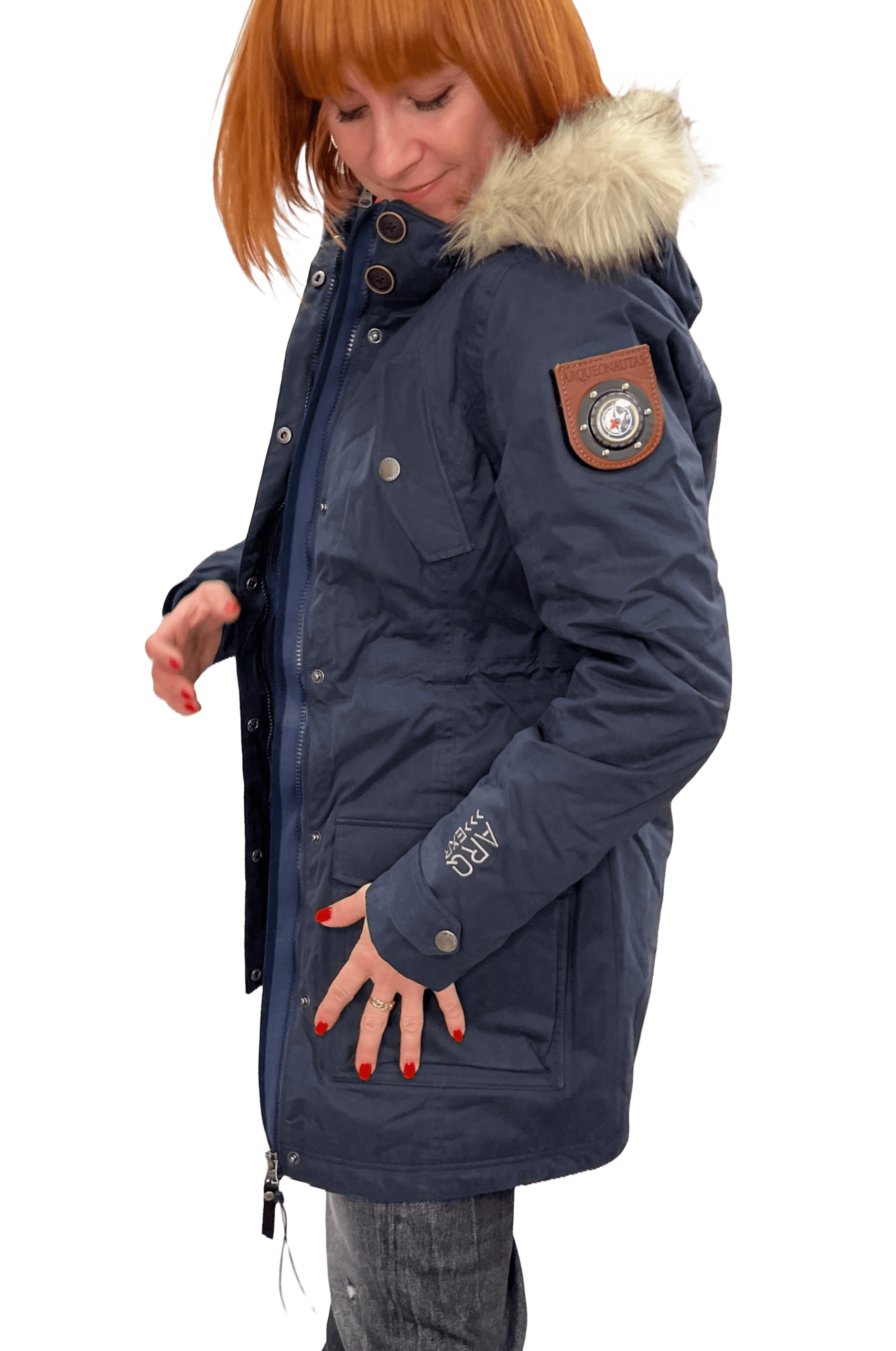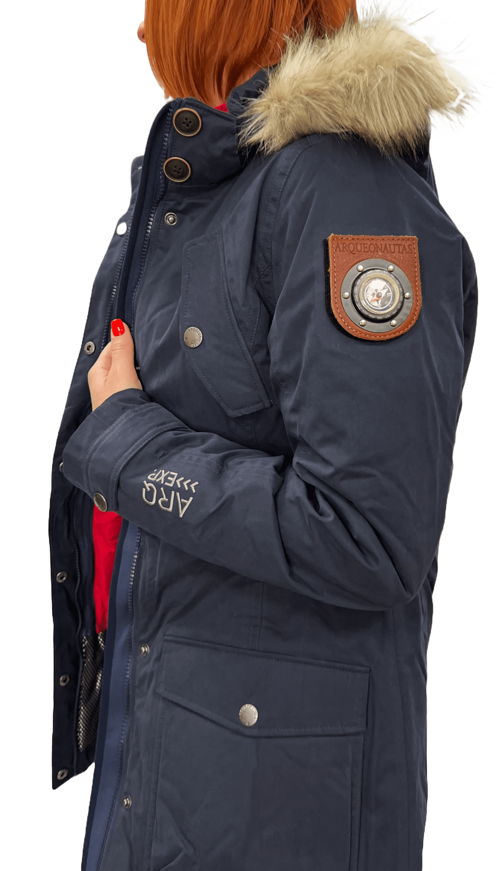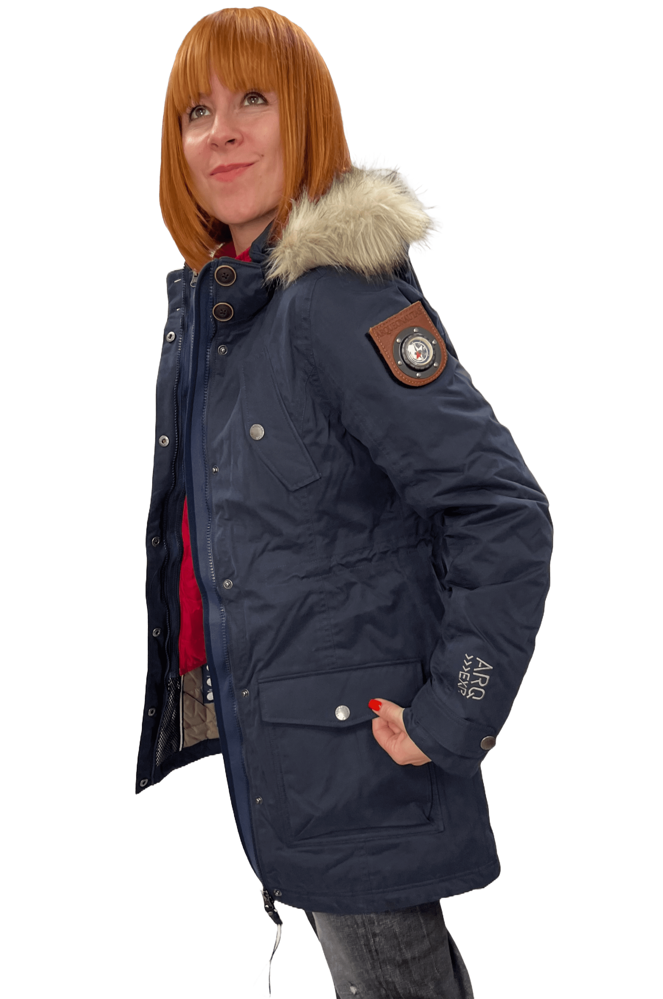 Damen Parka von Arqueonautas mit Kompass und kuscheligem Fellkragen und integrierter Weste.