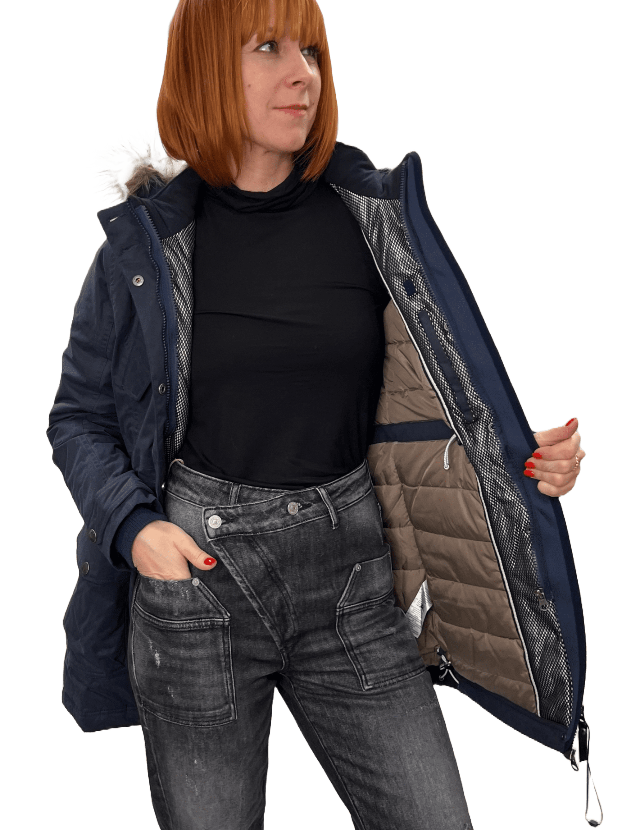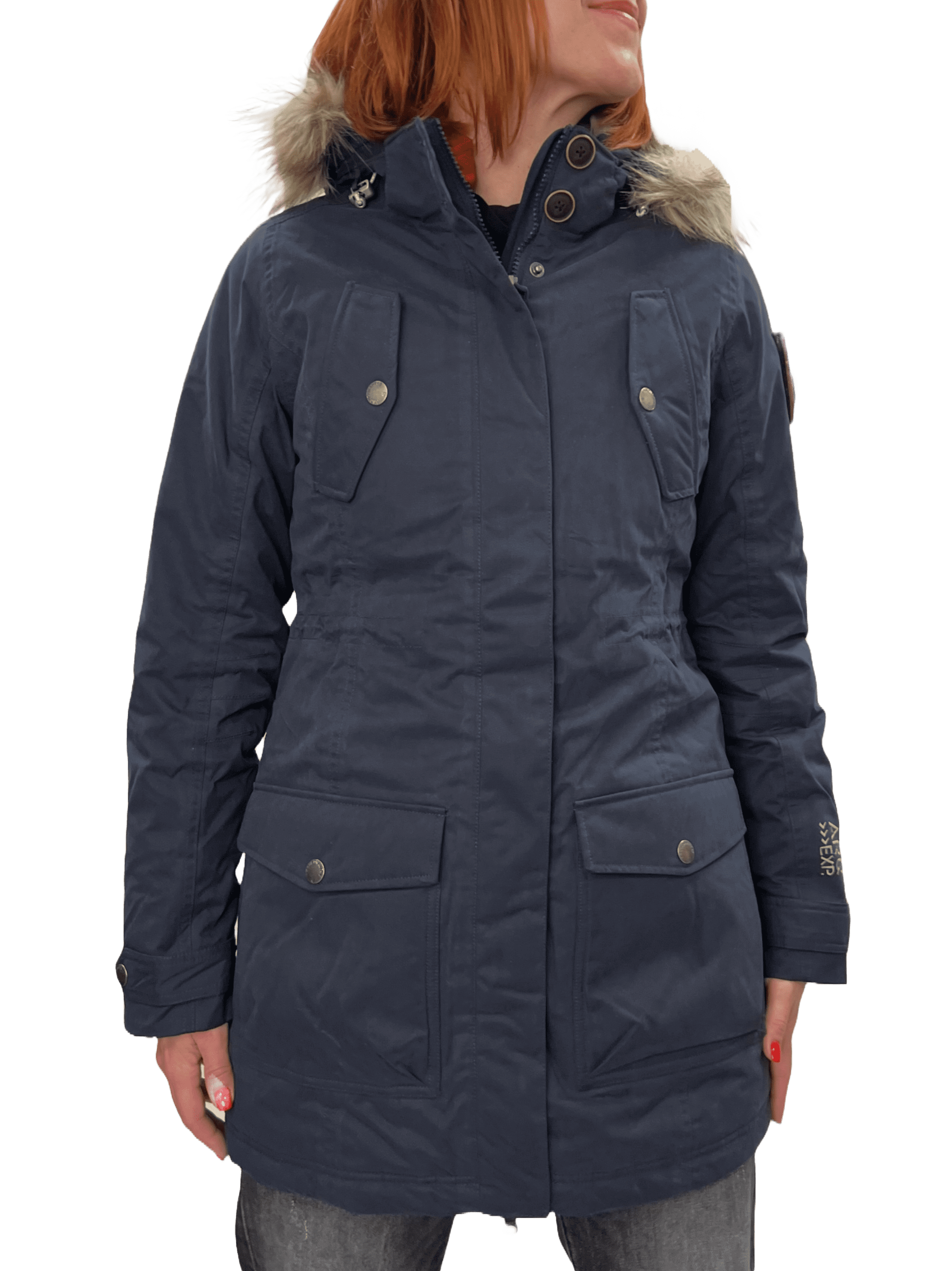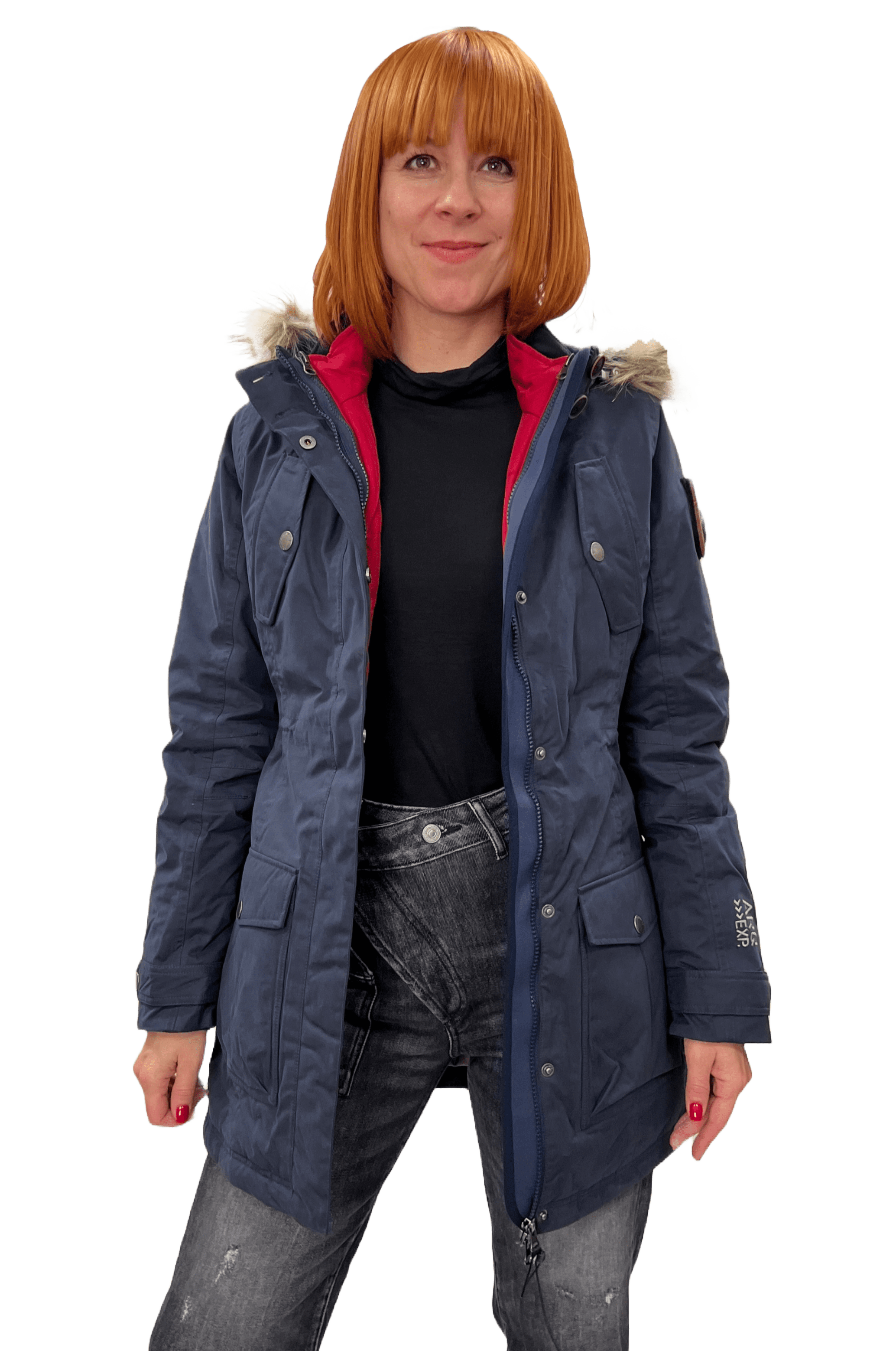 Damen Parka von Arqueonautas mit Kompass und kuscheligem Fellkragen und integrierter Weste.