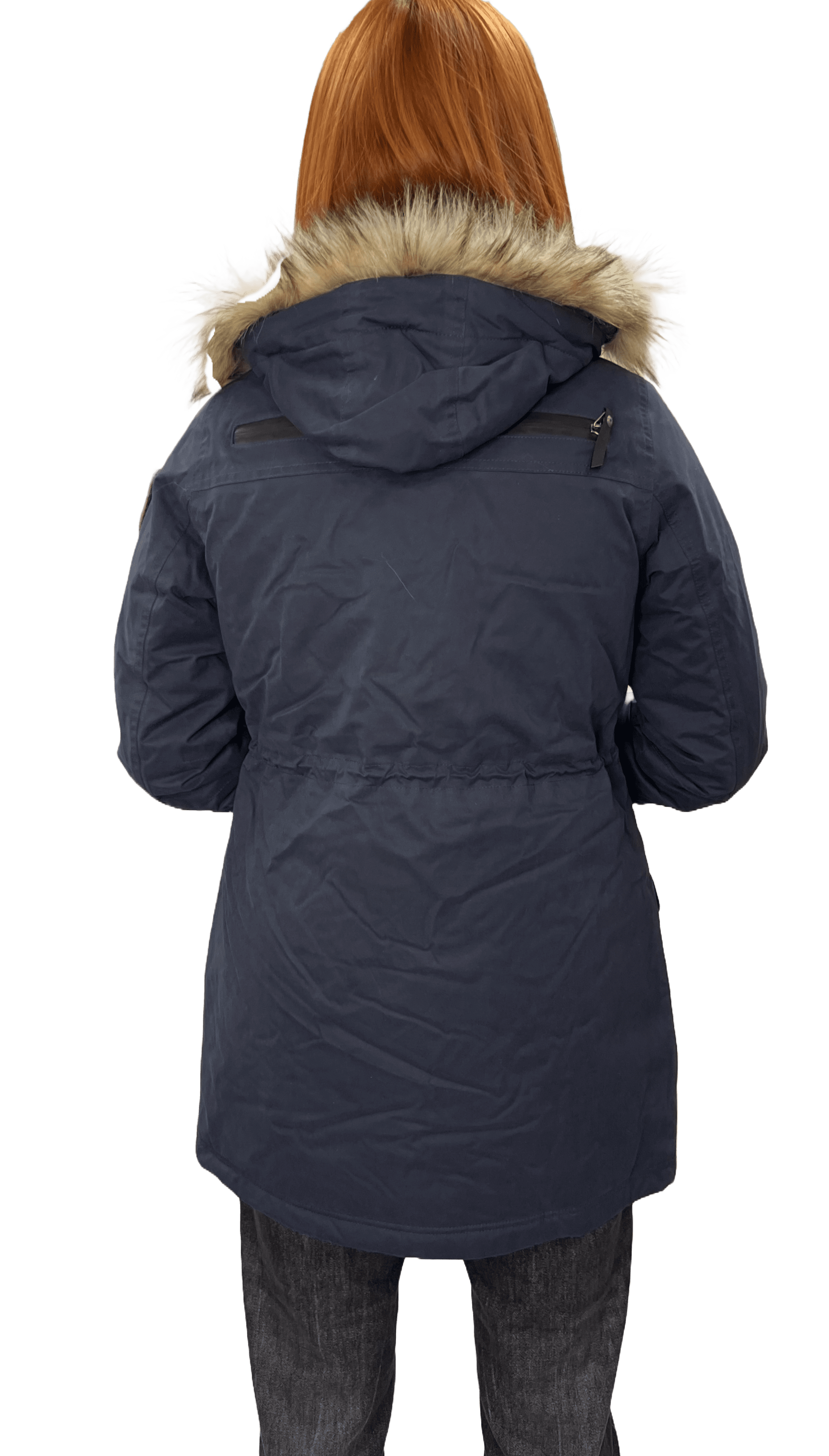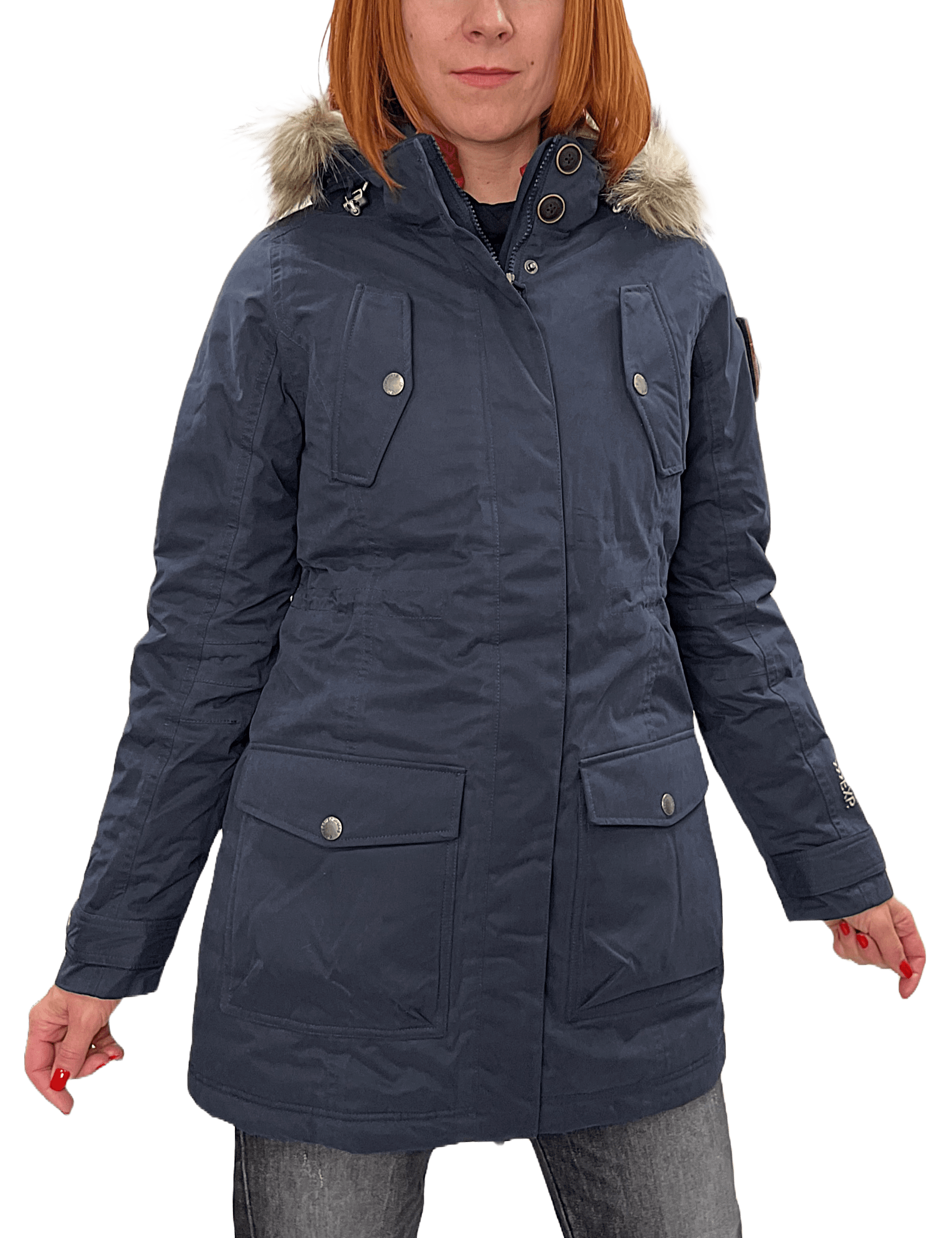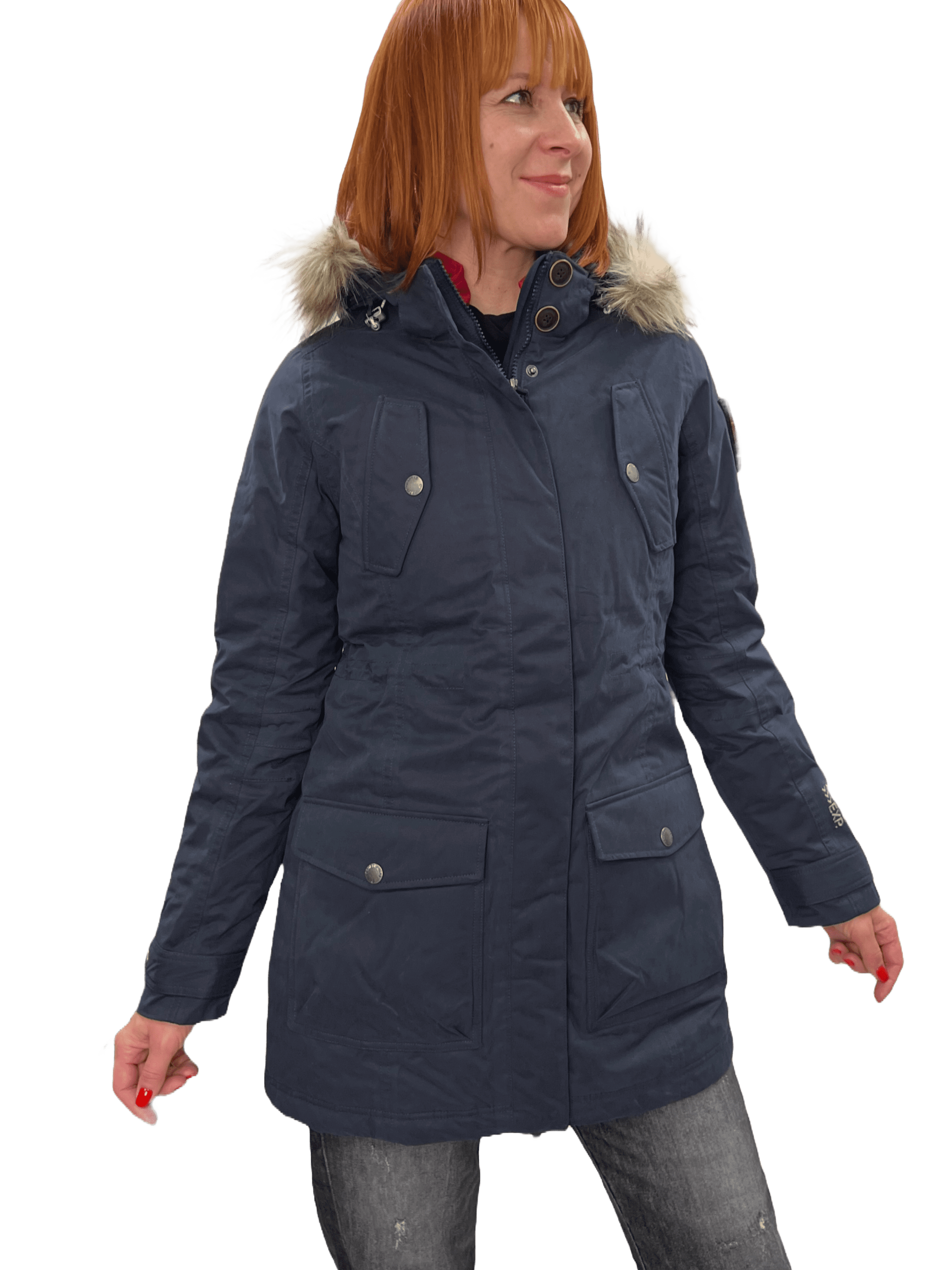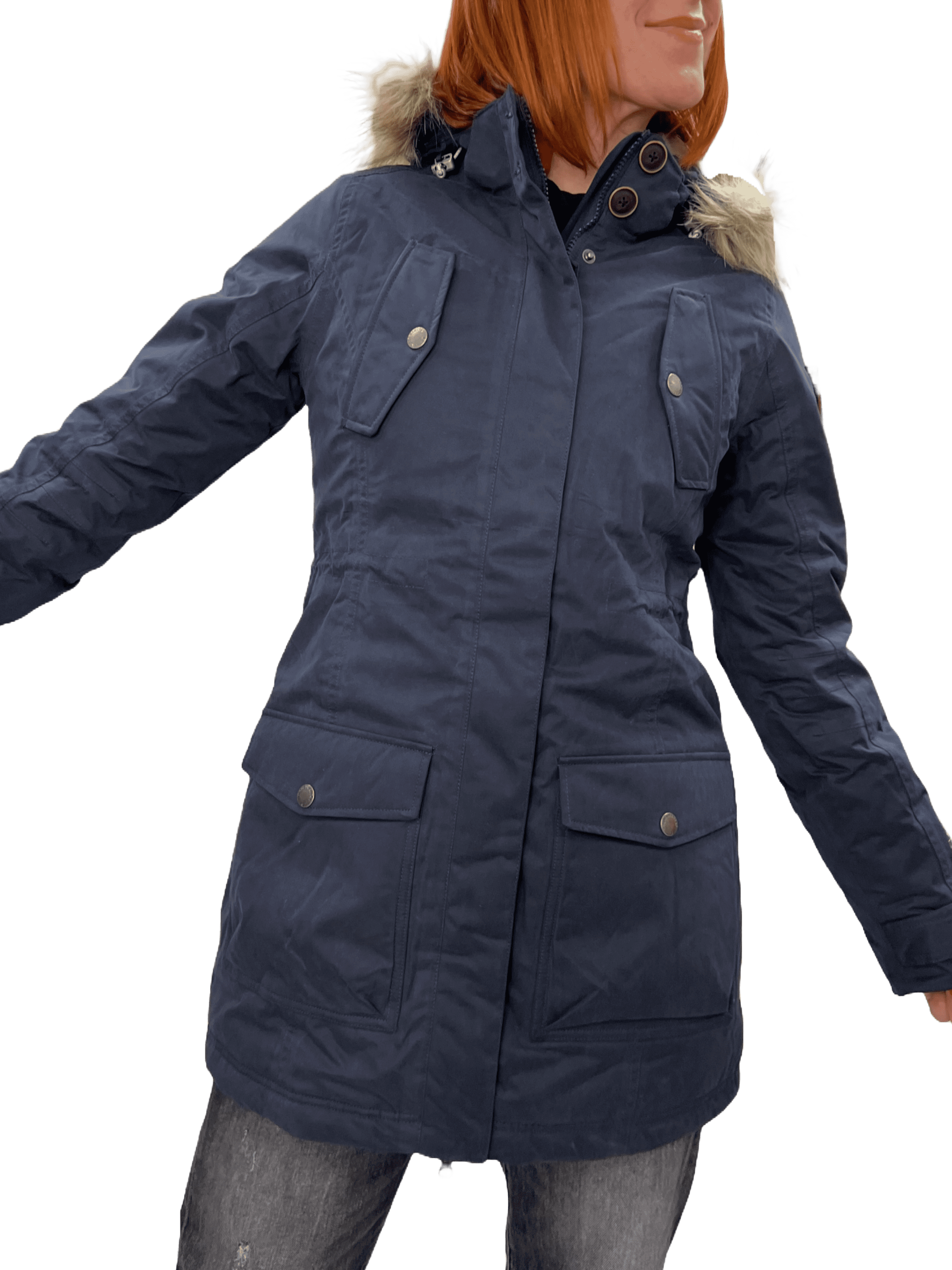 Damen Parka von Arqueonautas mit Kompass und kuscheligem Fellkragen und integrierter Weste.