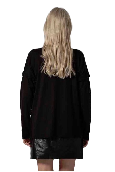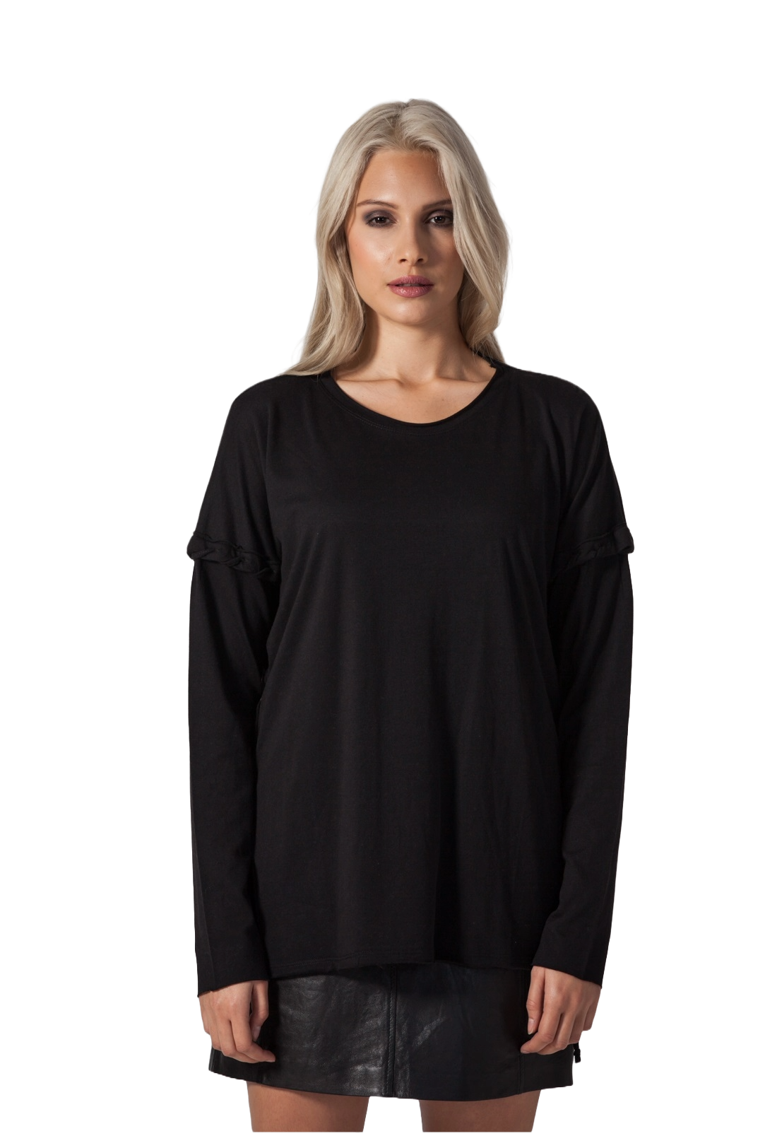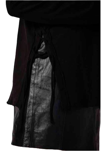 Dieses Shirt hat einen überlappten Saum als Ärmelansatz und seitlich durchgehende Schlitze, zum binden mit Kordelzügen.
