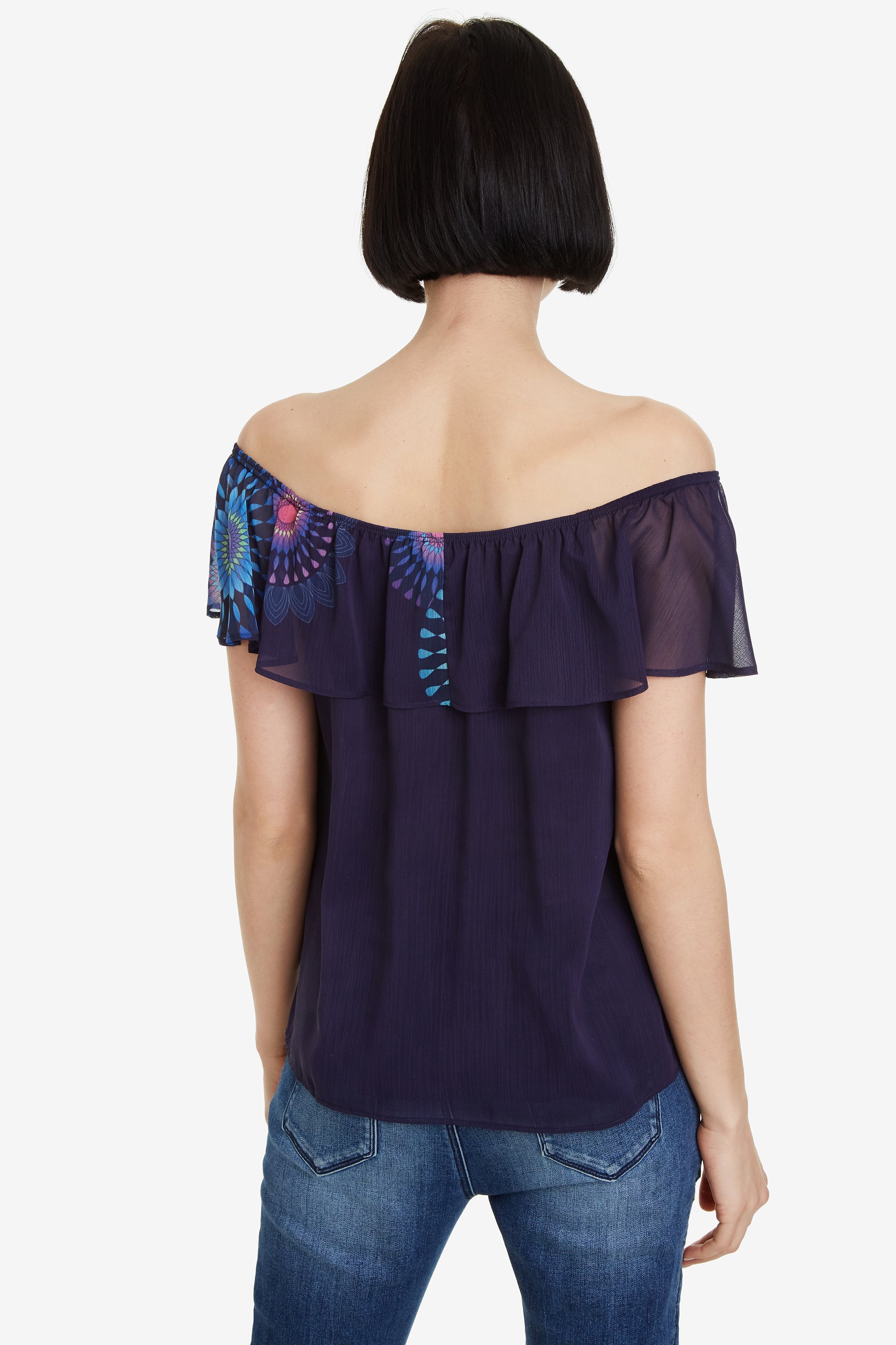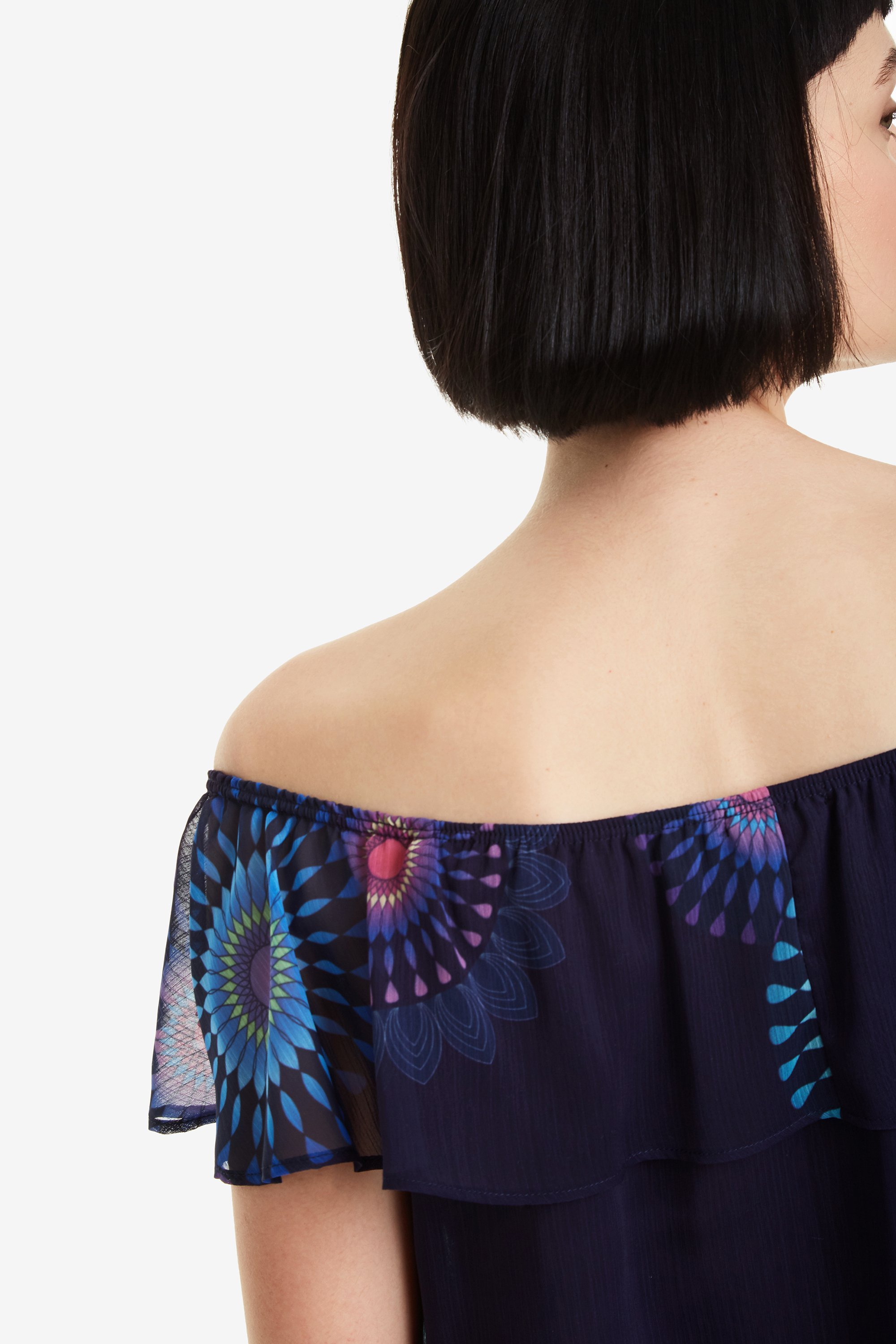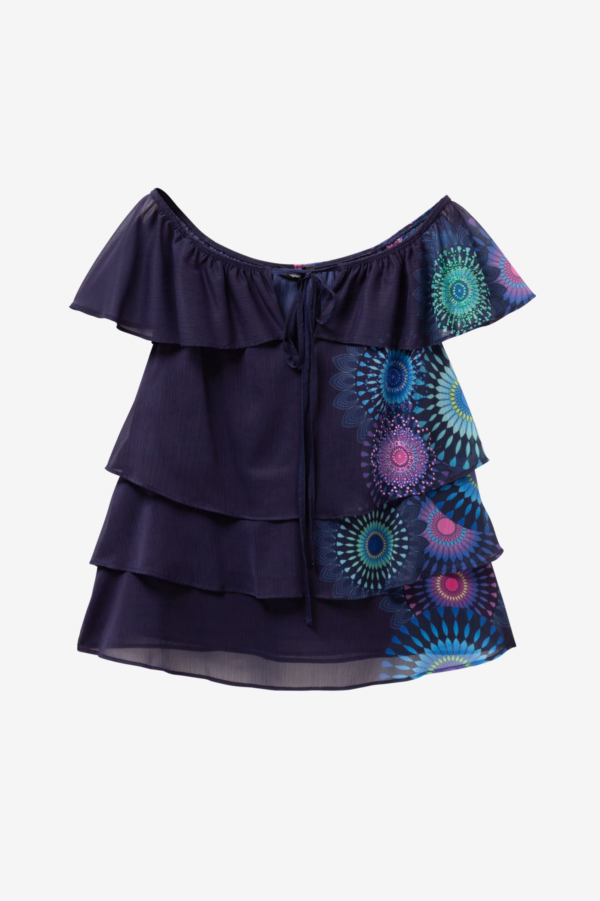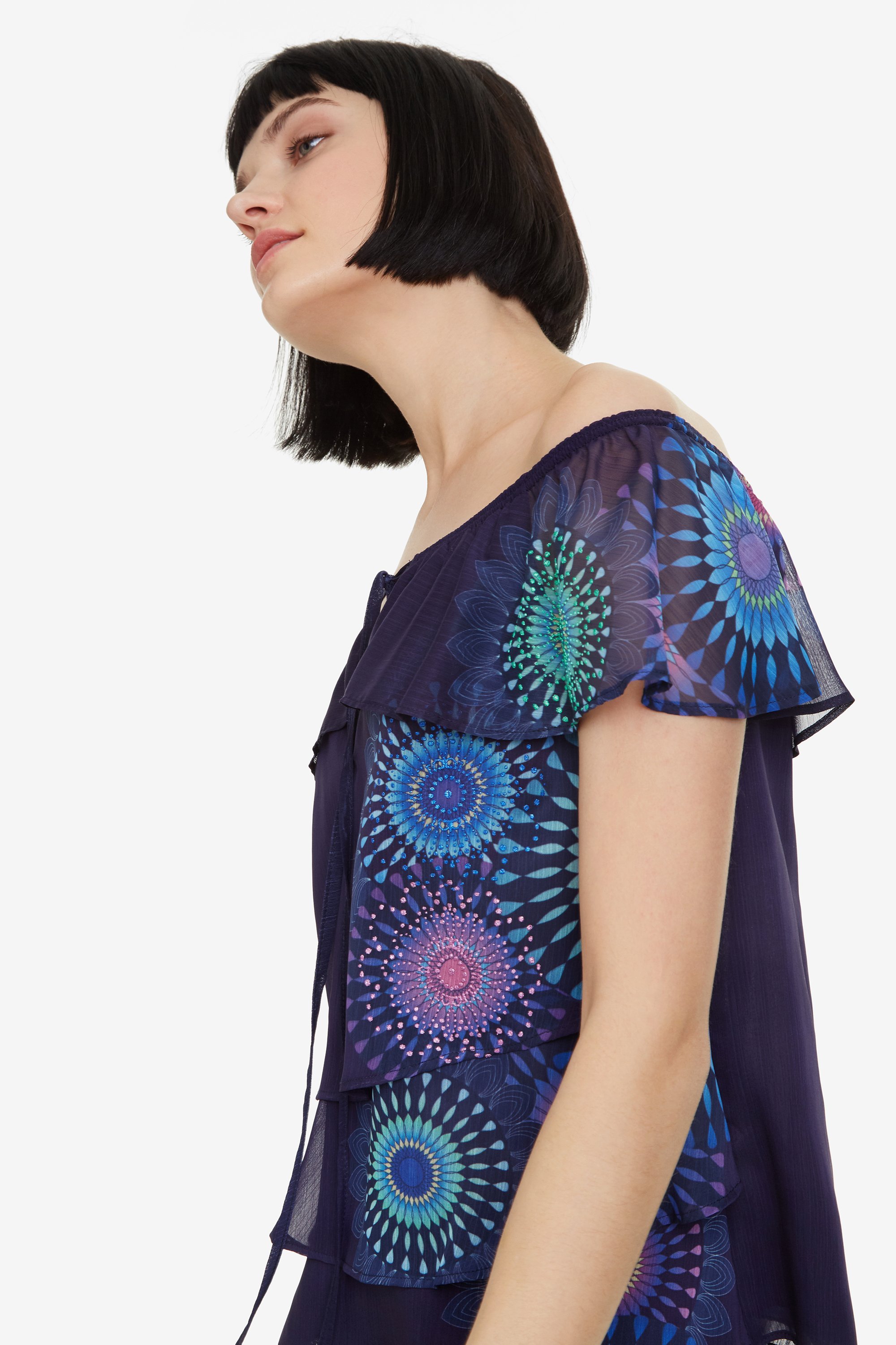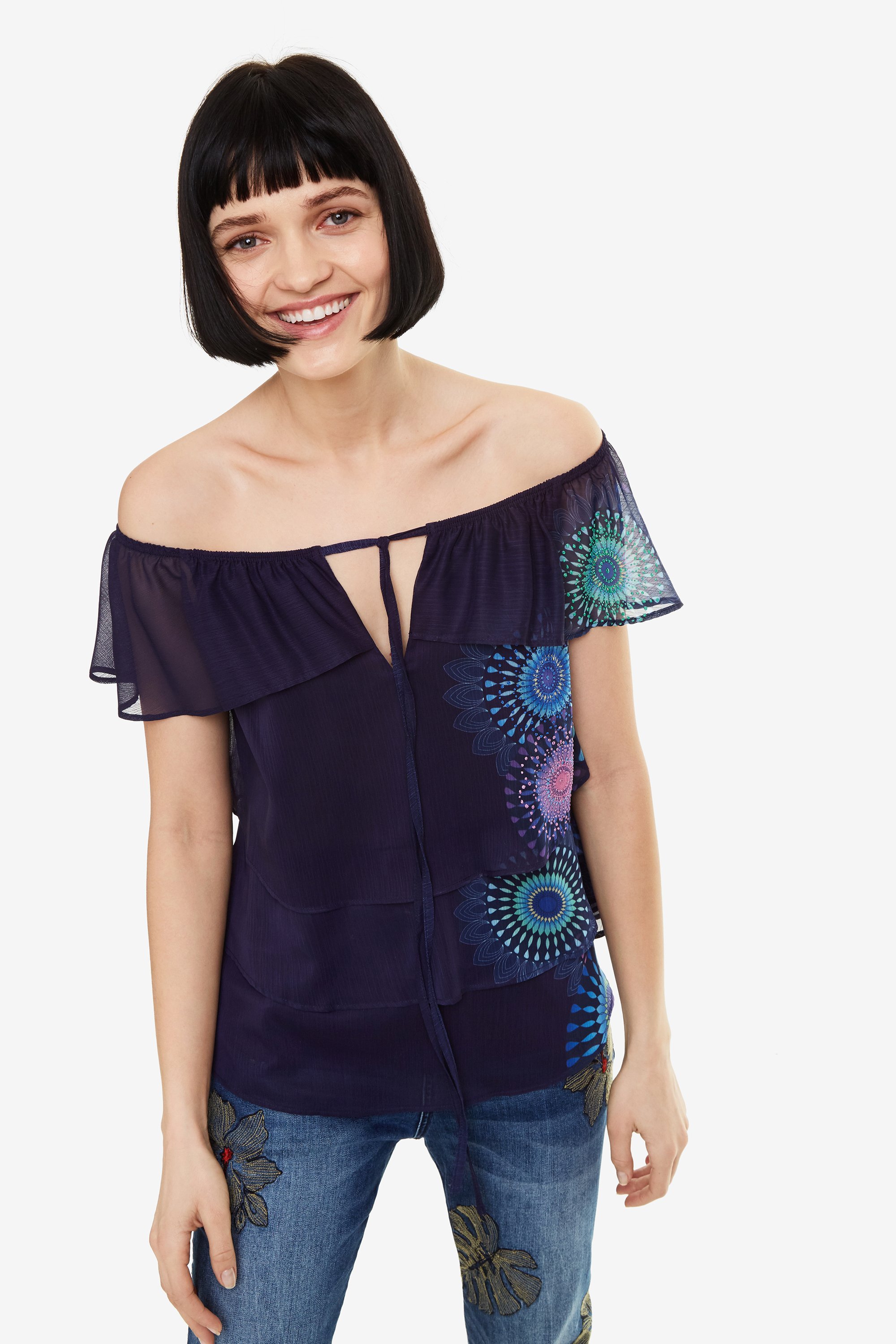 Claire ist eine Layering Bluse von Desigual. Ein Top aus mehreren Lagen, fließendem Stoff, Carmen Kragen mit verstellbarem Bündchen und bunten Mandalas. Summer Feeling pur!