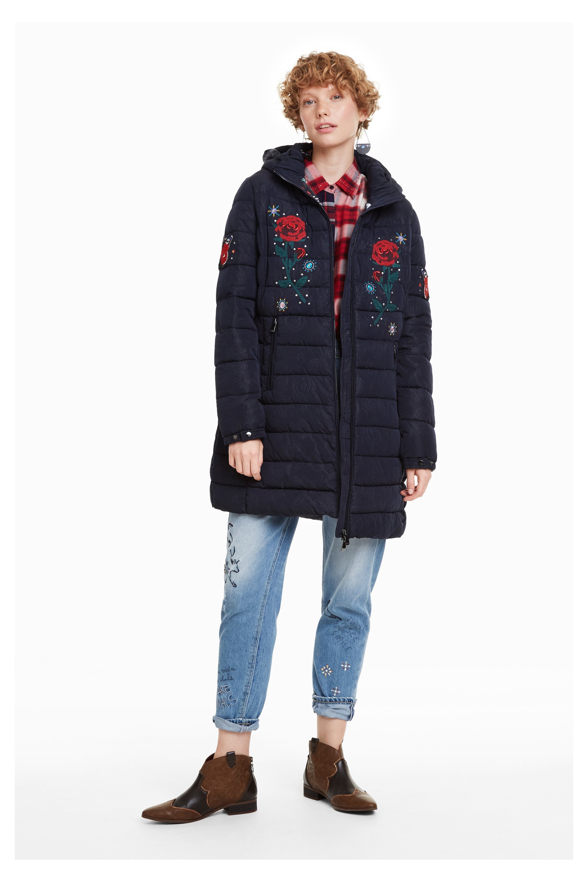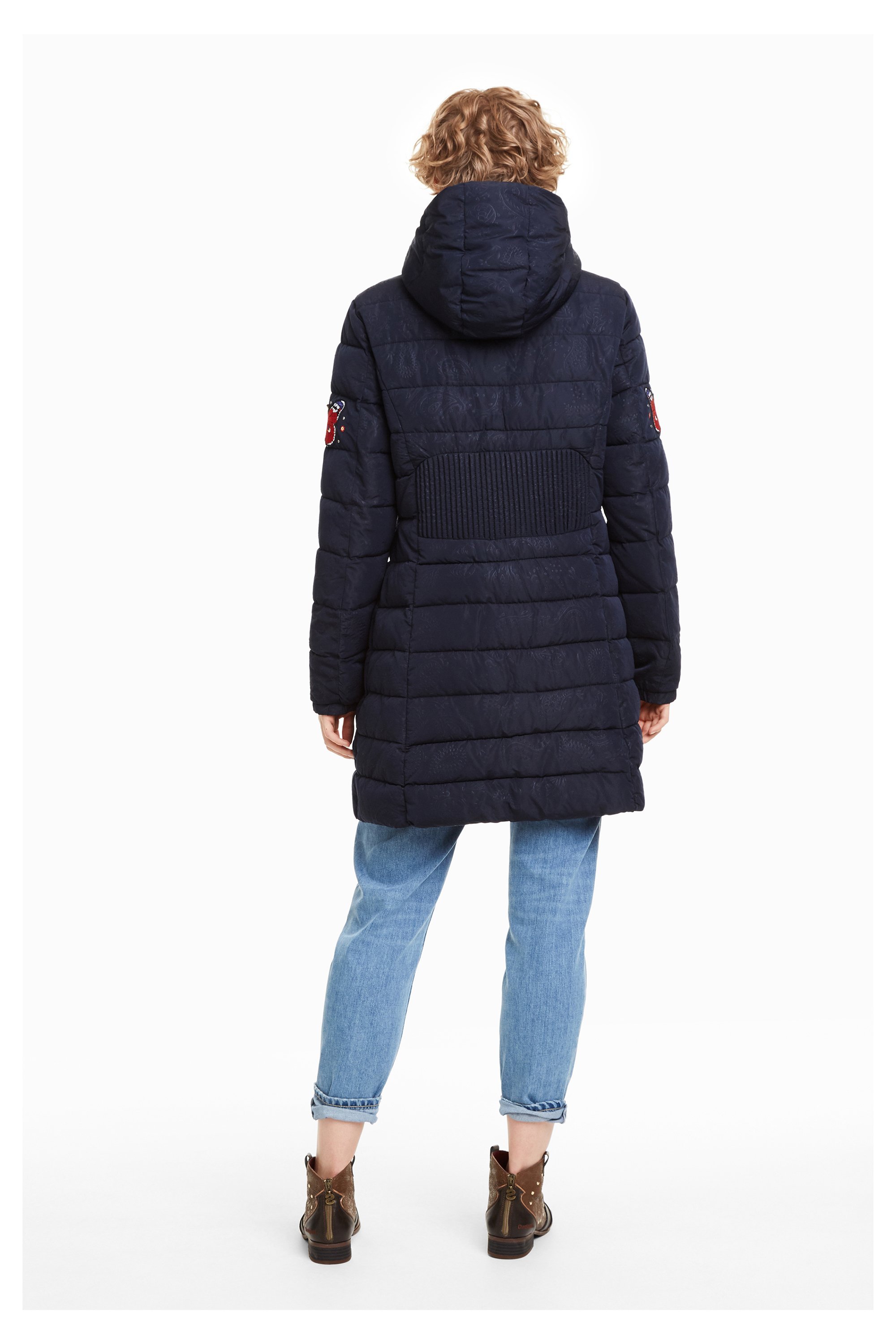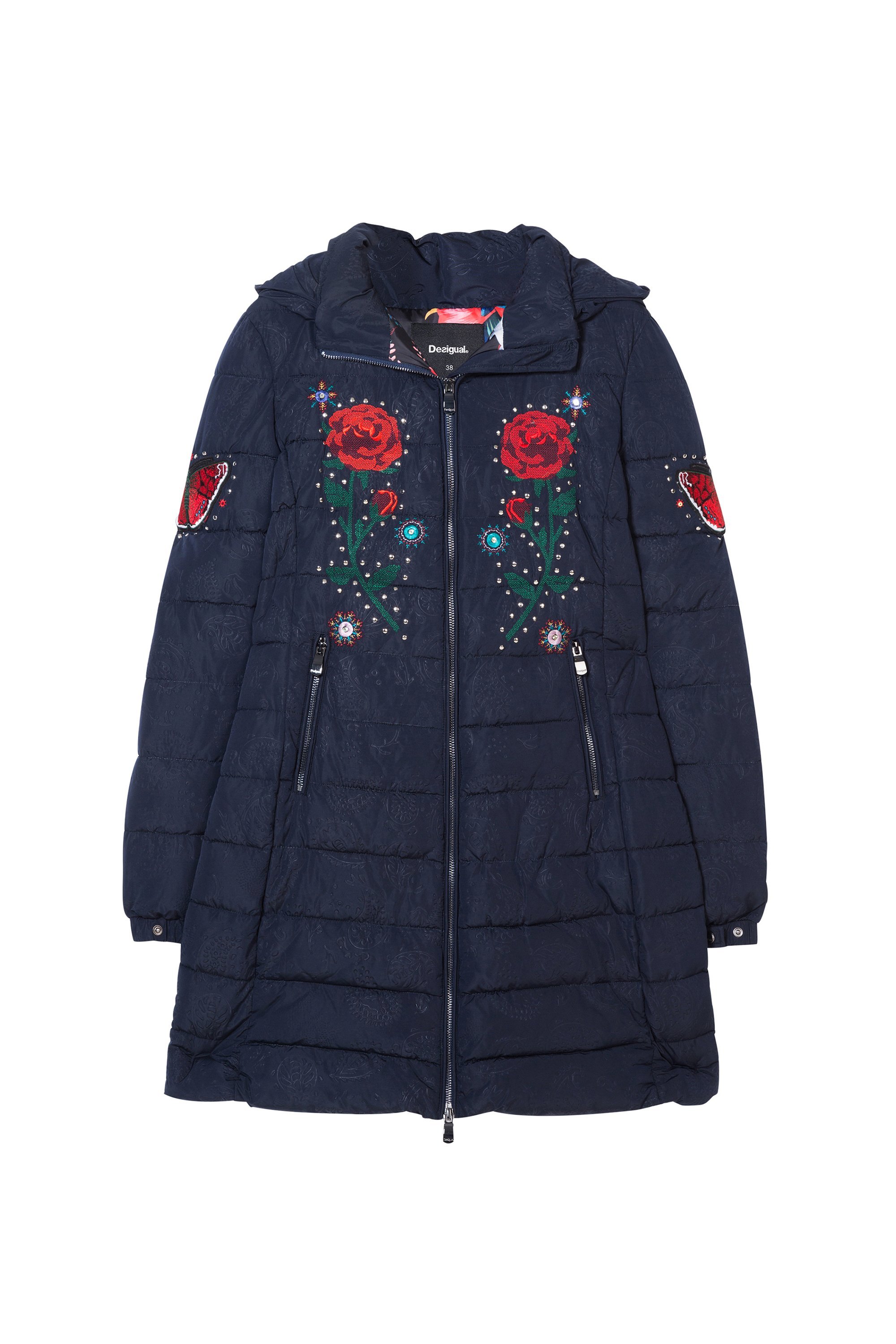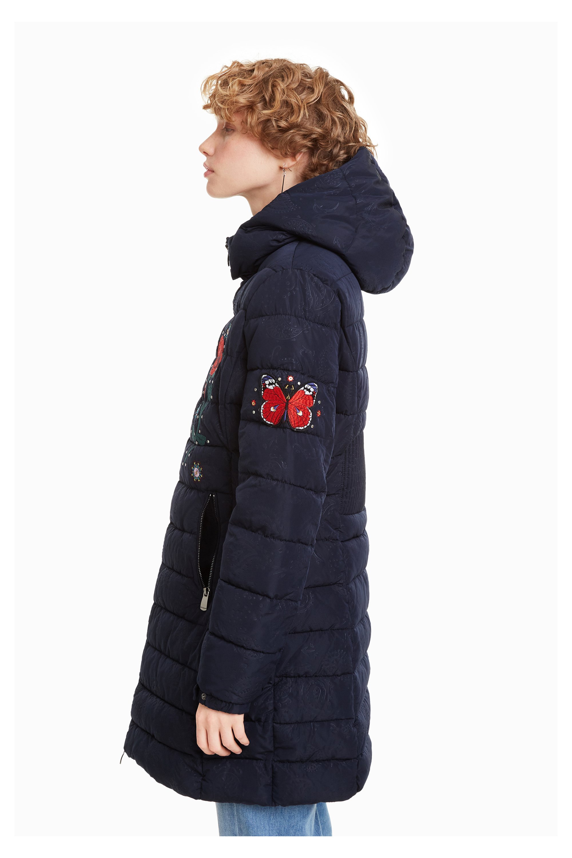 Warm, wattiert gefüttert ist der " Padded Flash " Wintermantel von Desigual. Eine Ton in Ton Pailey Prägung, Blumen und Schmetterlinge schmücken den Parka. Die Kaputze kann über einen Reißverschluss abgenommen werden und die seitlichen Taschen und die Jacke sind über einem Reißverschluss zu verschließen. Er ist schmal, tailiert geschnitten mit einer Verstärkung am Rücken.