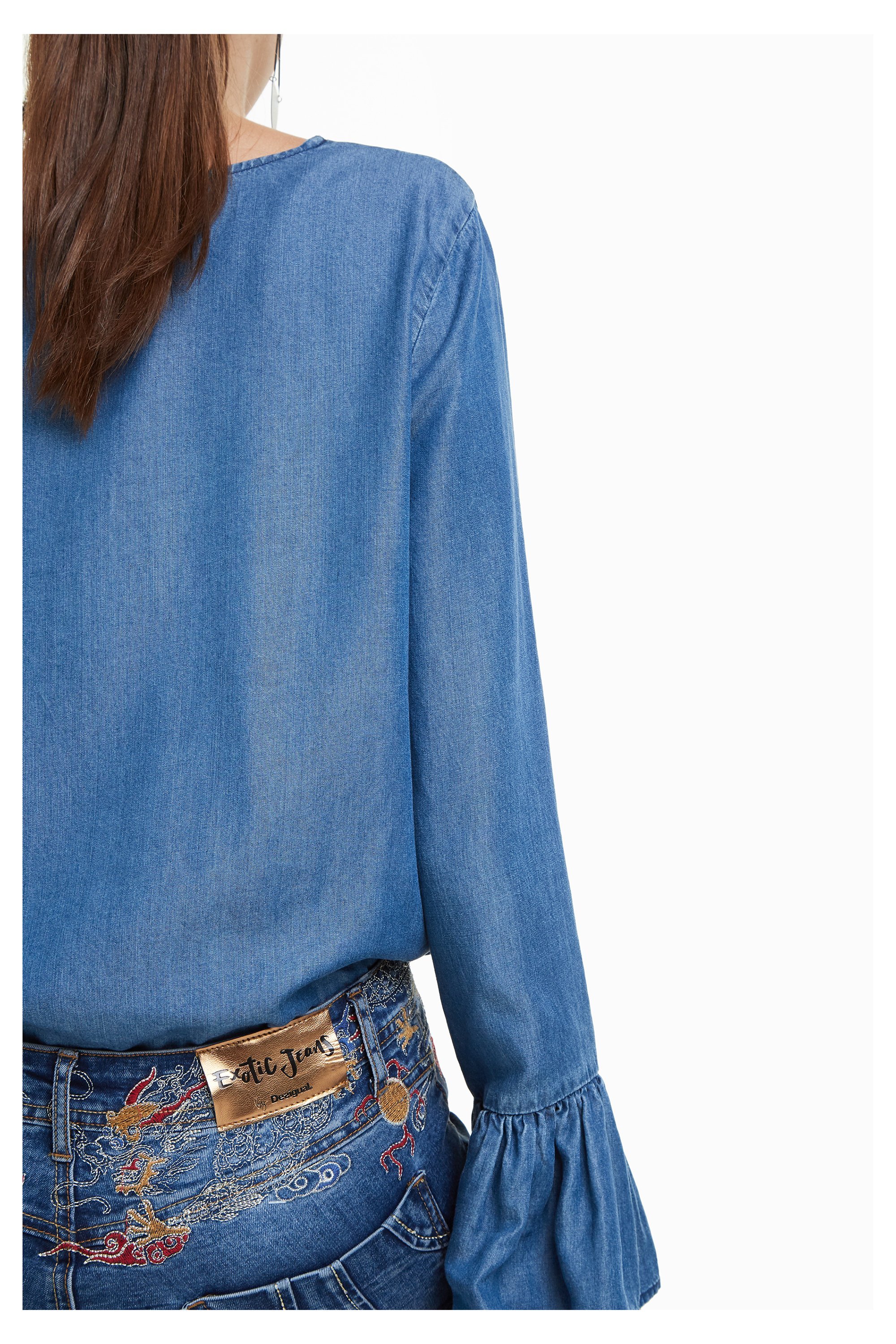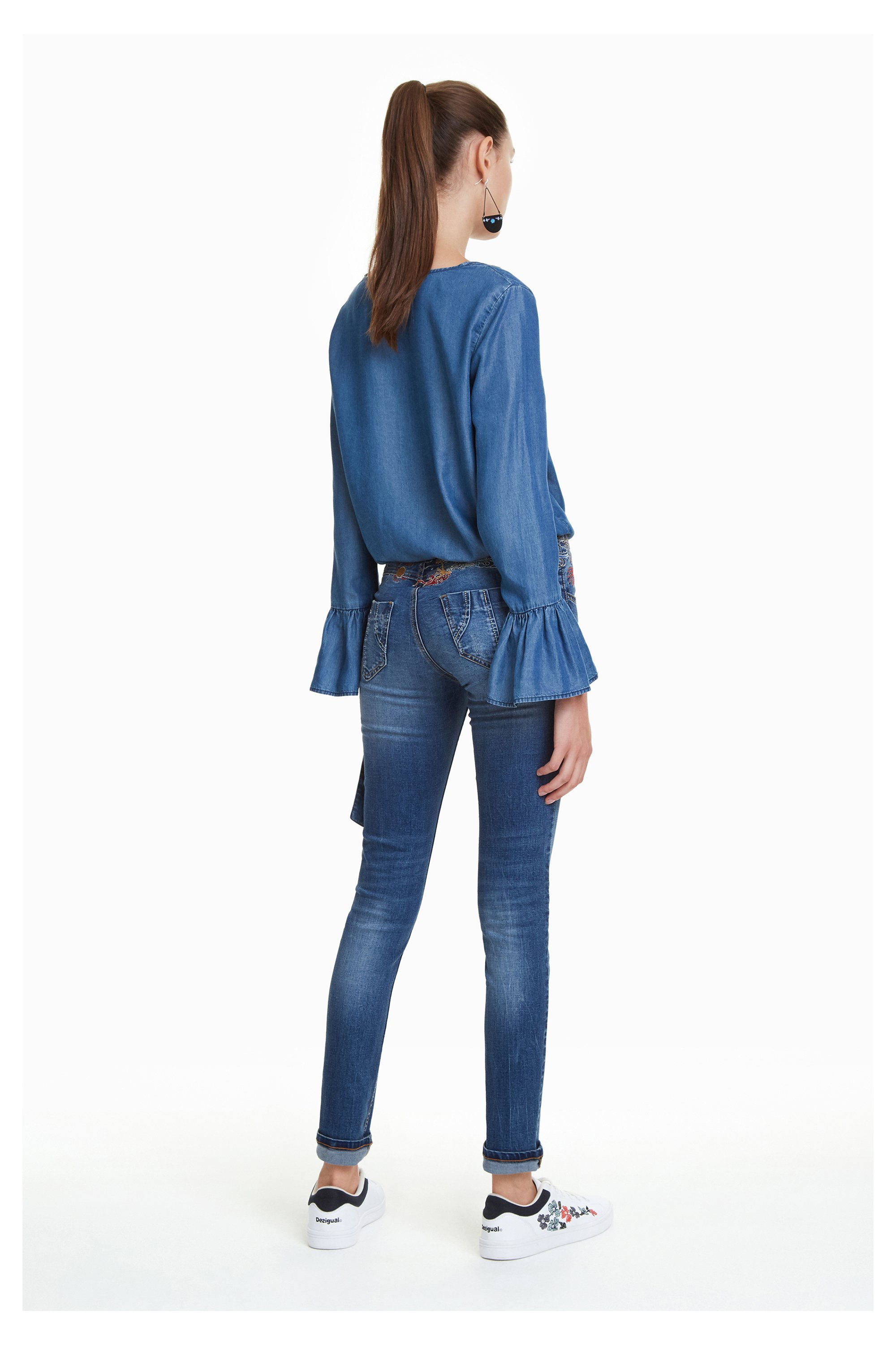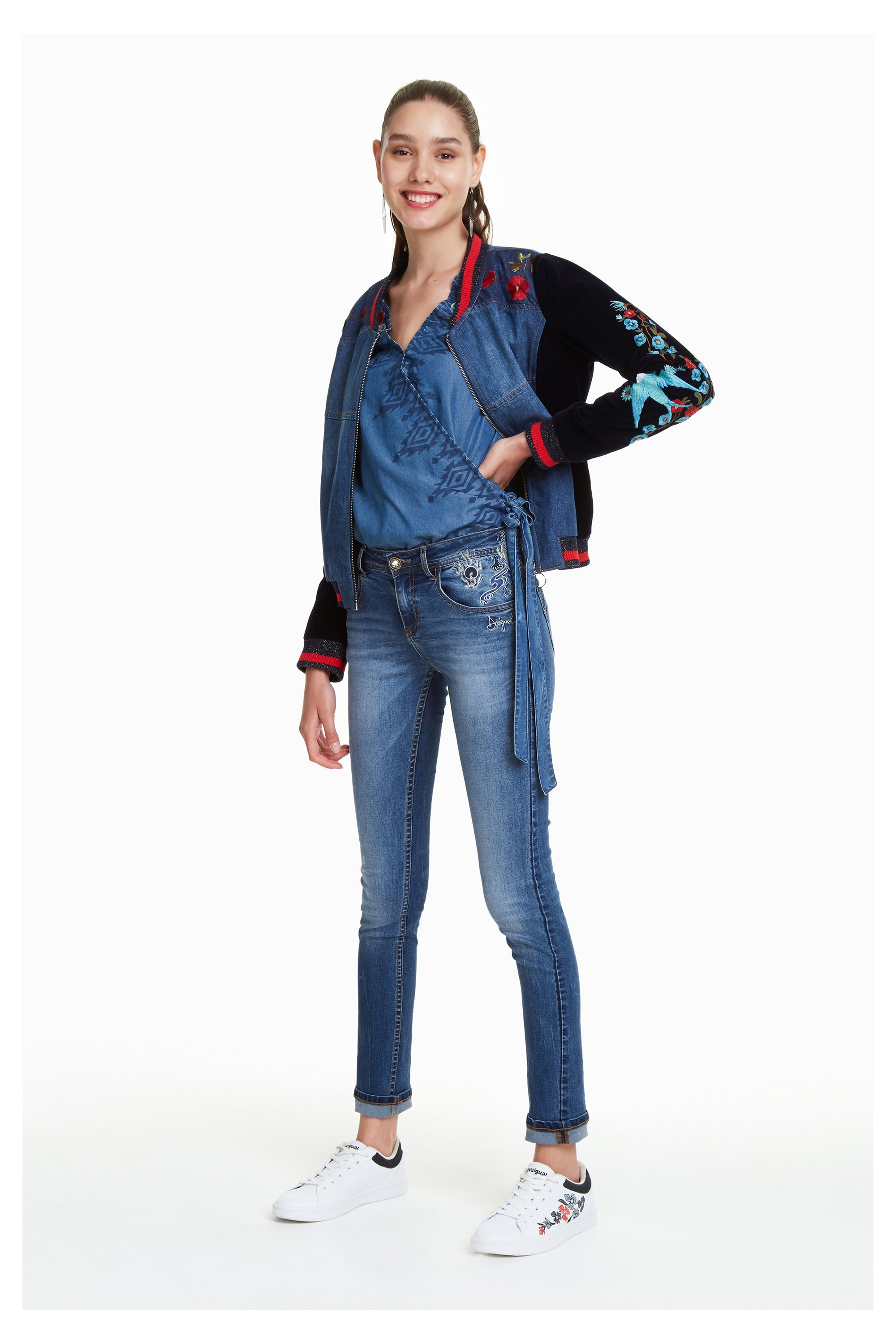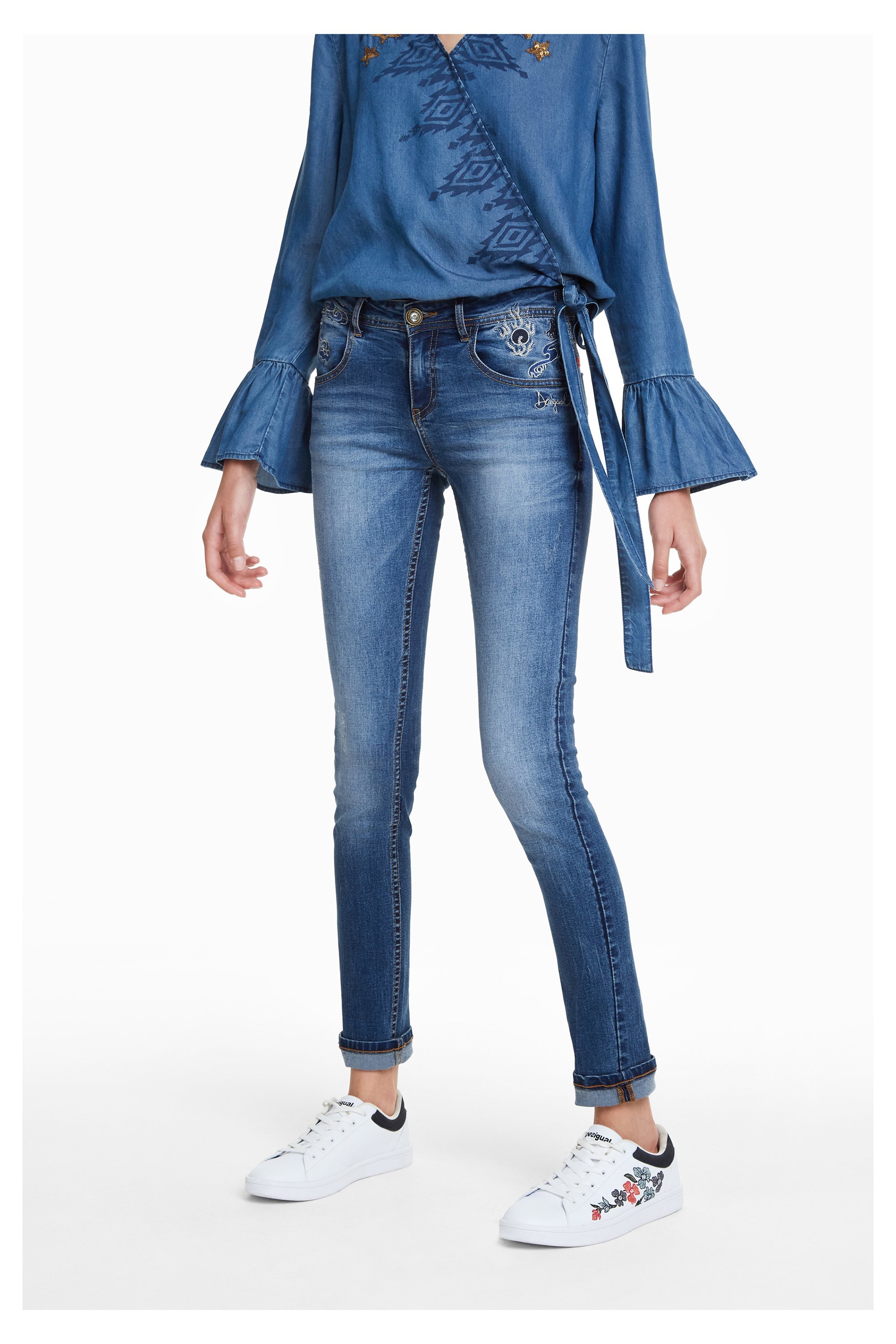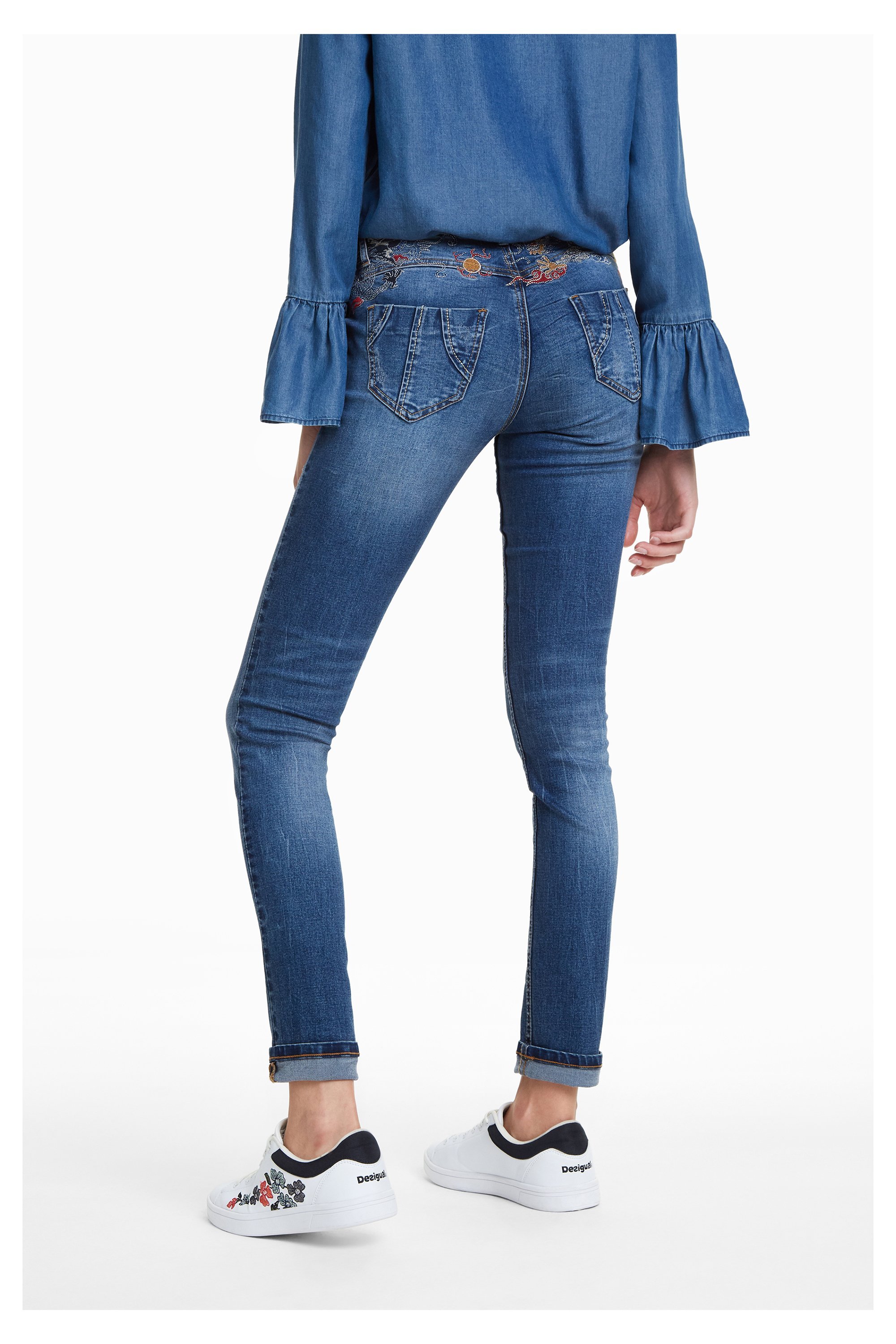 Refriposas von Desigual ist eine Jeans mit hübschen Stickereien um die Taille und am Bund. Sie macht eine schöne Form und ist ein sehr beliebtes Model unter den Denims von Desigual.