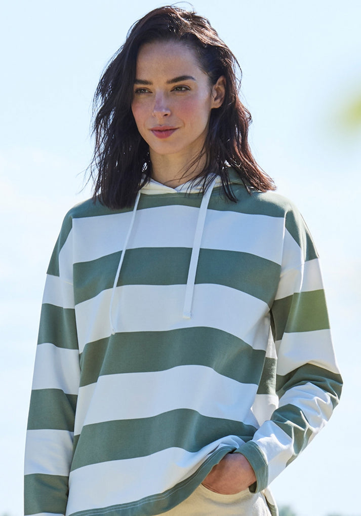 Der Damen Hoodie "Eydis" von Elbsand kombiniert Eleganz mit entspanntem Tragekomfort. Das leichte Streifendesign komplementiert das weiche Material und den lockeren Schnitt während dezente Logo-Details das Design abrunden.