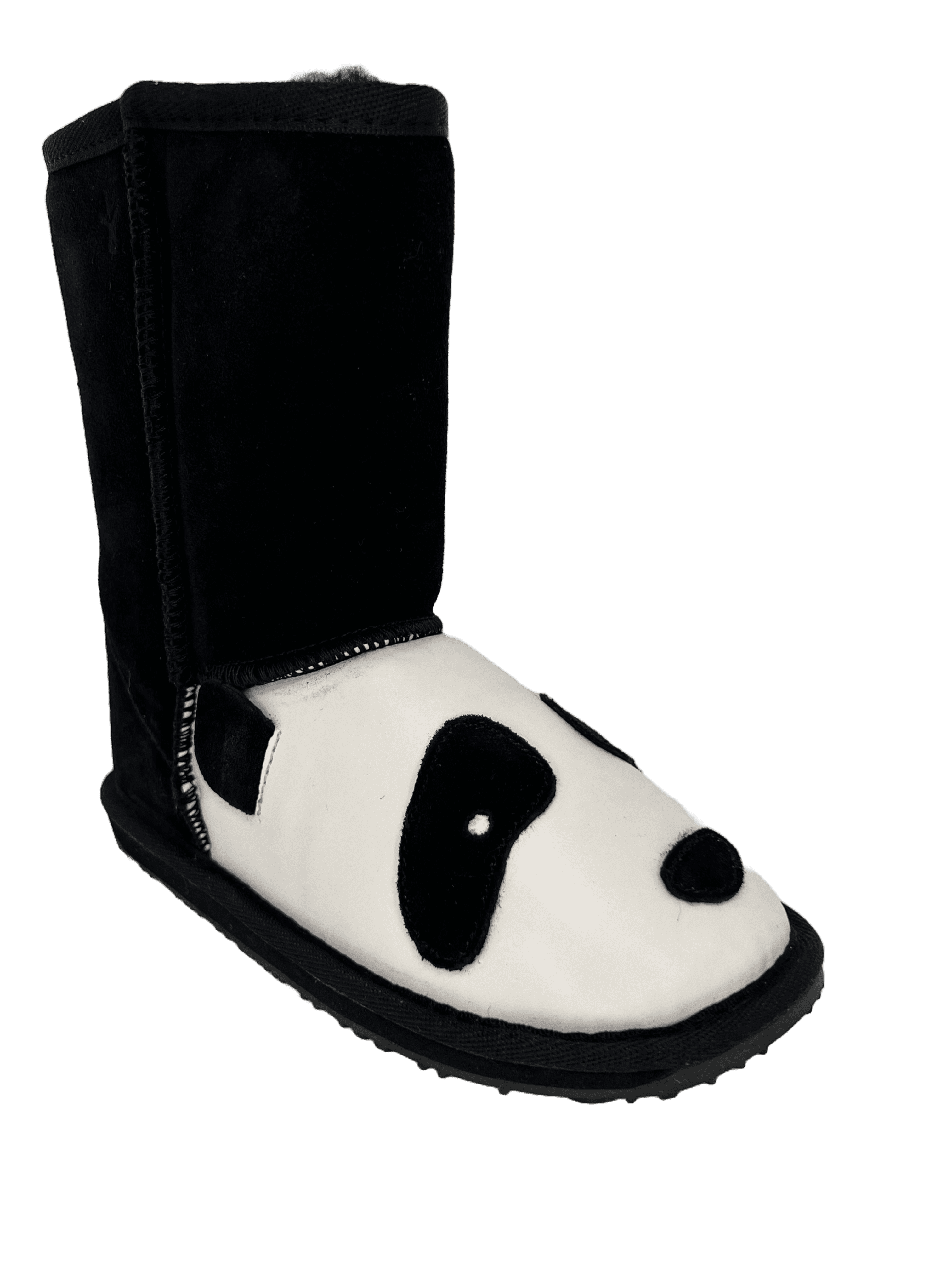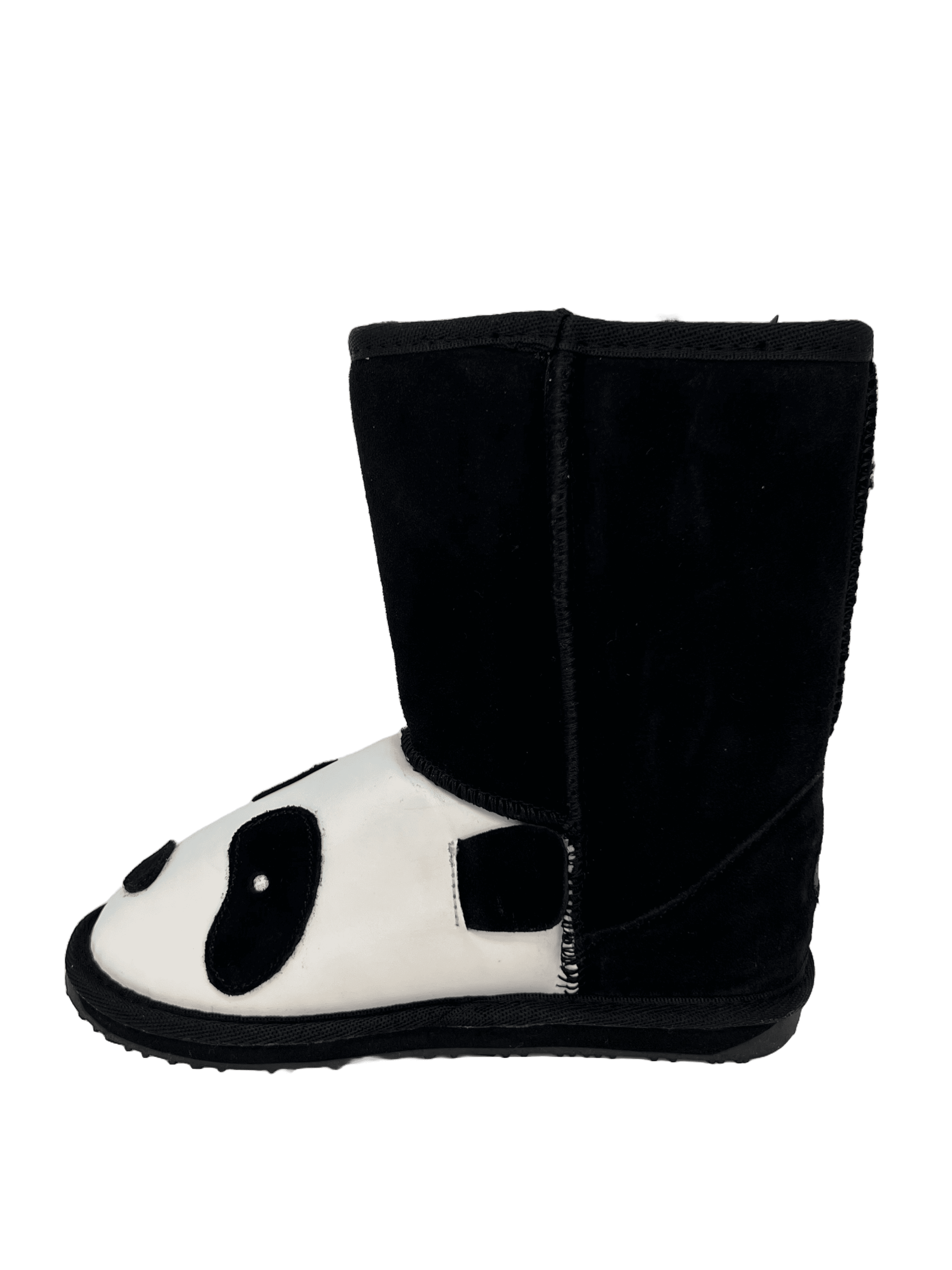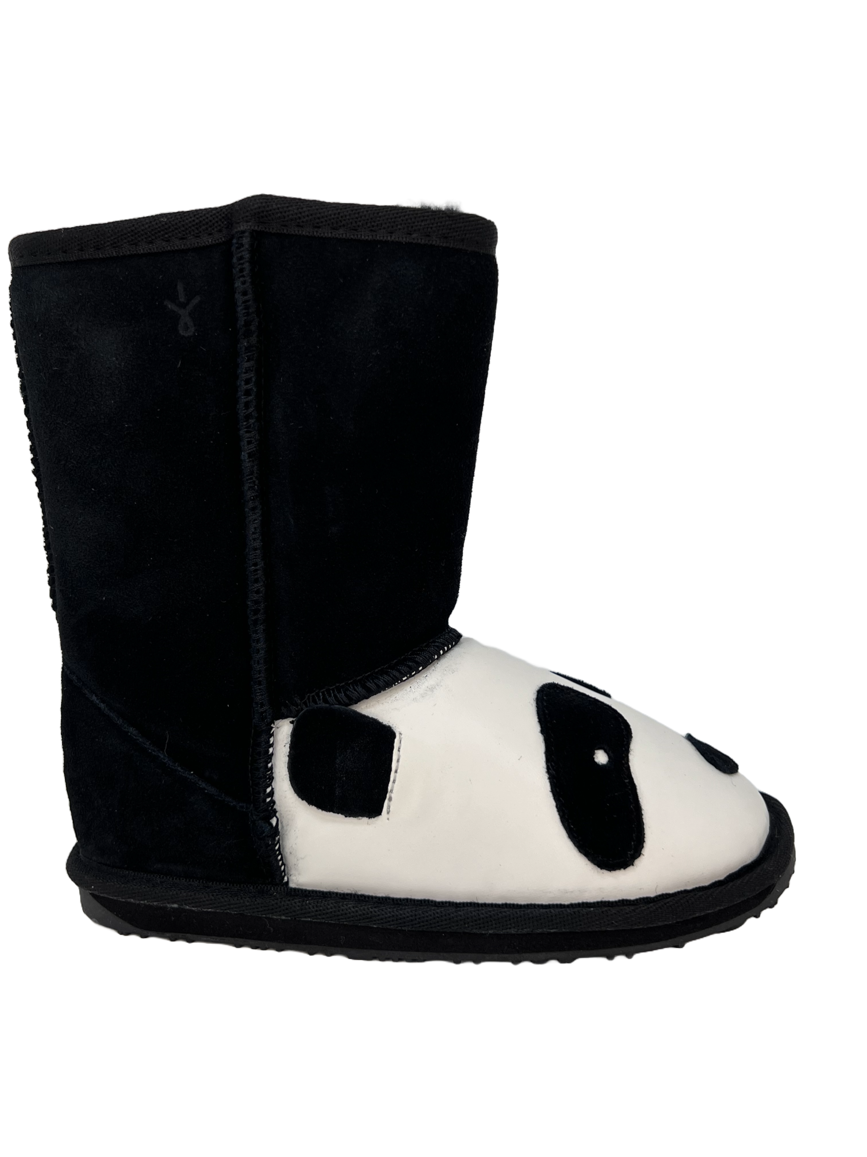 Süßer Kinder Stiefel "Little Creature Panda" von Emu. Während der Stiefel dank des hochwertigen Lammfells herrlich wärmt sieht er mit dem aufgenähtem Panda Gesicht super niedlich aus.