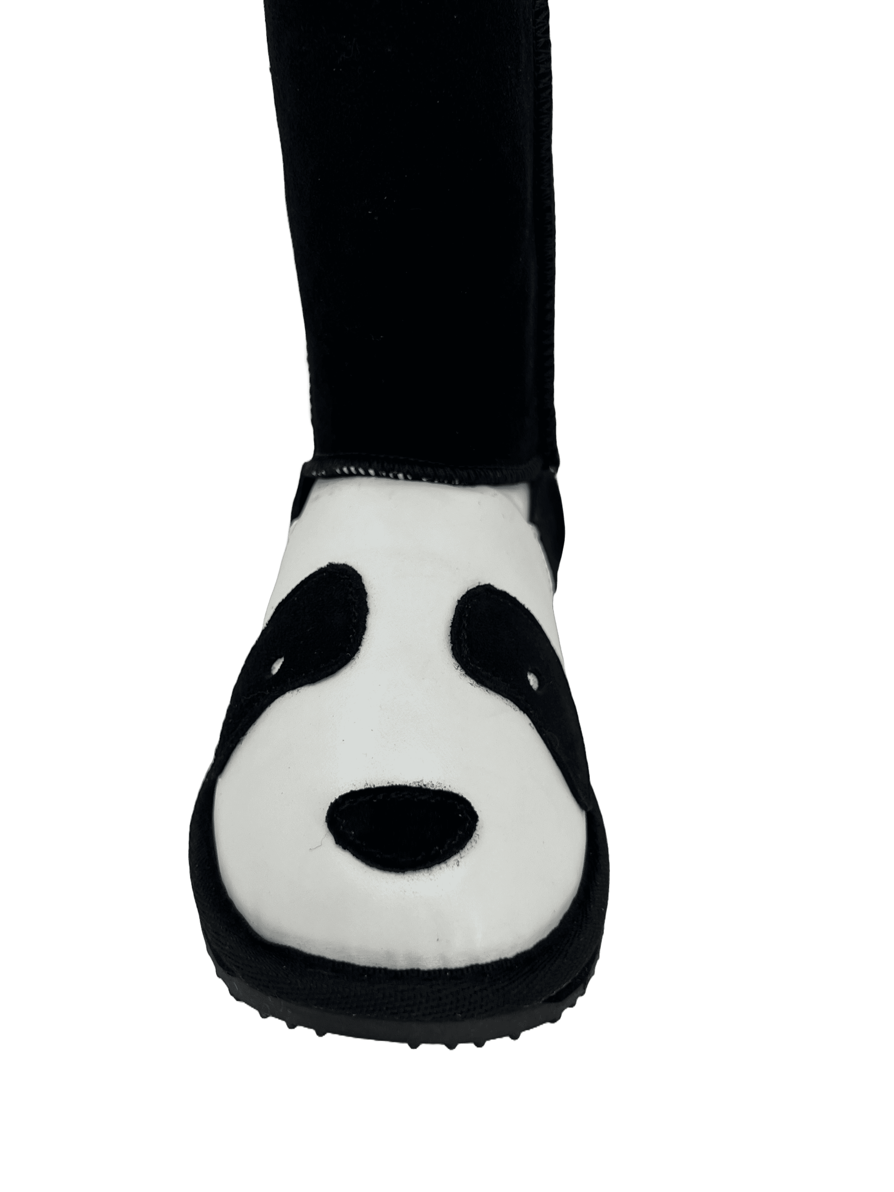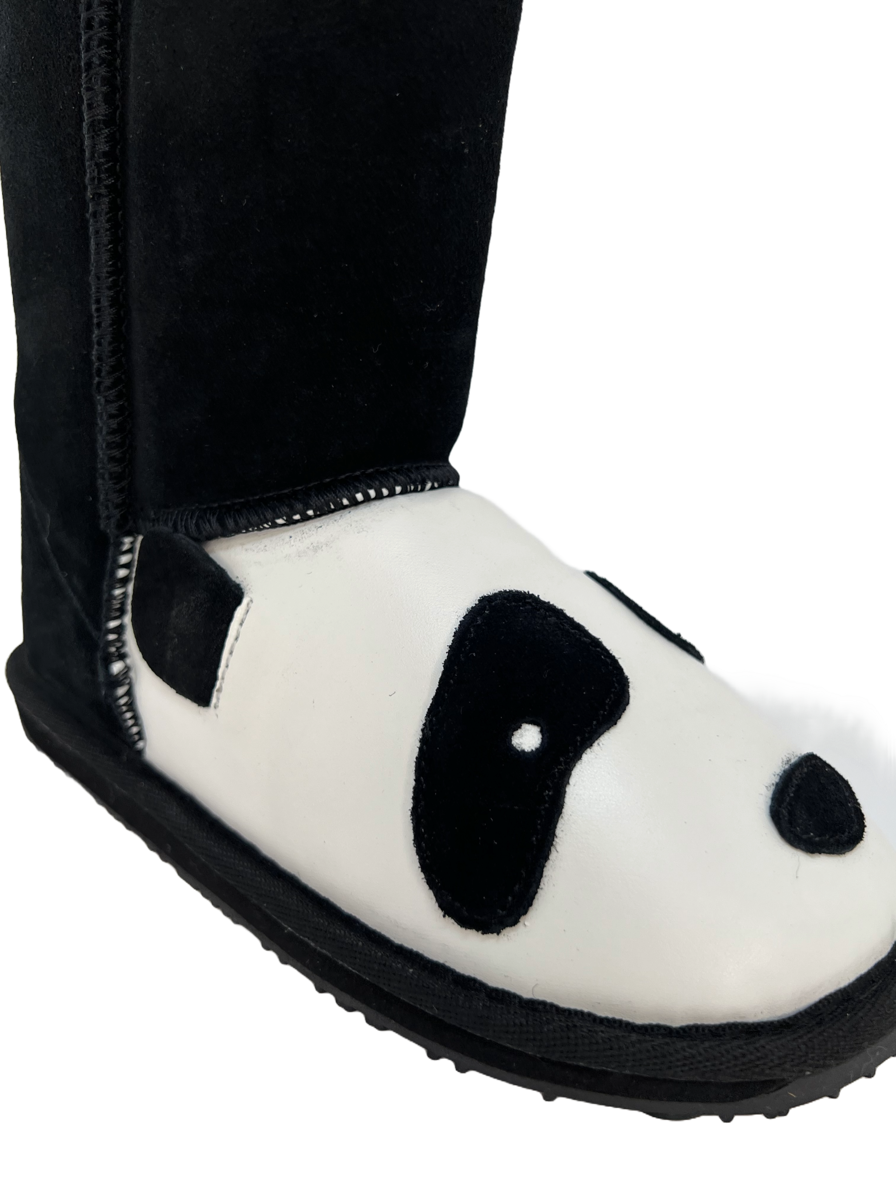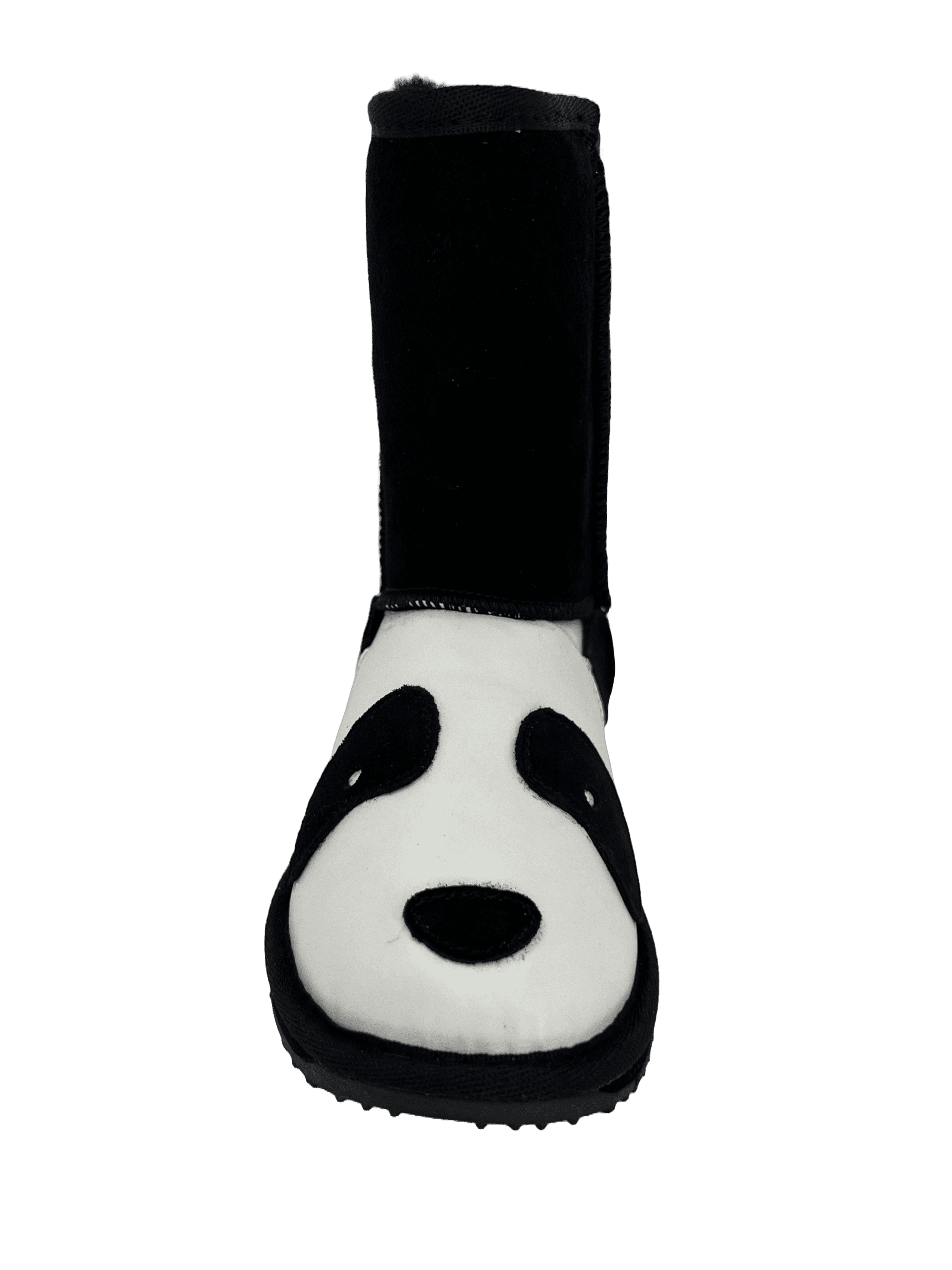 Süßer Kinder Stiefel "Little Creature Panda" von Emu. Während der Stiefel dank des hochwertigen Lammfells herrlich wärmt sieht er mit dem aufgenähtem Panda Gesicht super niedlich aus.