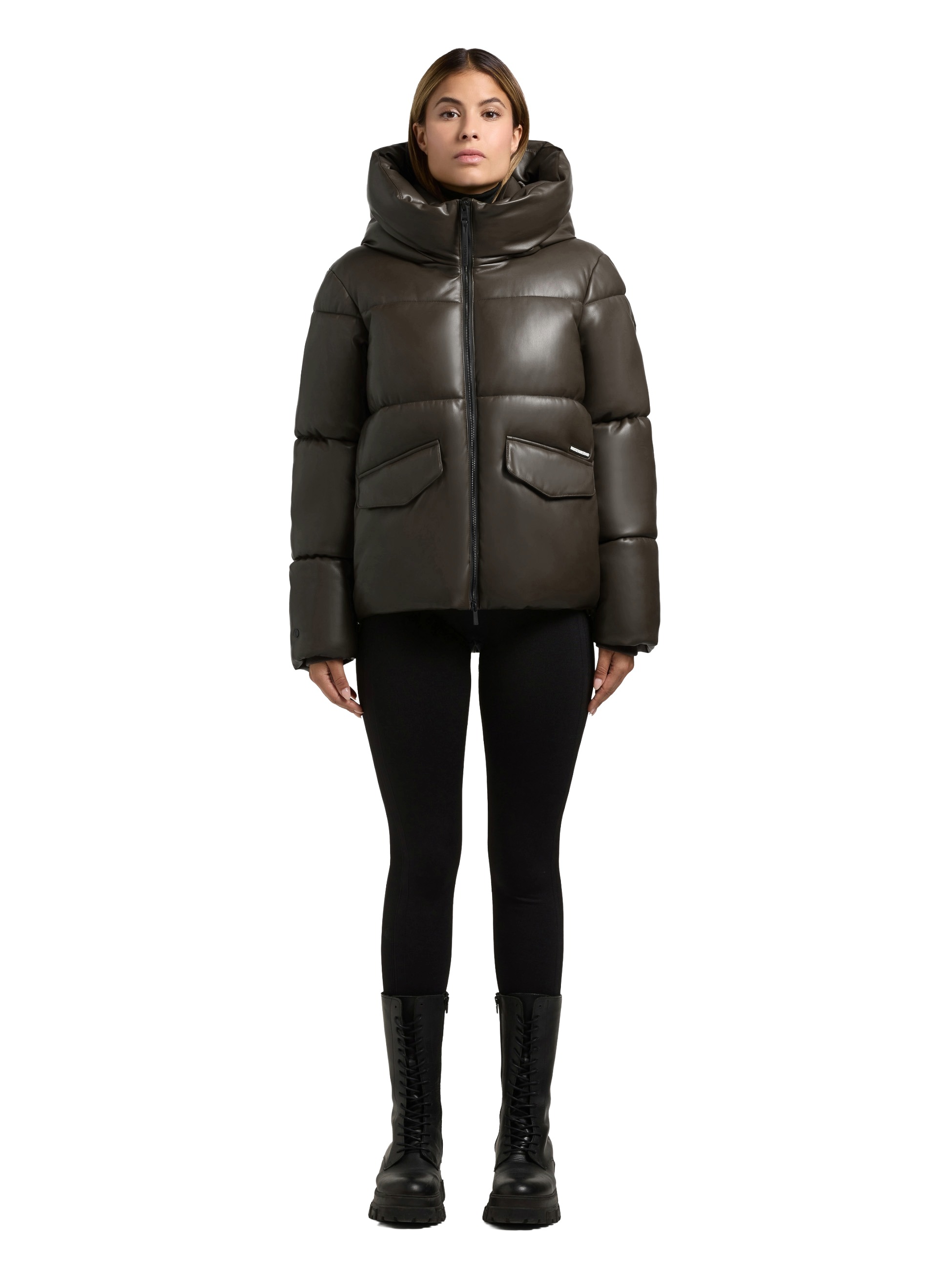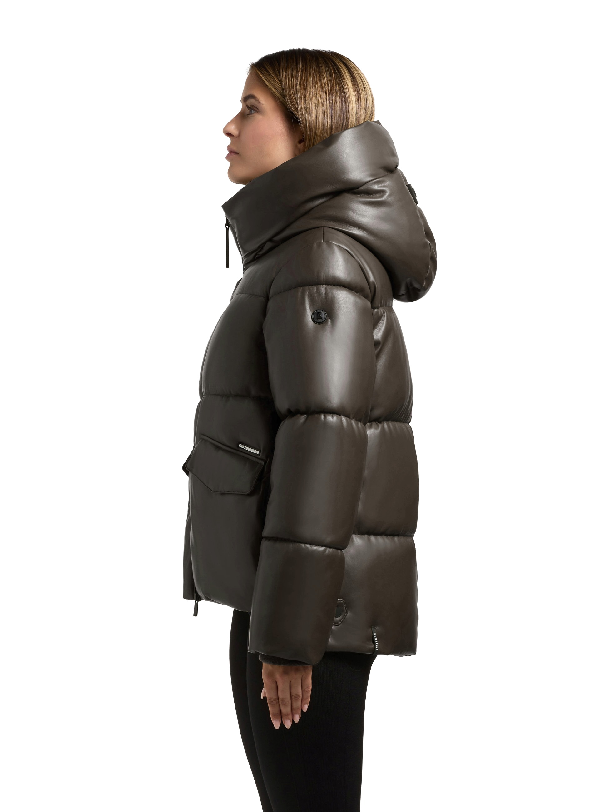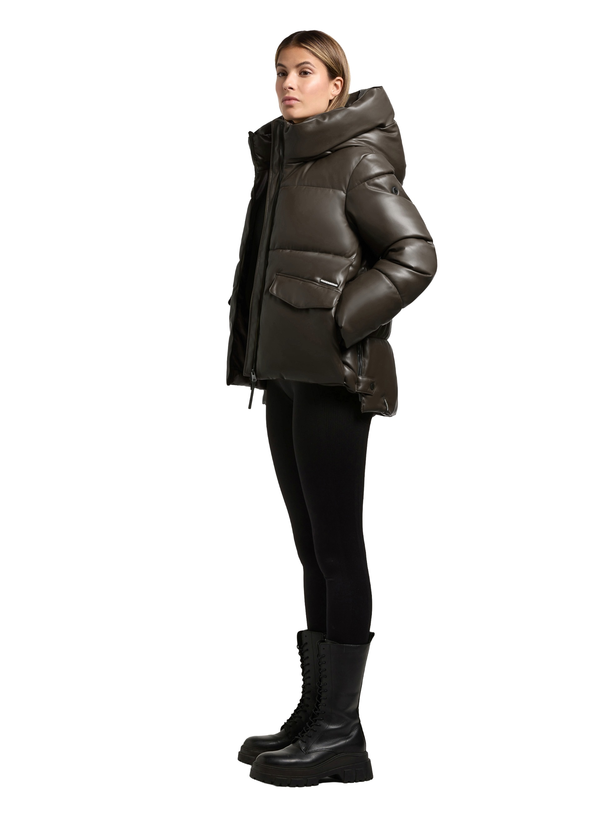 Mit einem wasserabweisenden Obermaterial in Lederoptik, großer Kapuze mit abgesteppter Krempe und verlängertem Rückenteil.