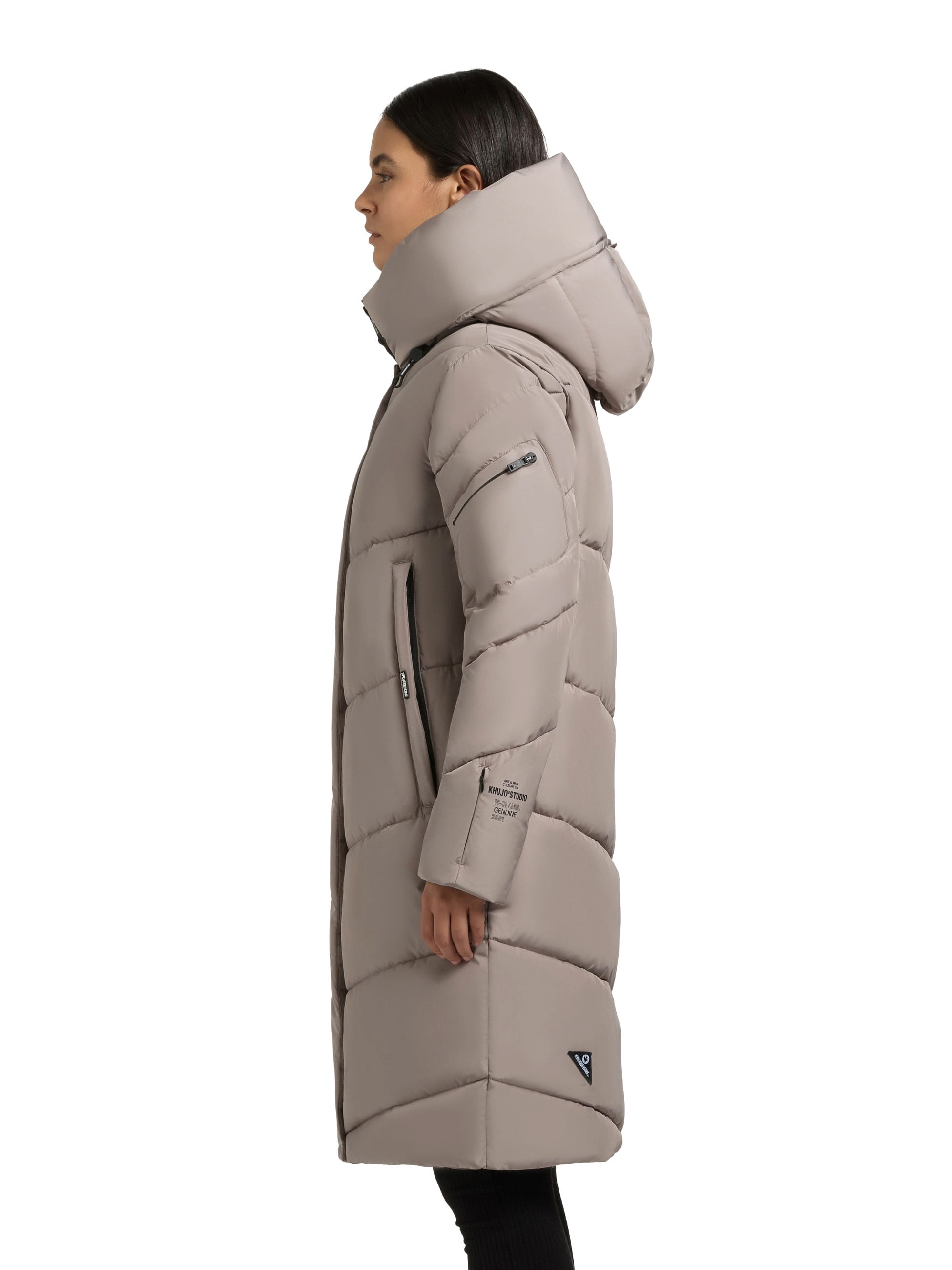 Die schräge Steppung, tolle Details, durchdachte Seitentaschen und die große Kaputze zeigen das aufwendige Design. Der Steppmantel ist warm wattiert gefüttert, vom Wind geschützt geschnitten und der überdeckte Reißverschluß hält Dich super warm.