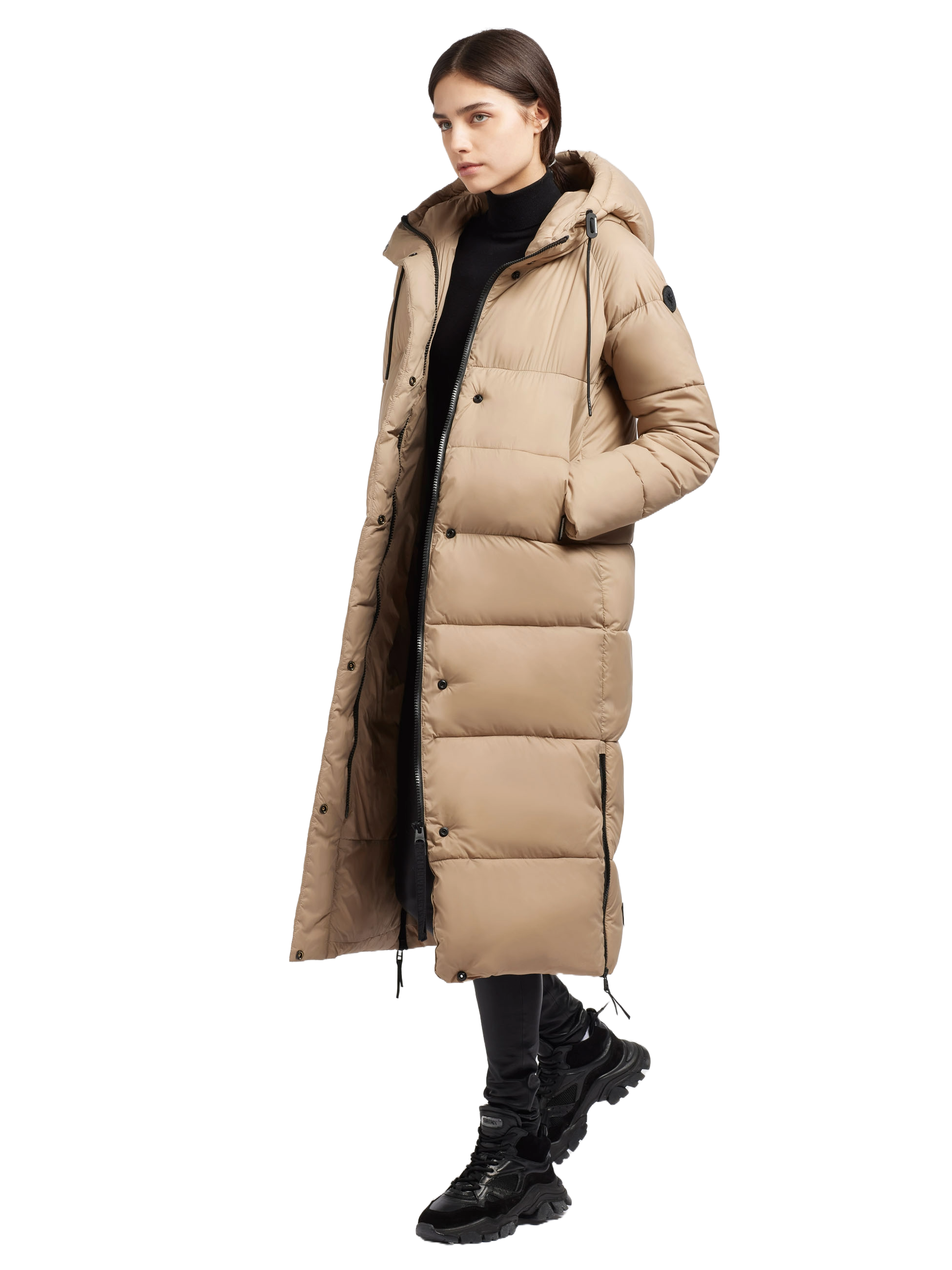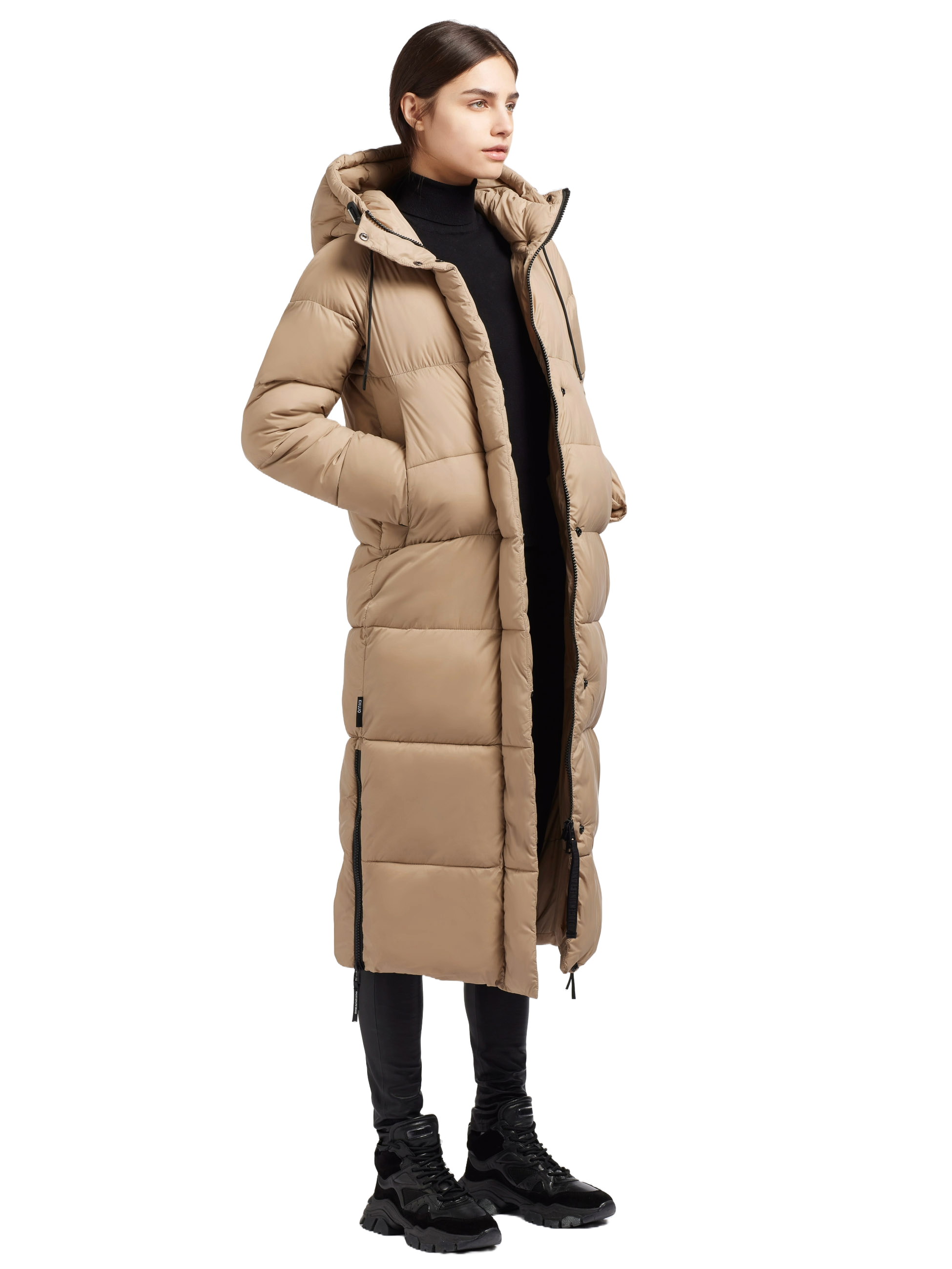 Du bist bis zur Mitte des Oberschenkels geschützt in einem warm wattierten Steppmantel, der wegen seines besonderen Material aber garnicht aufträgt und der Figur schmeichelt.