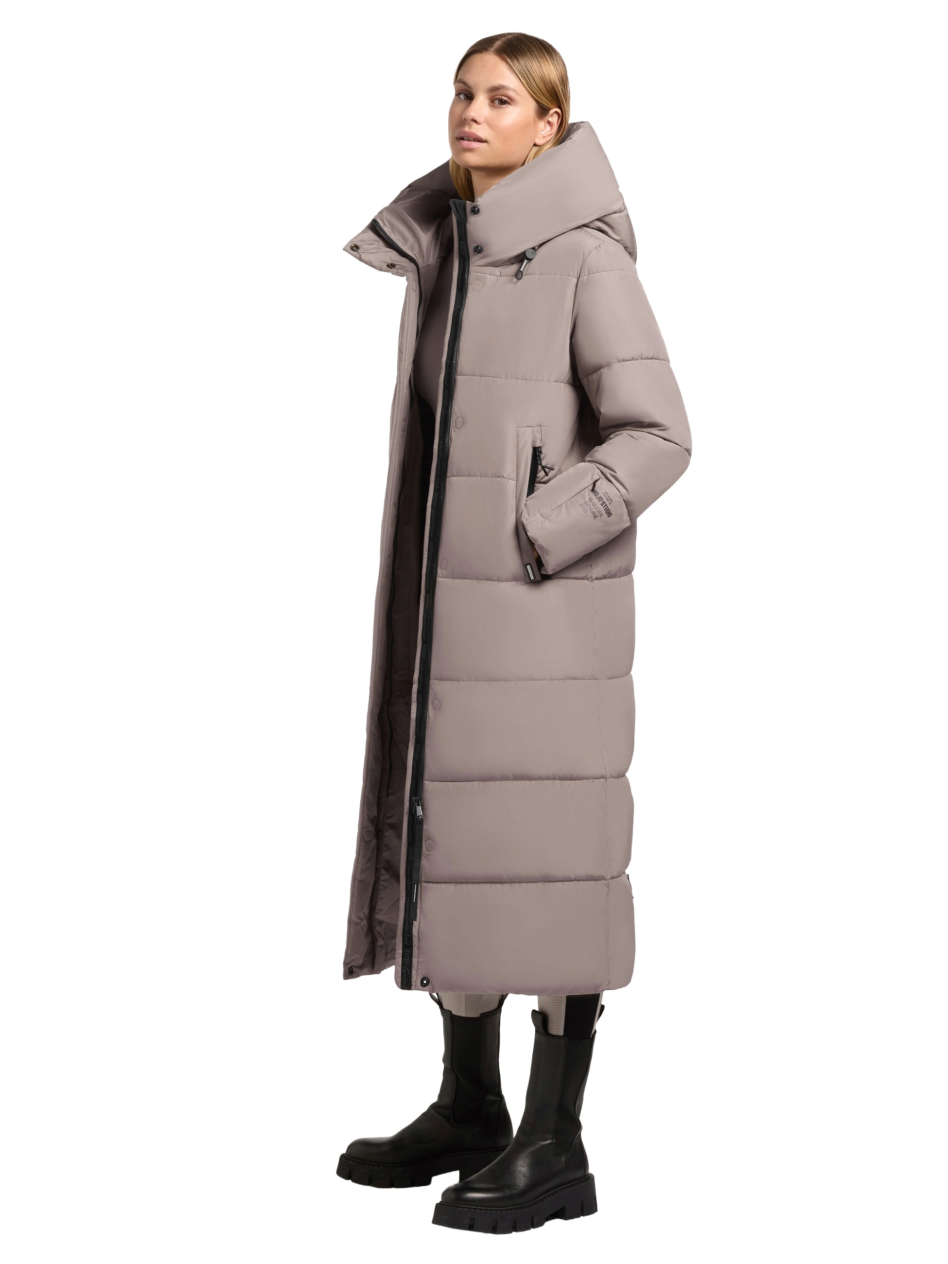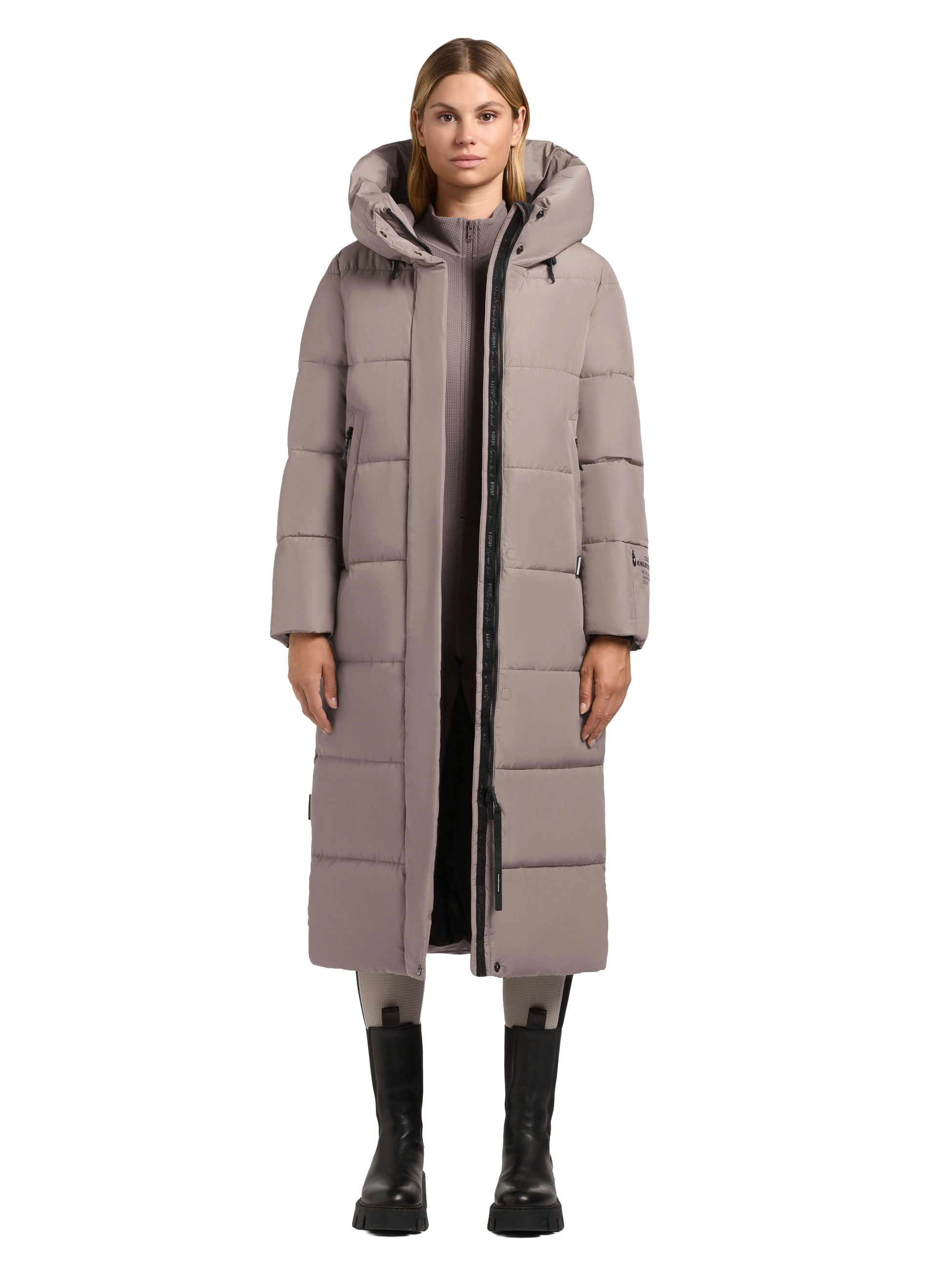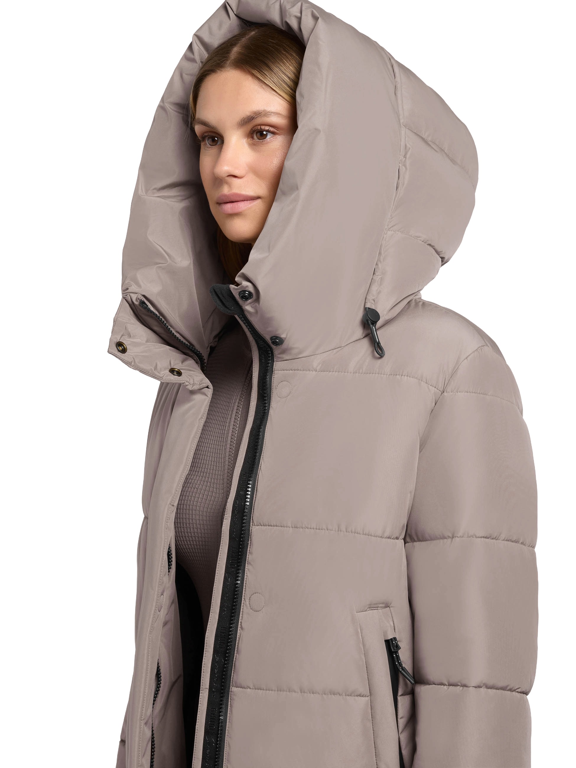 Eine warme Wattierung und die großzügige Kapuze sorgen für kuscheligen Tragekomfort, während die knielange Silhouette und ein verdeckter Reißverschluss den Look stilvollen Look abrunden.