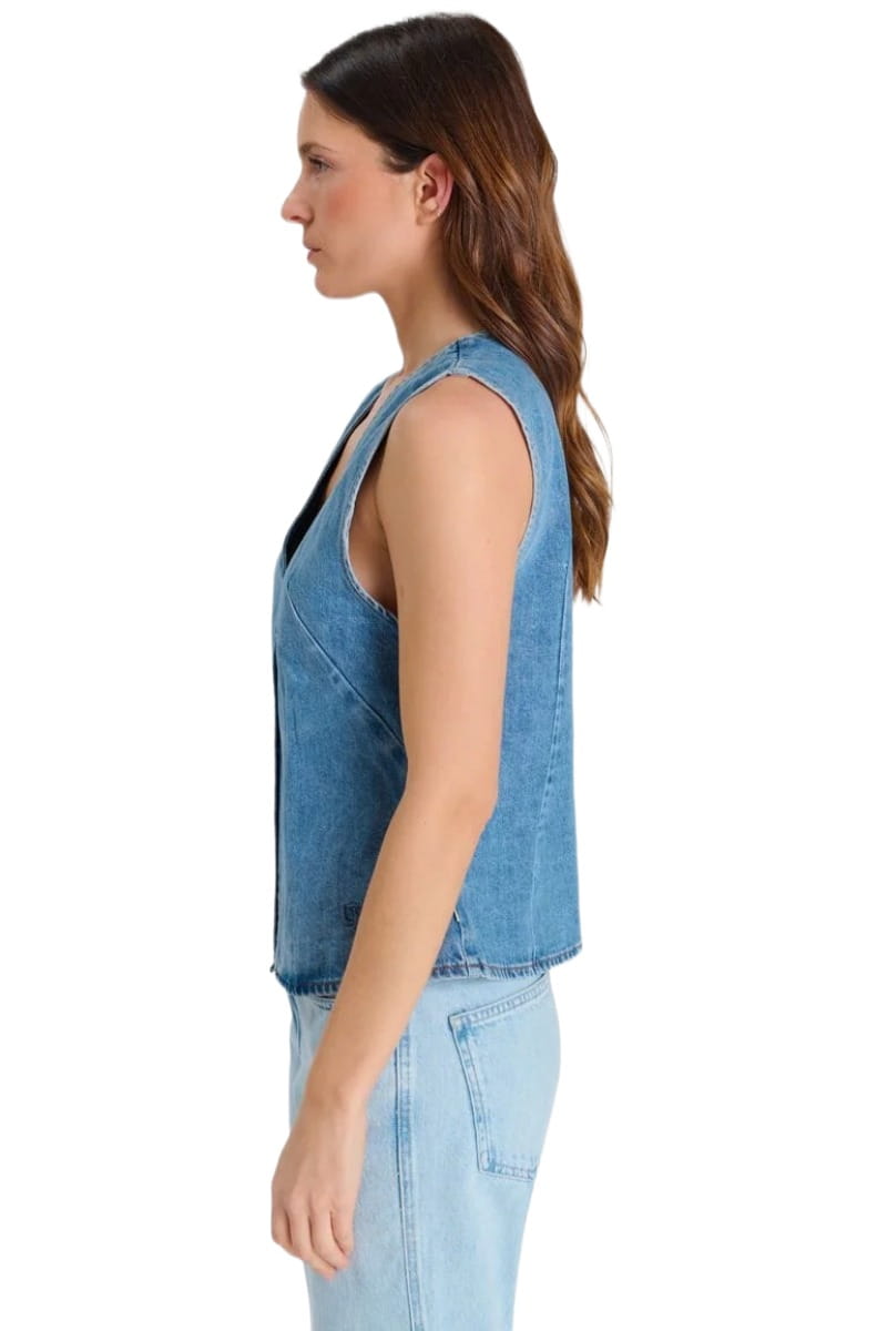 Die ärmellose Damen Weste "Melora" von Le Temps des Cerises begeistert mit hochwertigem Jeansmaterial und dezenten Logostickereien auf der Front, die der Jacke eine verspielte Optik verleihen.