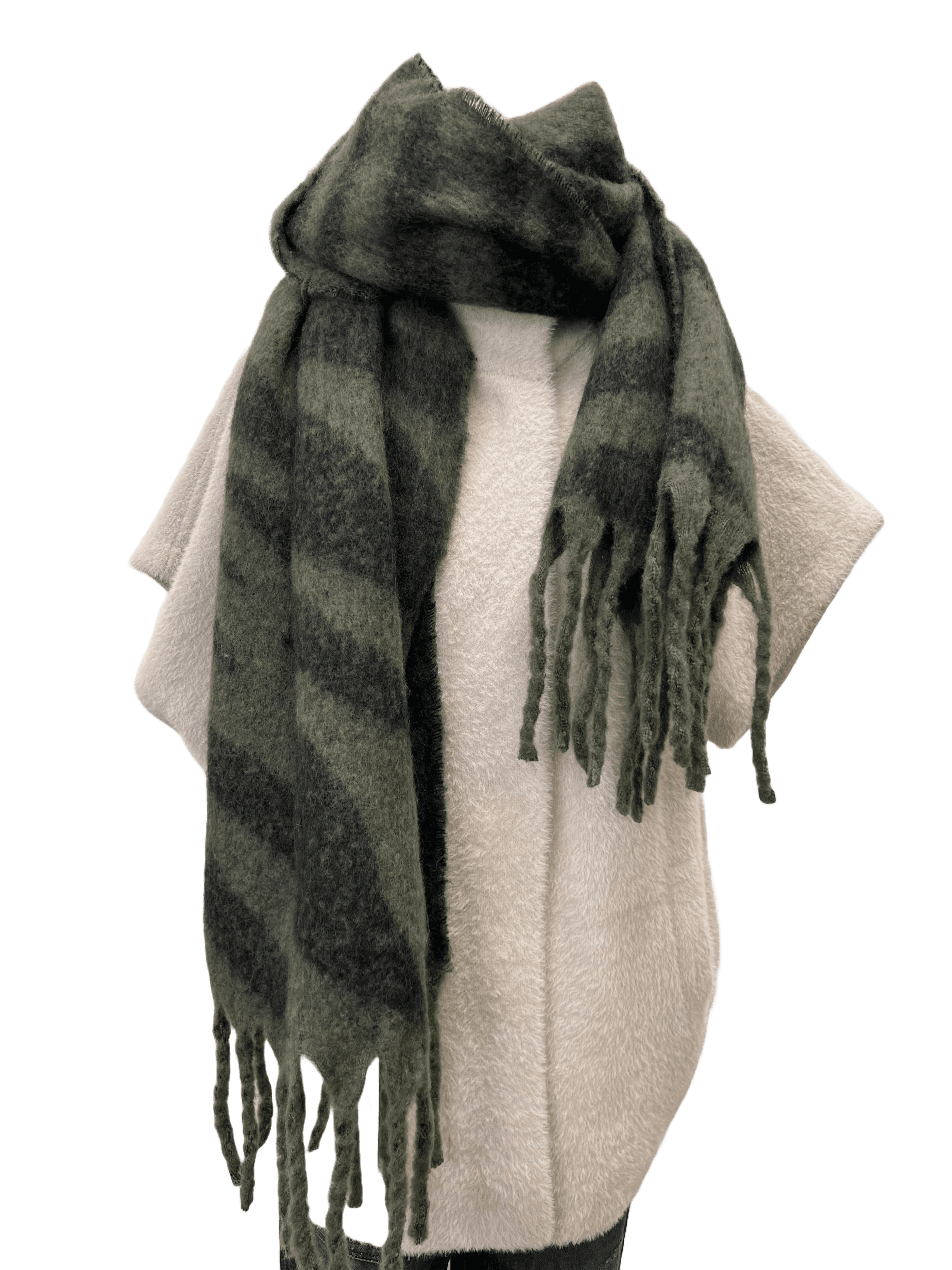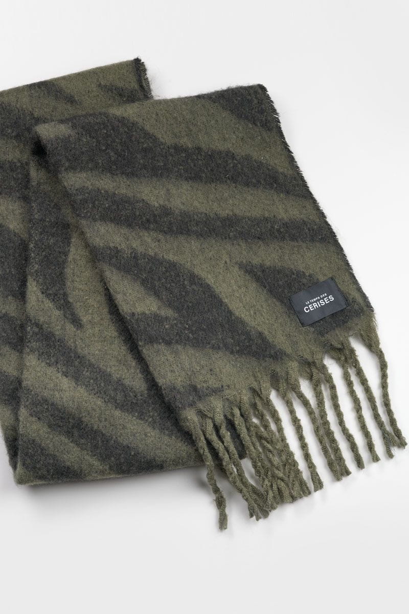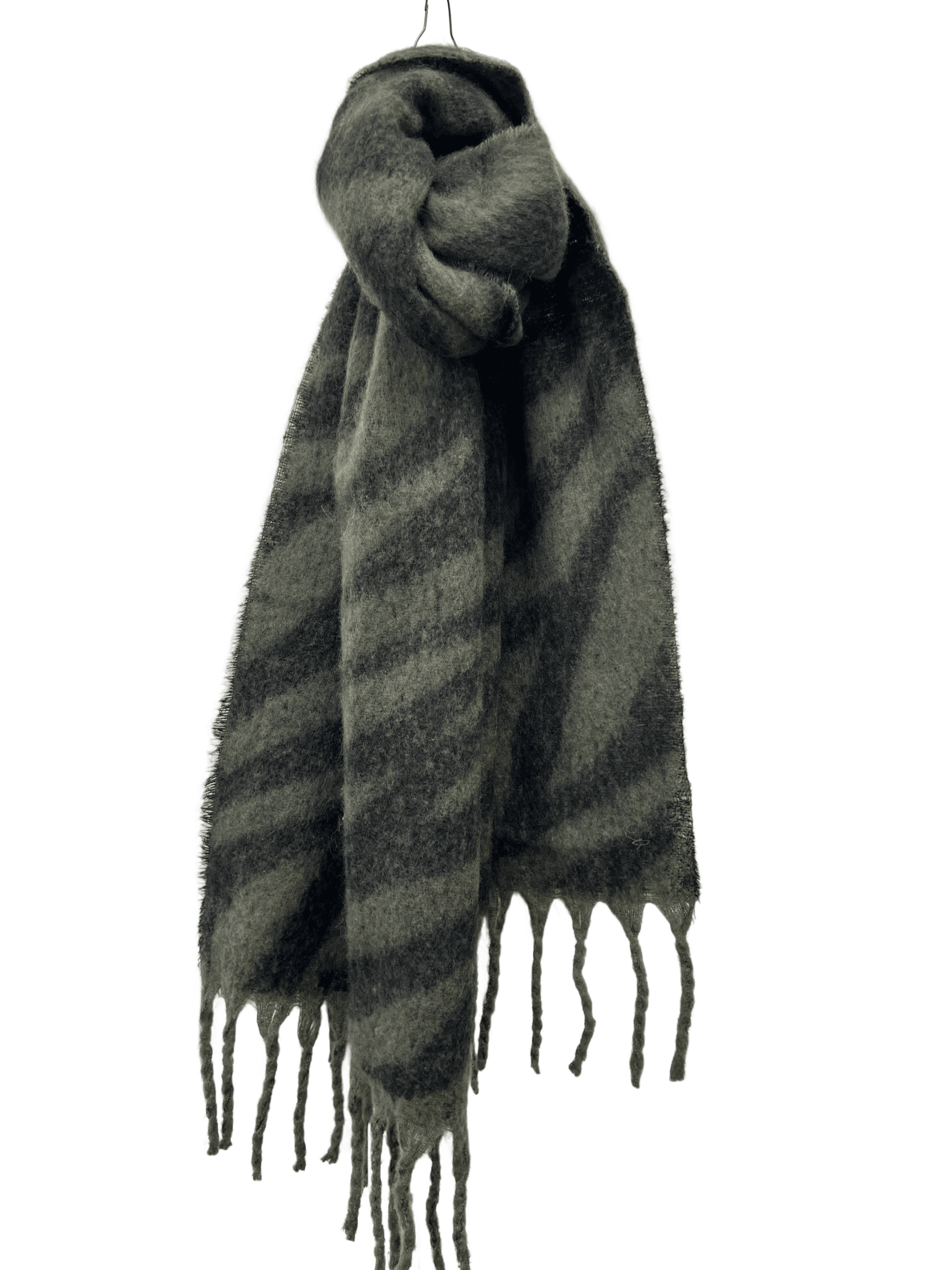 Das moderne Zebra Muster in Verbindung mit den harmonischen olive Tönen macht den Schal zu einem absoluten Must-Have für den Herbst und Winter!