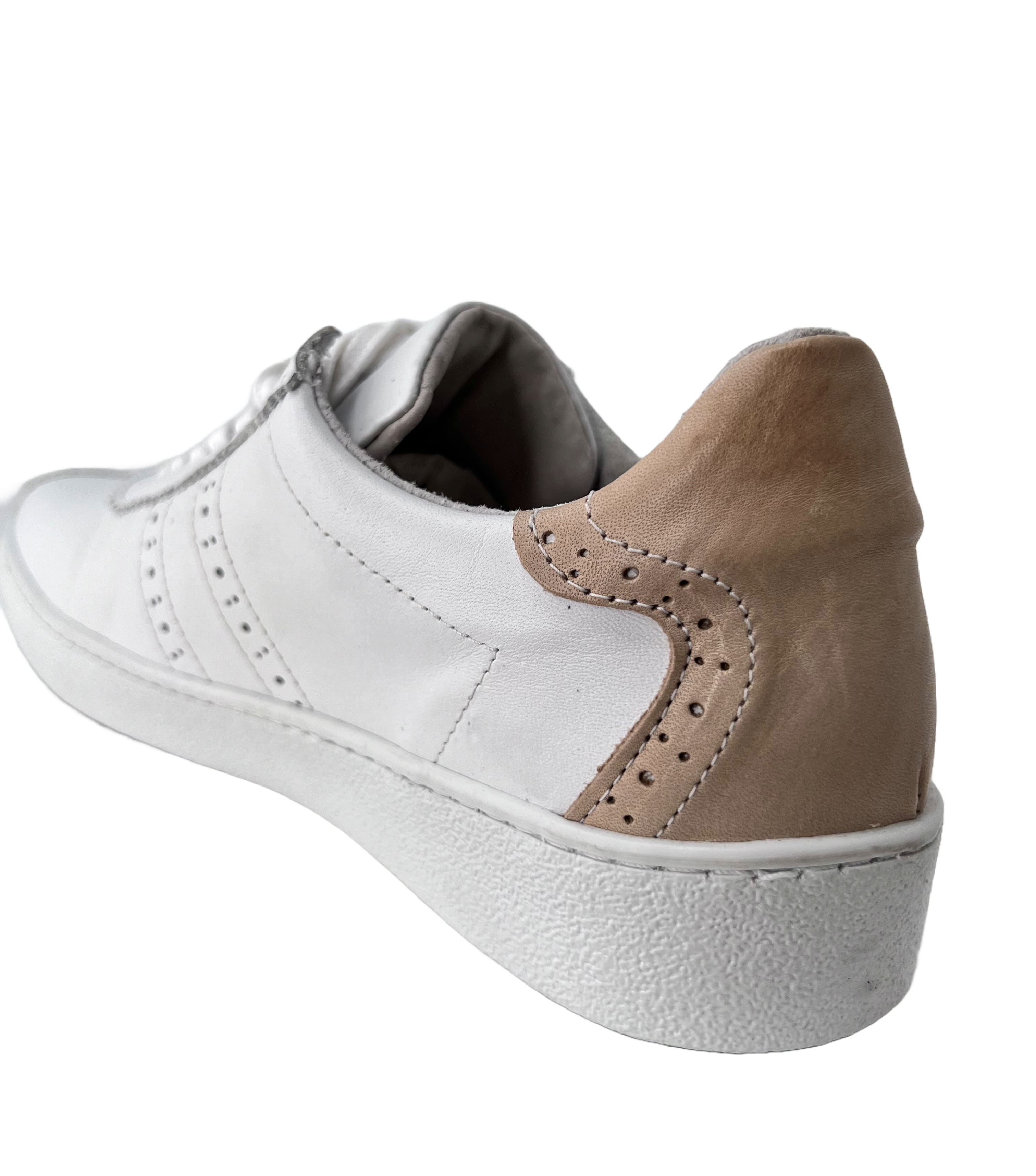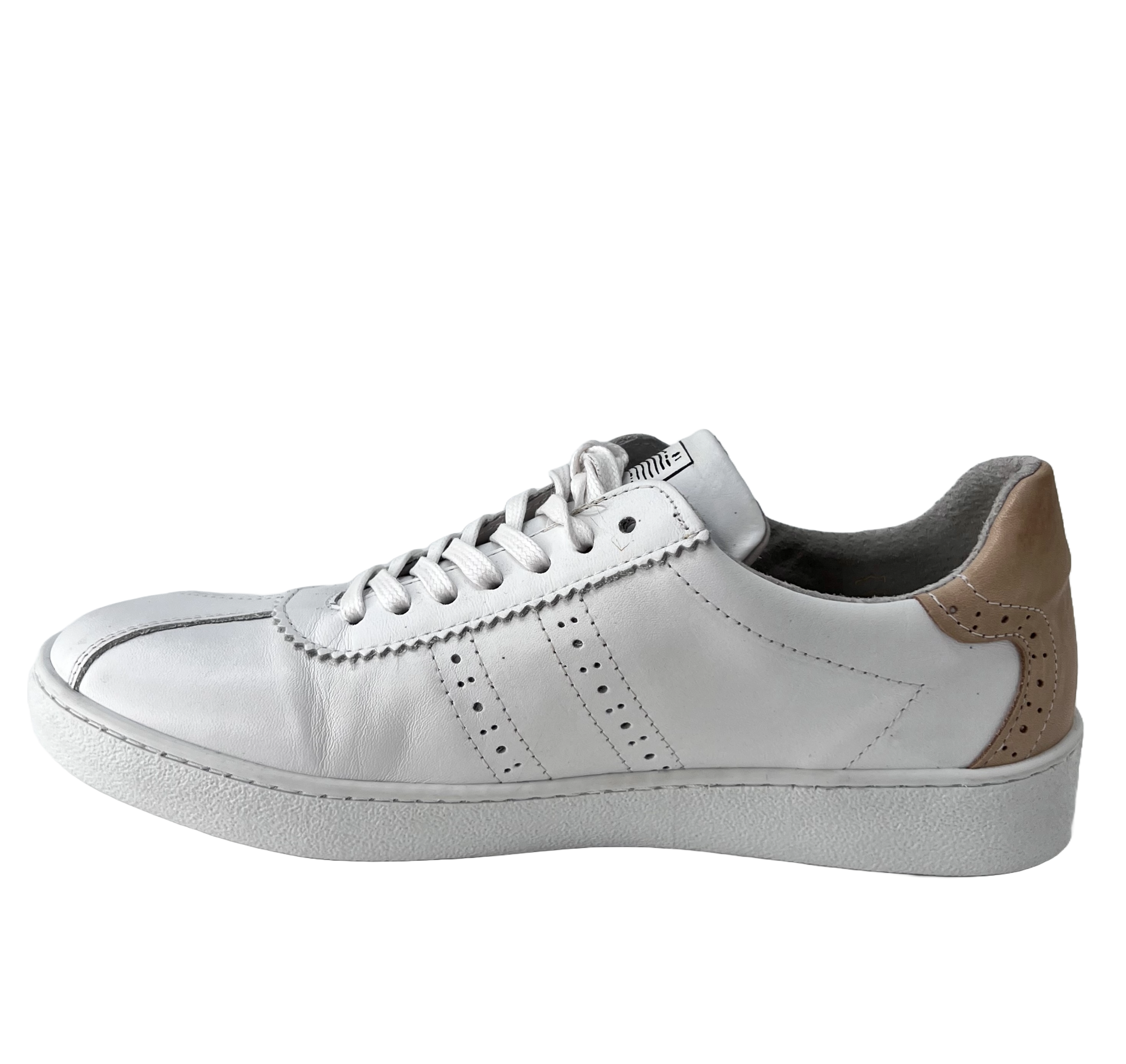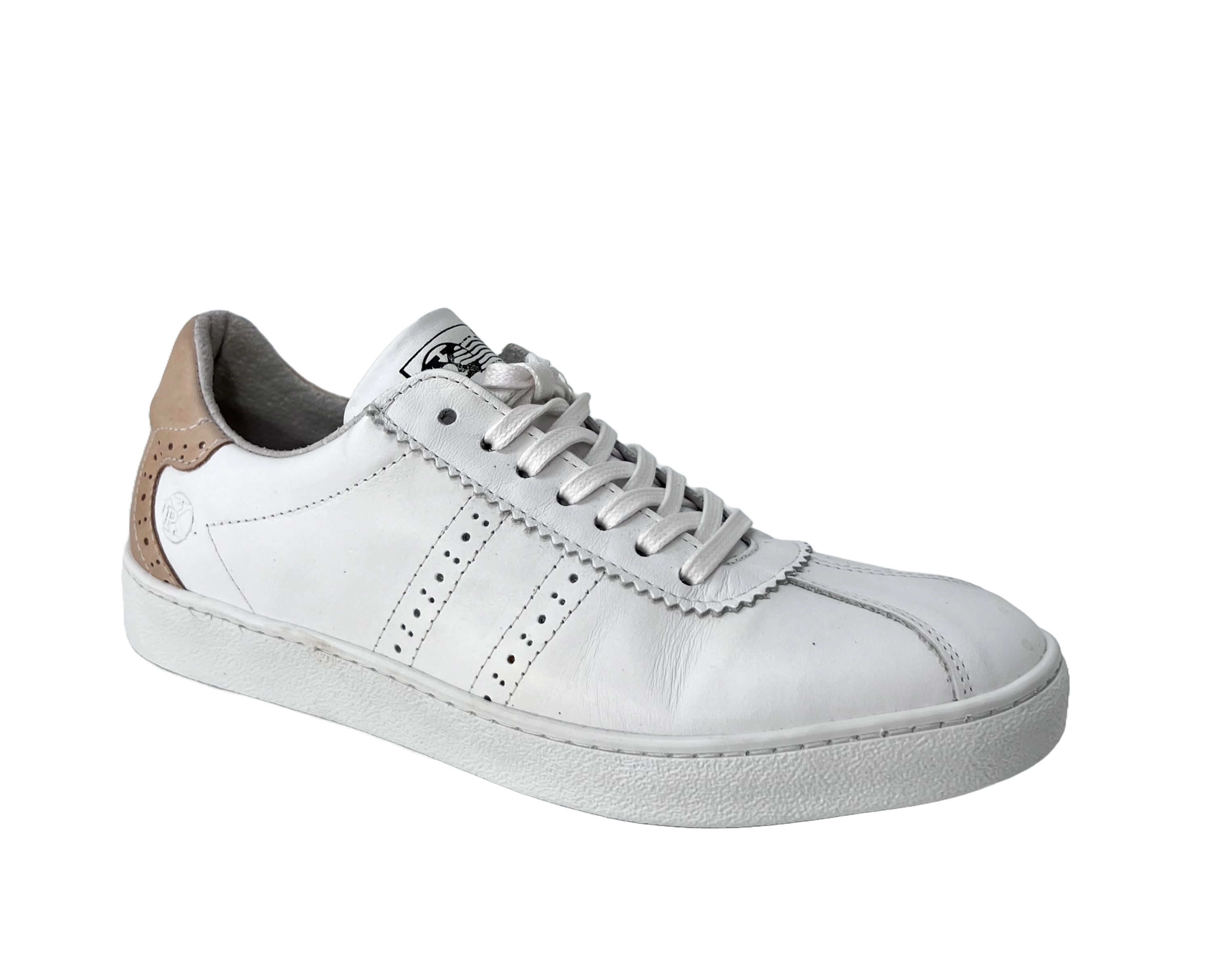 Der Micha 40 ist ein Sneaker aus Leder mit Budapester Look. Er ist aus Glatt Leder gefertigt und hat an der Ferse einen congac-farbenen Abschluß. Das wertet ihn noch mal richtig auf.