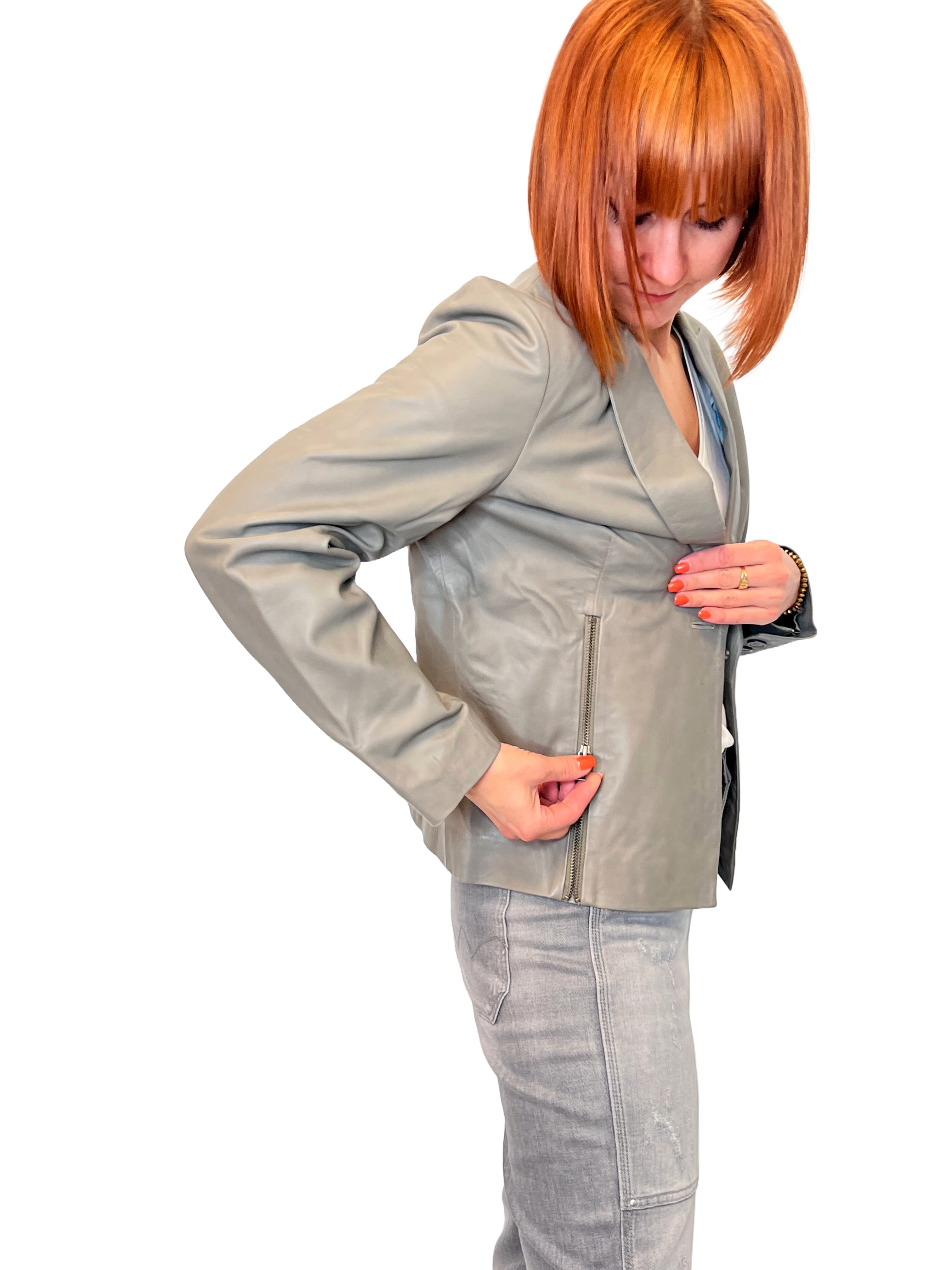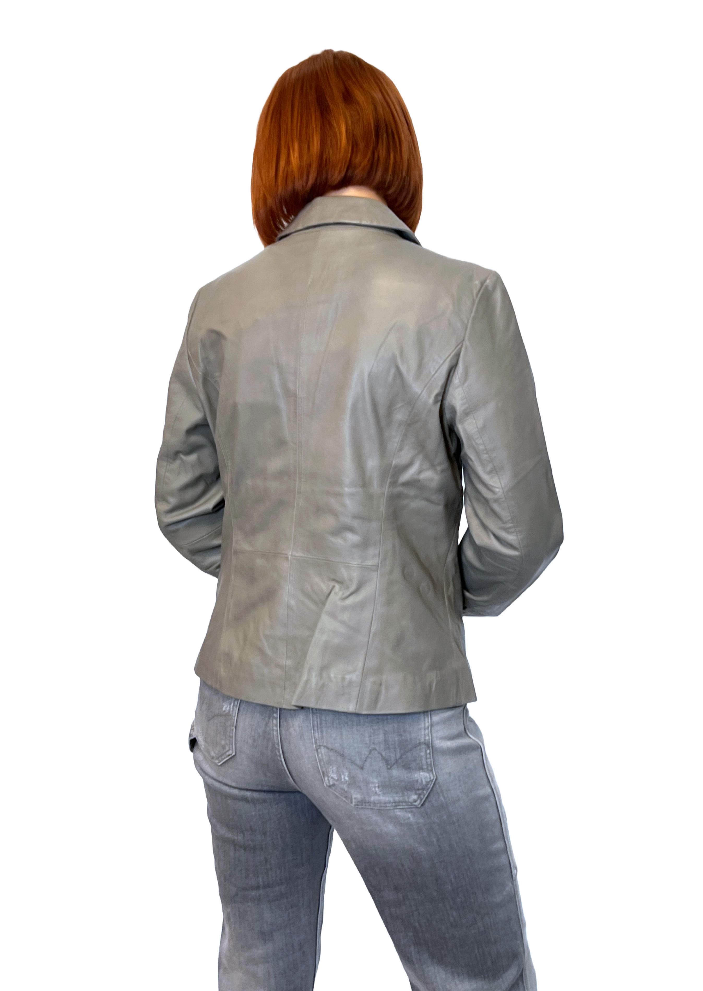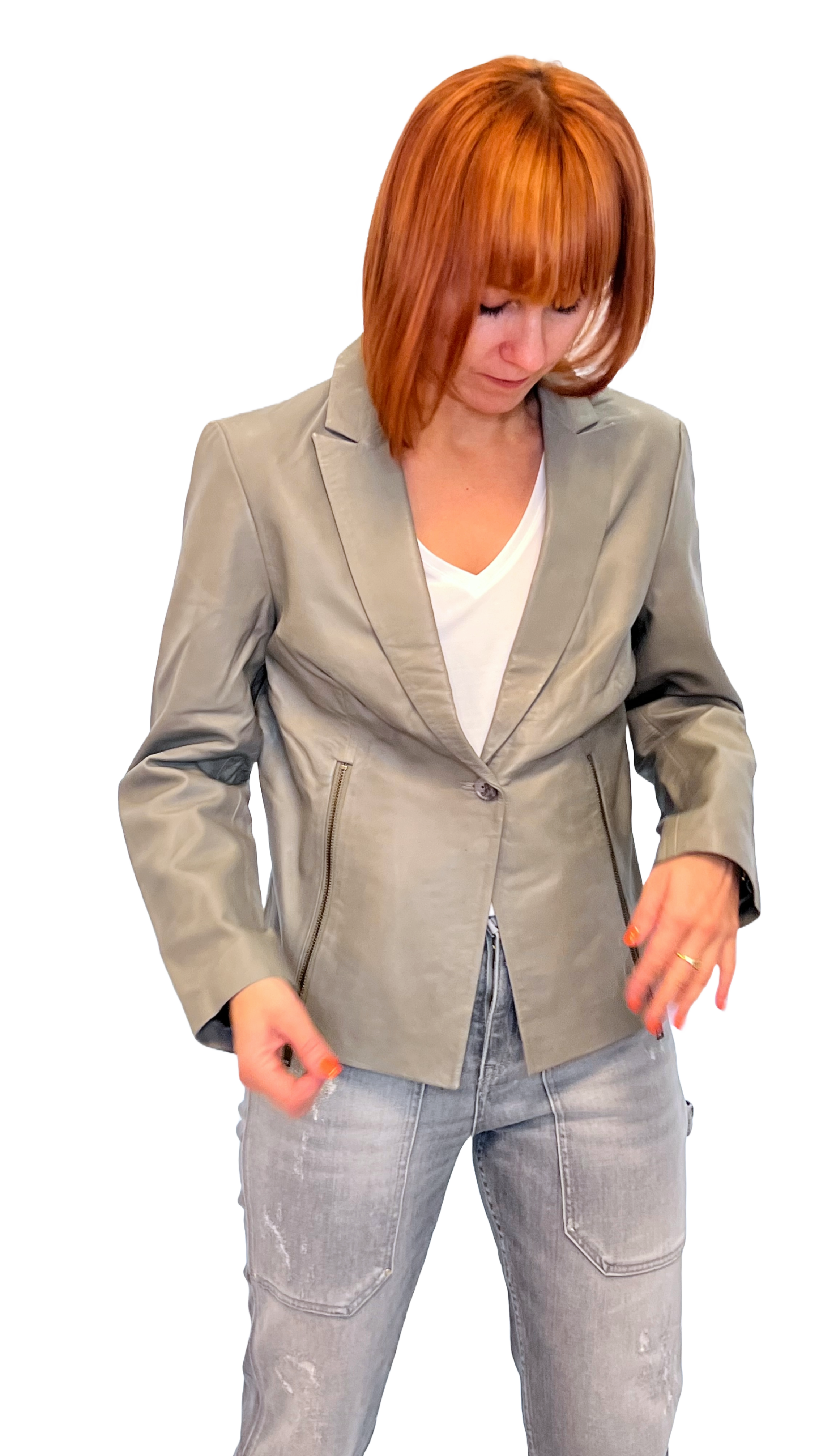 Caatje ist eine Lederjacke in Blazerform. Sie ist aus butterweichem Lammleder hergestellt, mit einem Knopf zum verschließen, tailliert geschnitten und herrlich zu tragen.