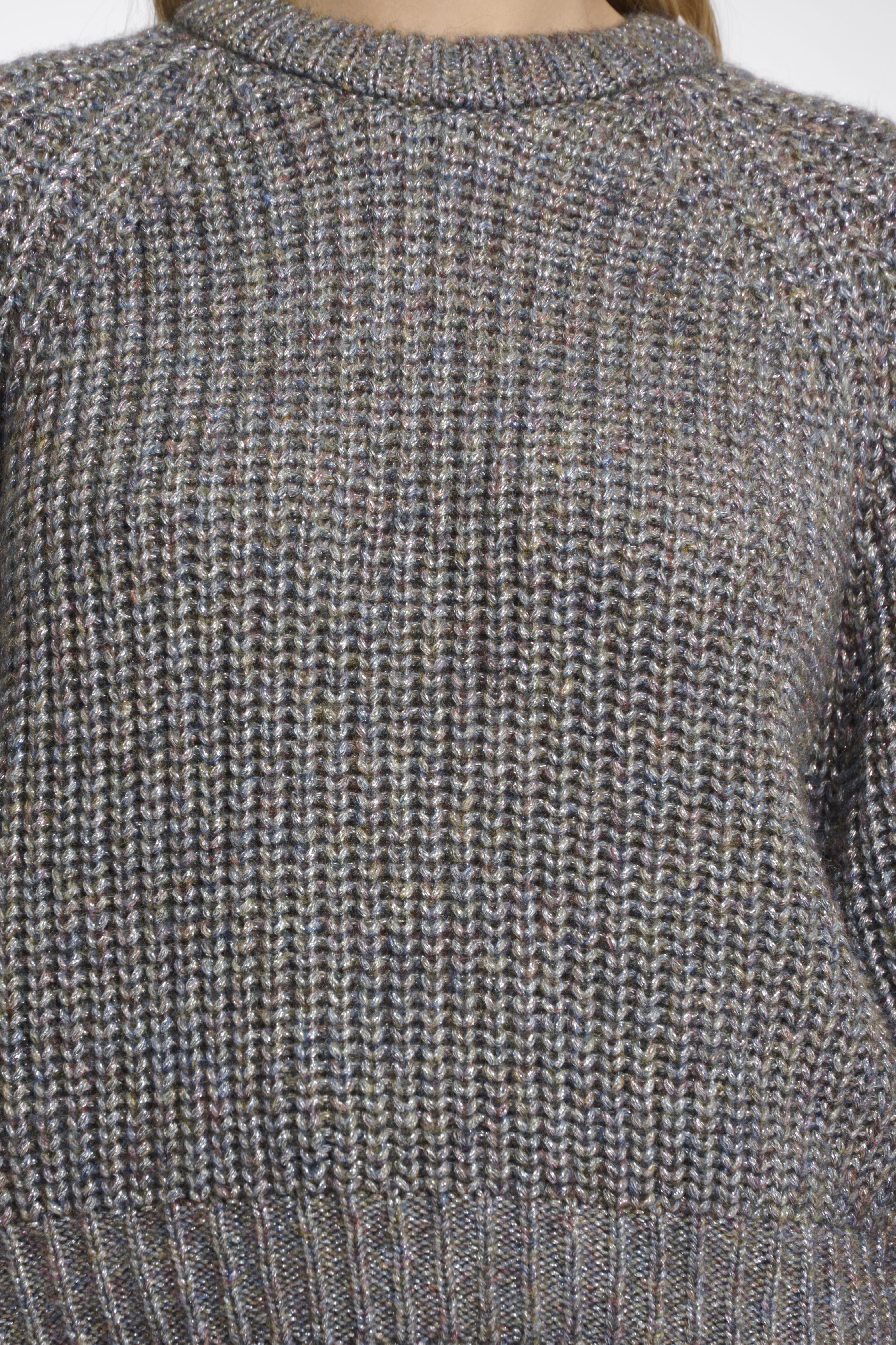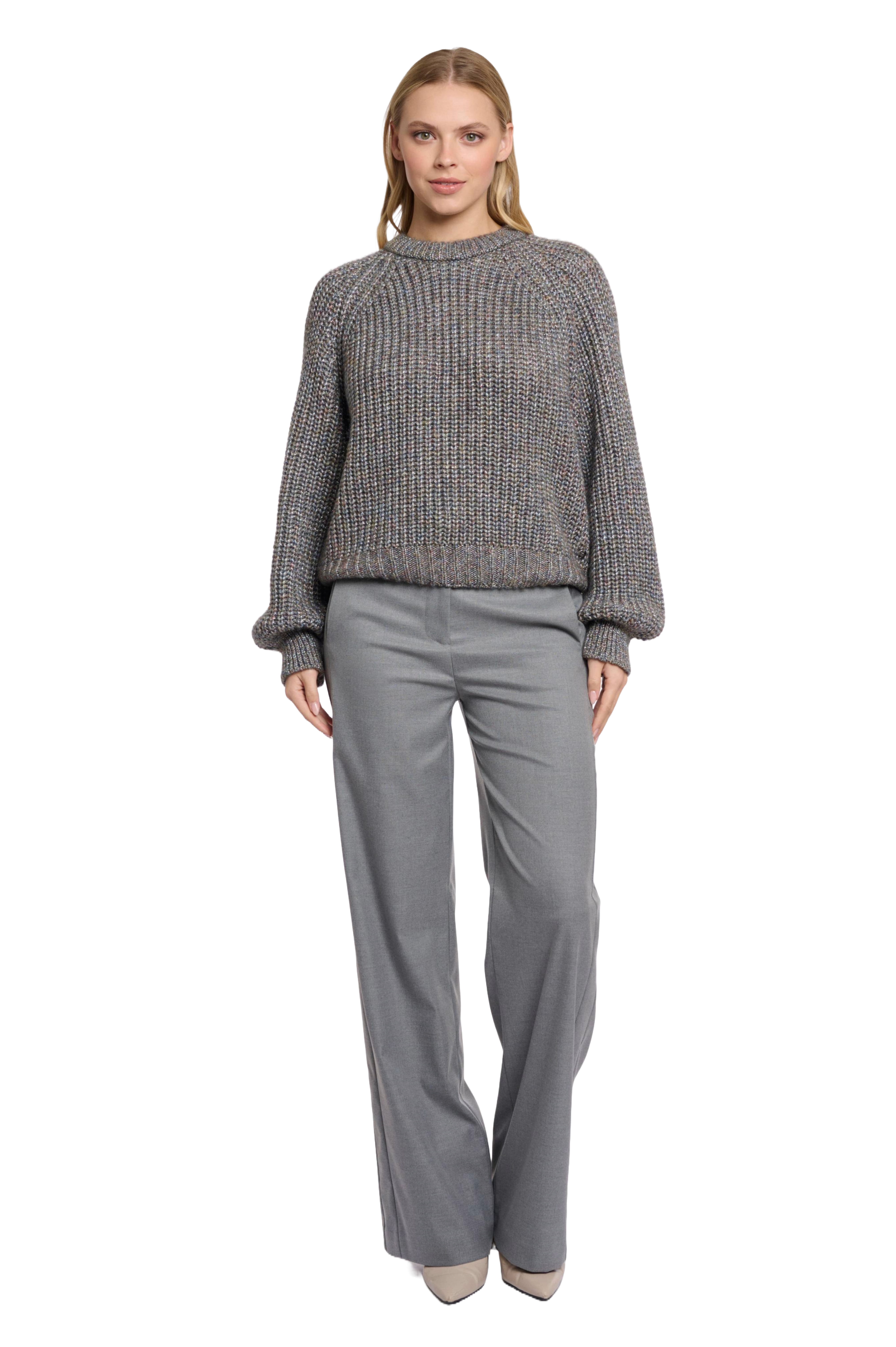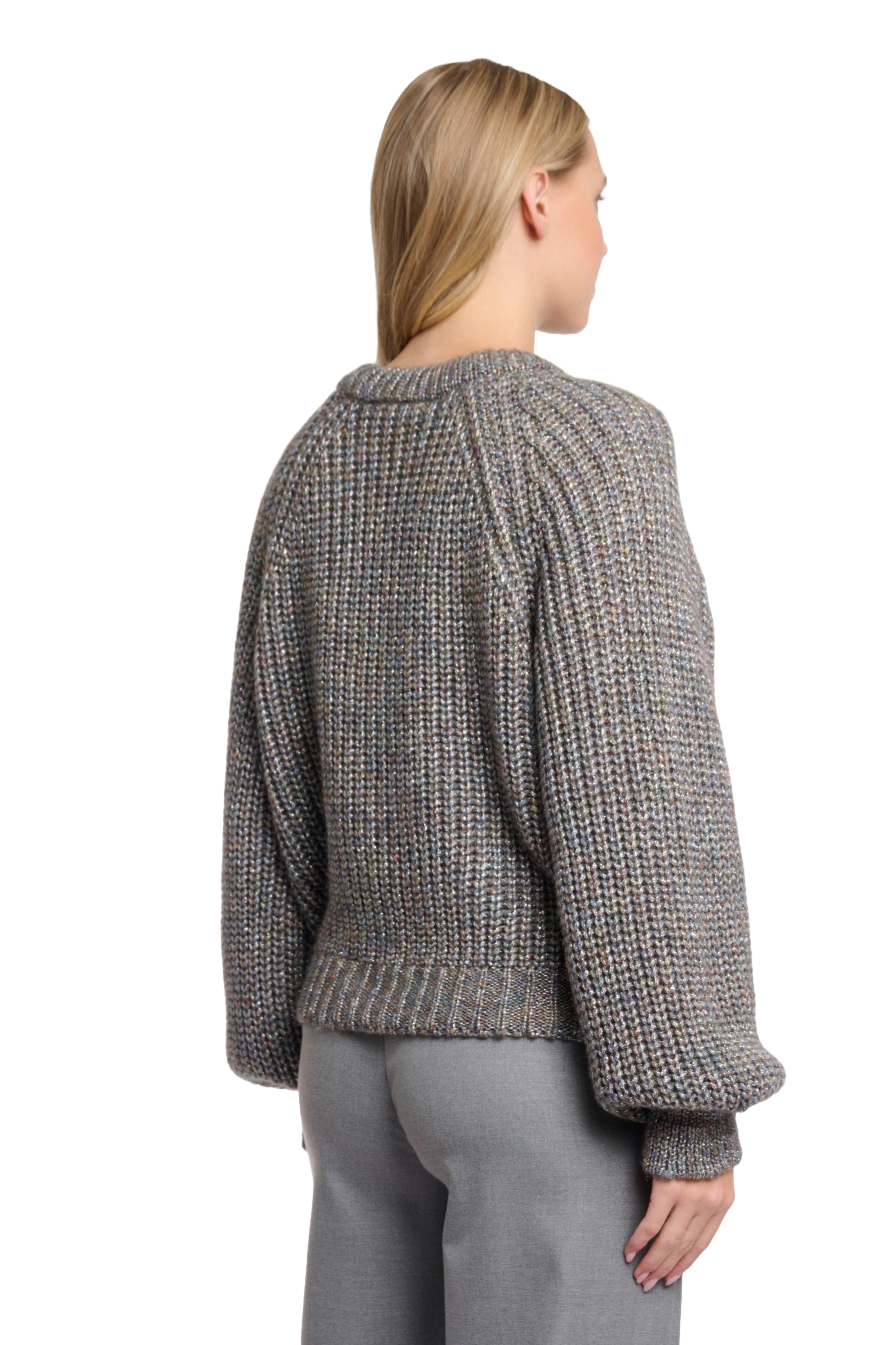Der gröber gestrickte Look sorgt für eine moderne Optik während ein lockerer Ballonärmel und überschnittene Schultern eine weiche, feminine Silhouette verleihen. Die mehrfarbigen, metalic Fäden durchziehen den graun Pullover und setzten ihn in Szene.