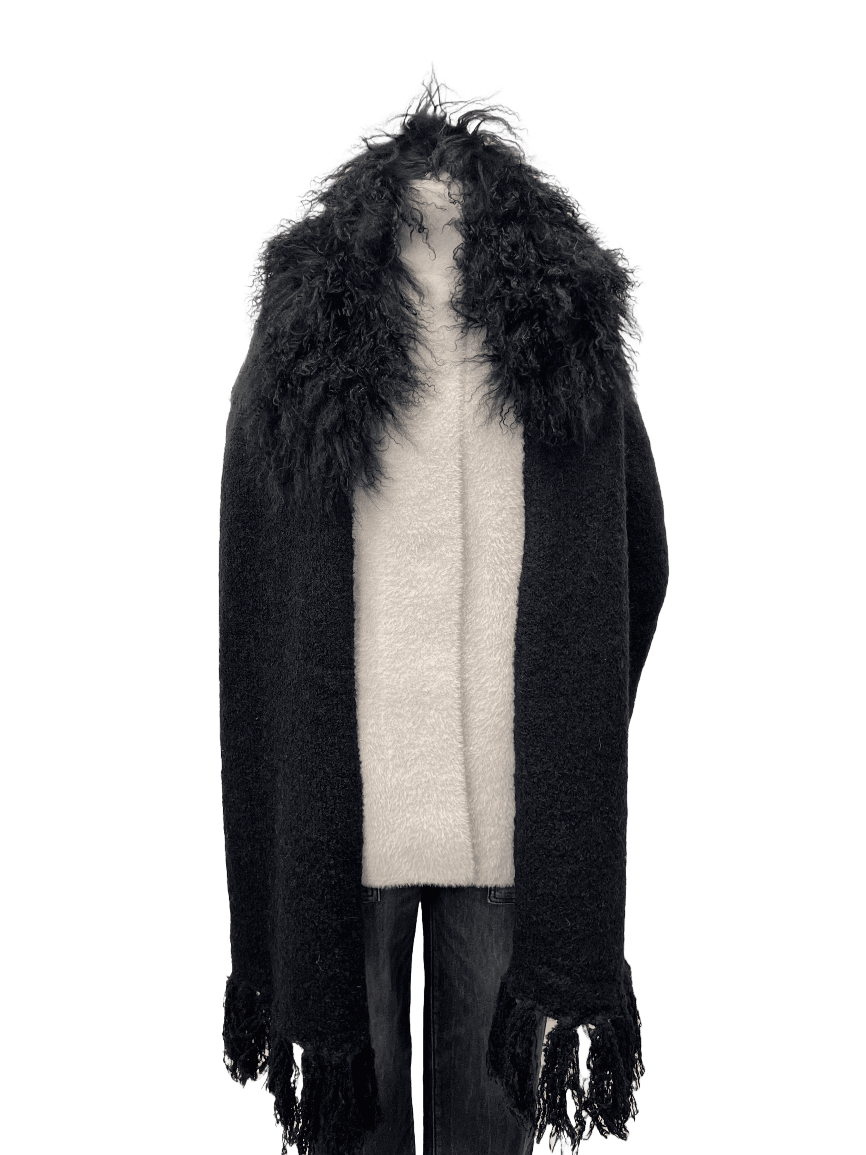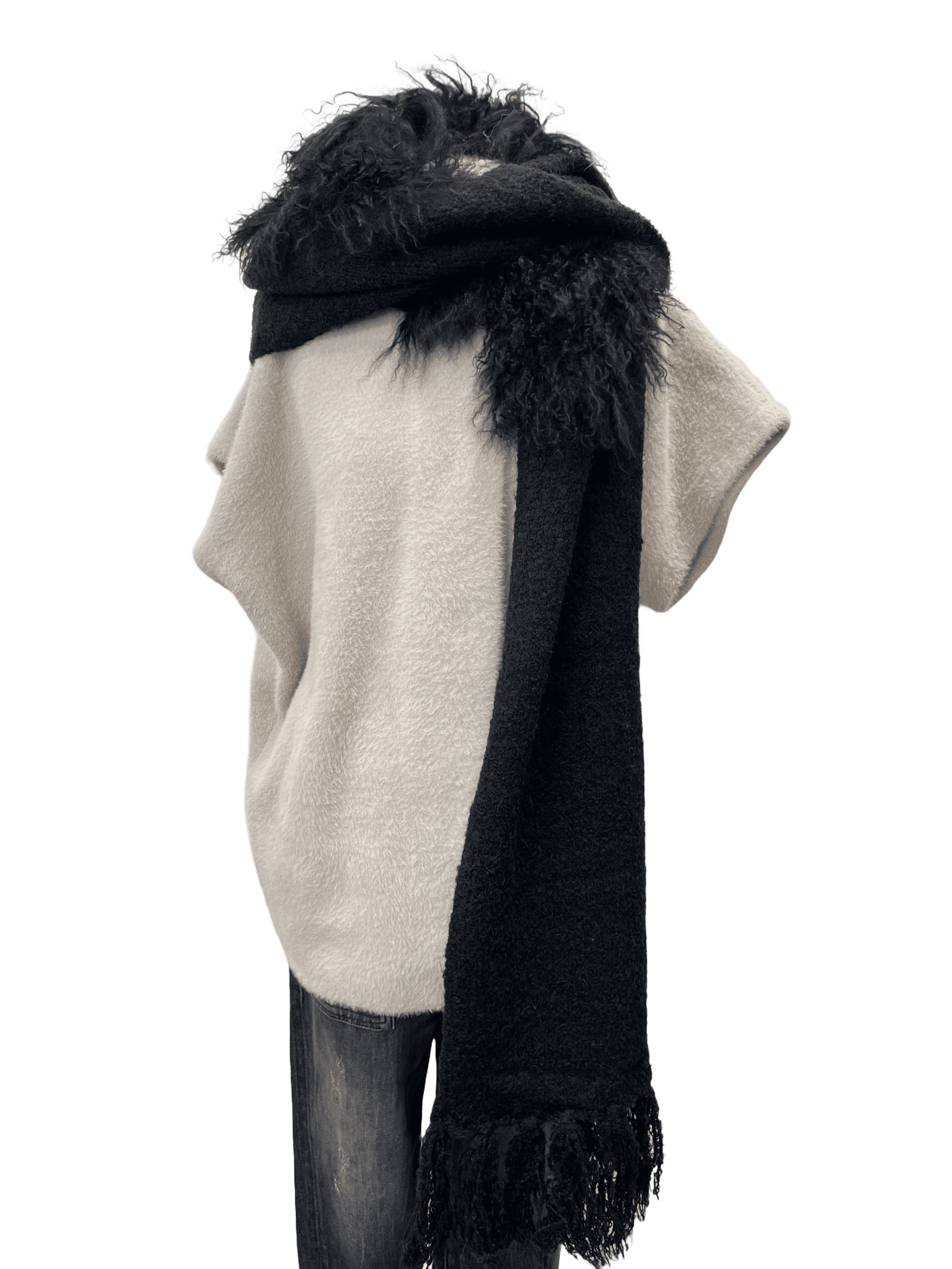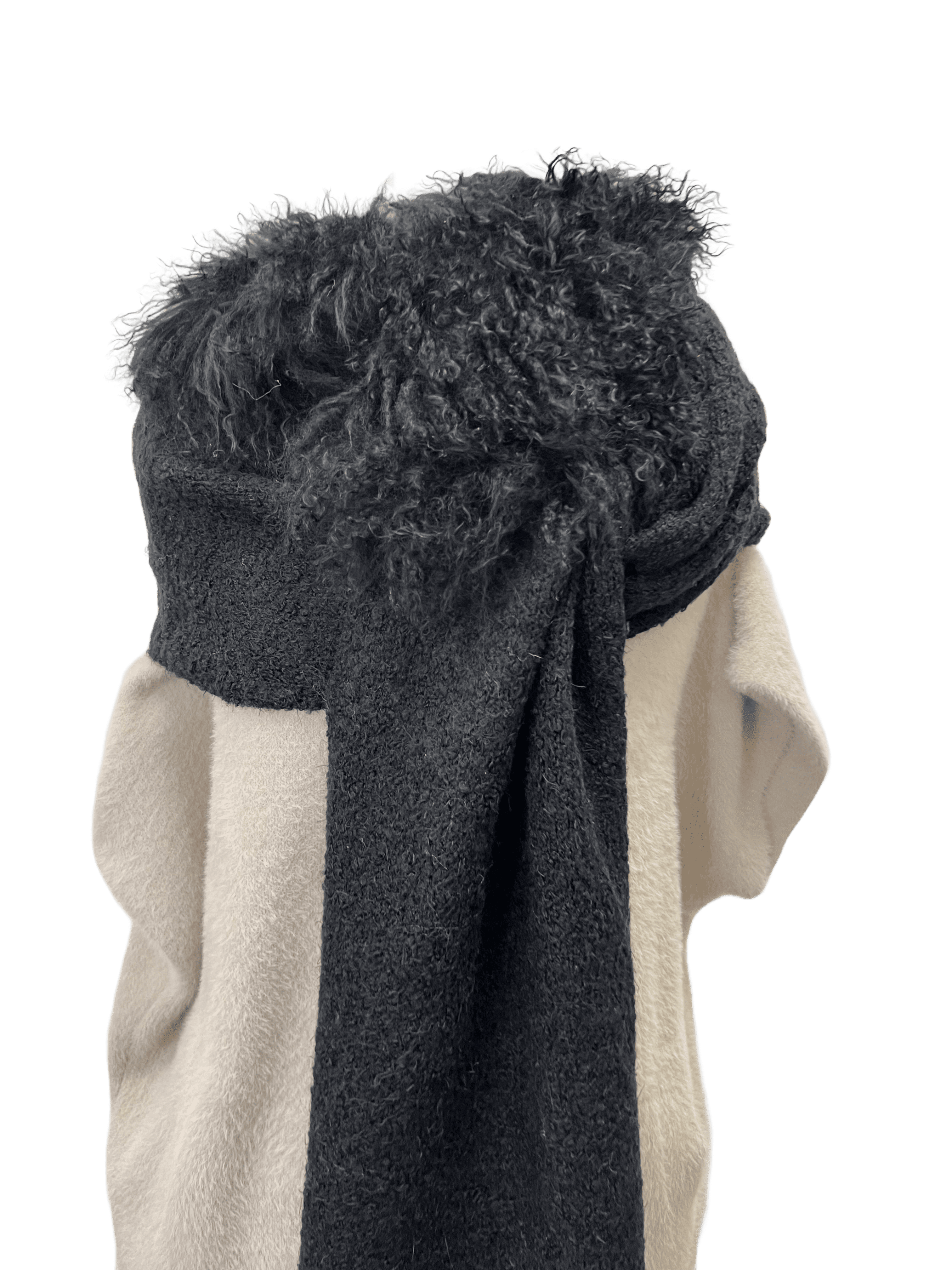 Hoy von Rino & Pelle hält dich kuschelig warm und umschmeichelt Dich mit dem fluffigen Echtfellkragen. Trag den Schal auch als Cape oder Stola.