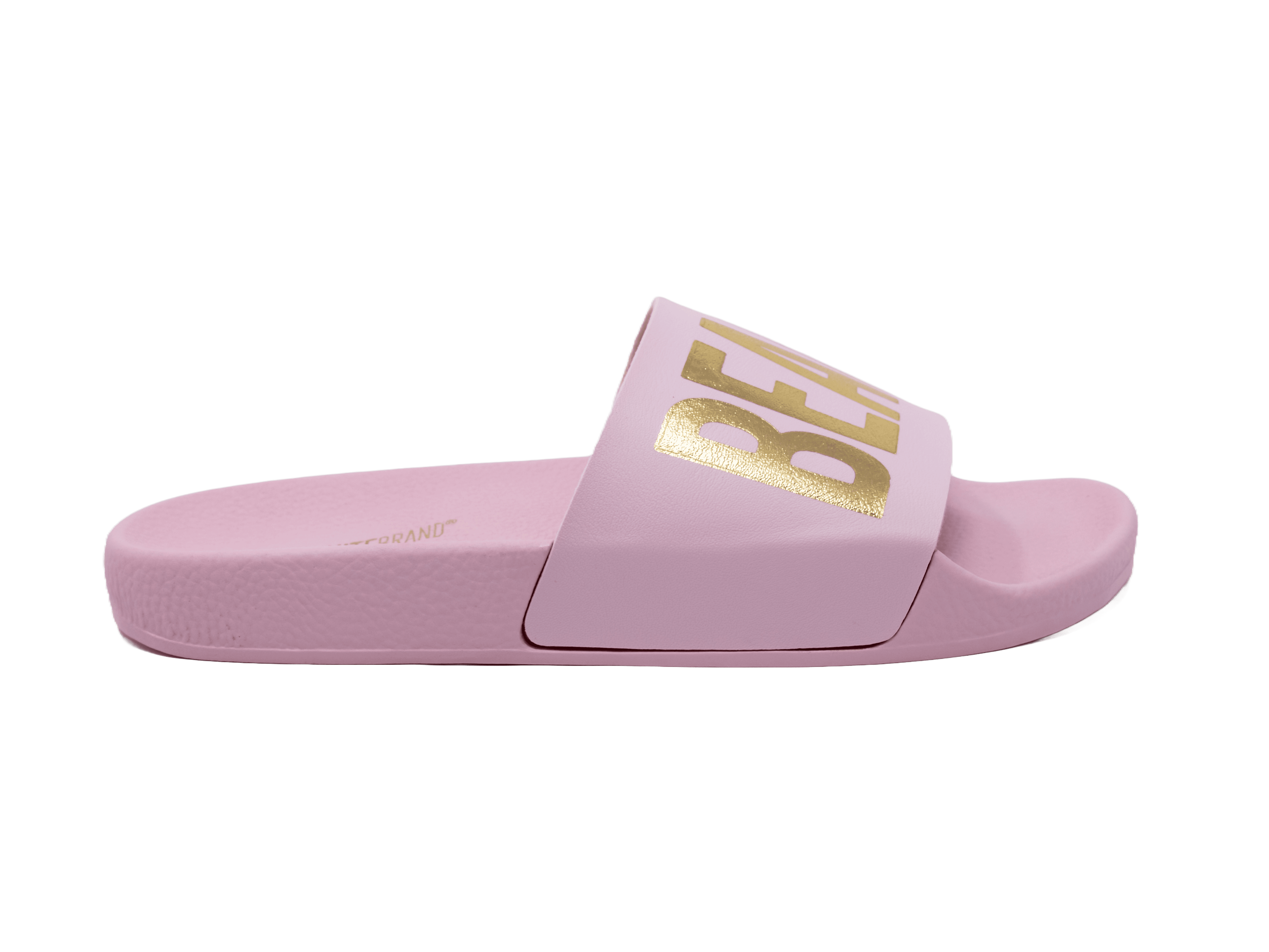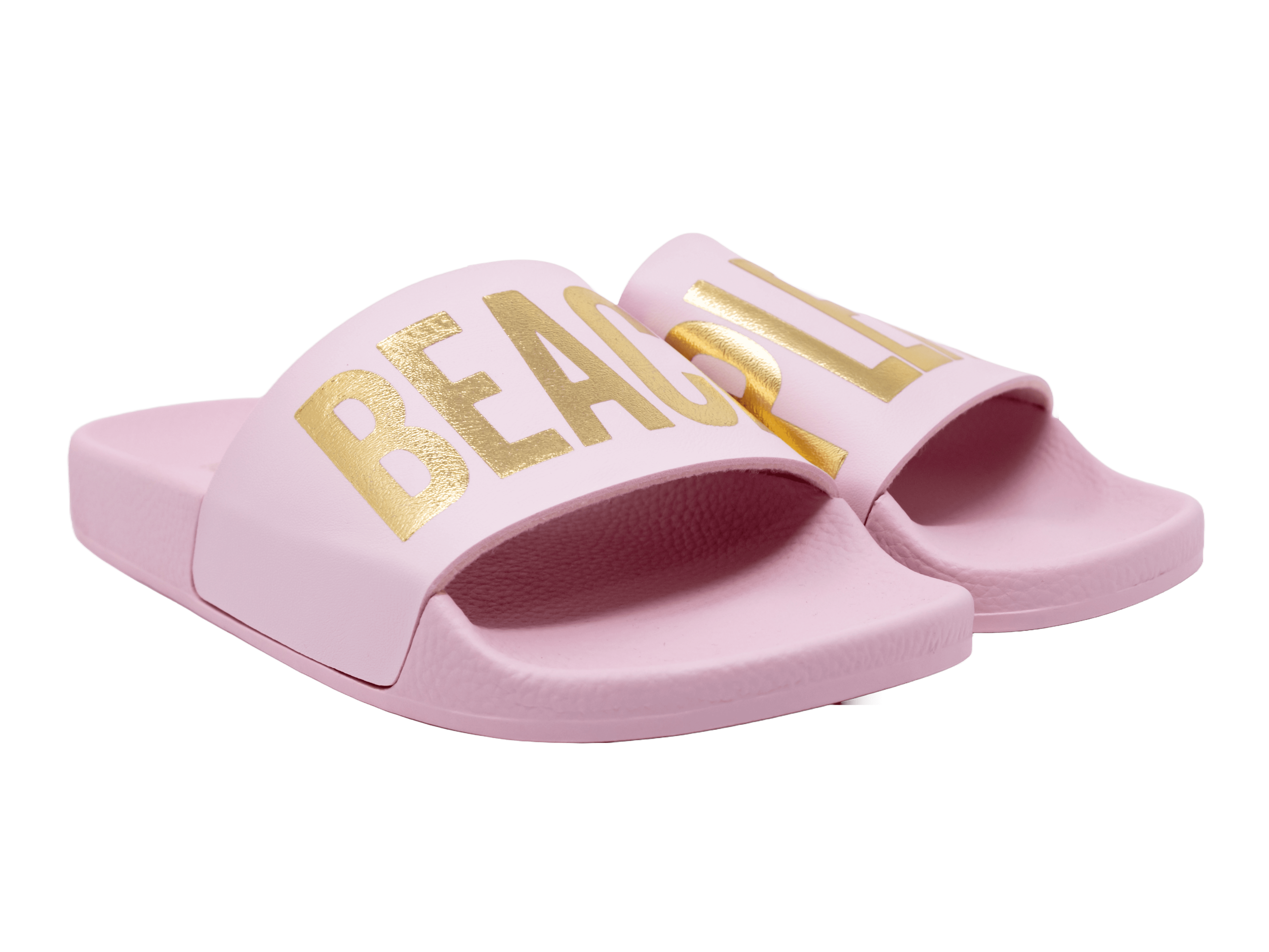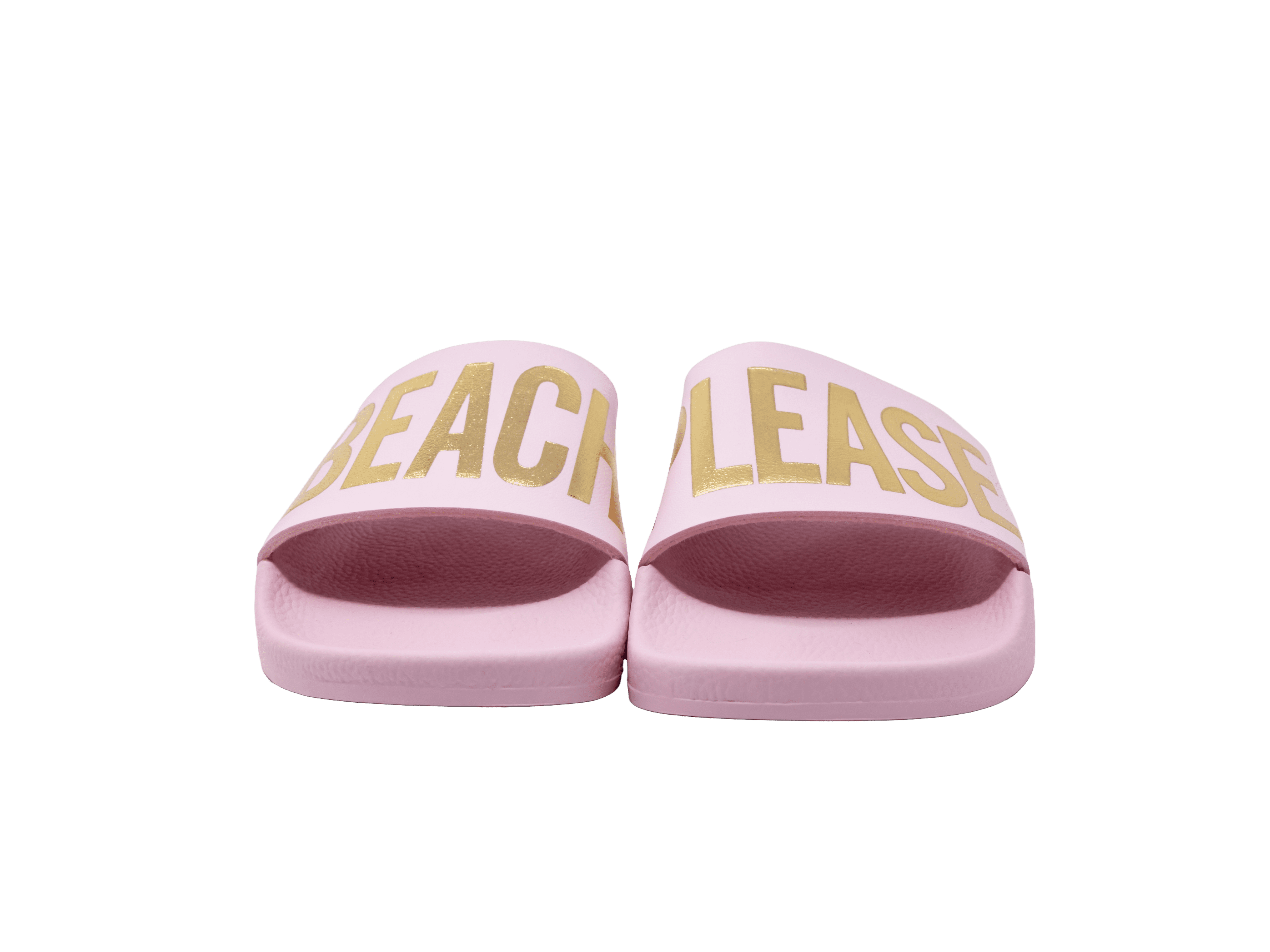 Tolle Farbkombination aus goldener Aufschrift "Beach Please" und dem rosanen Grundton der Pantolette.