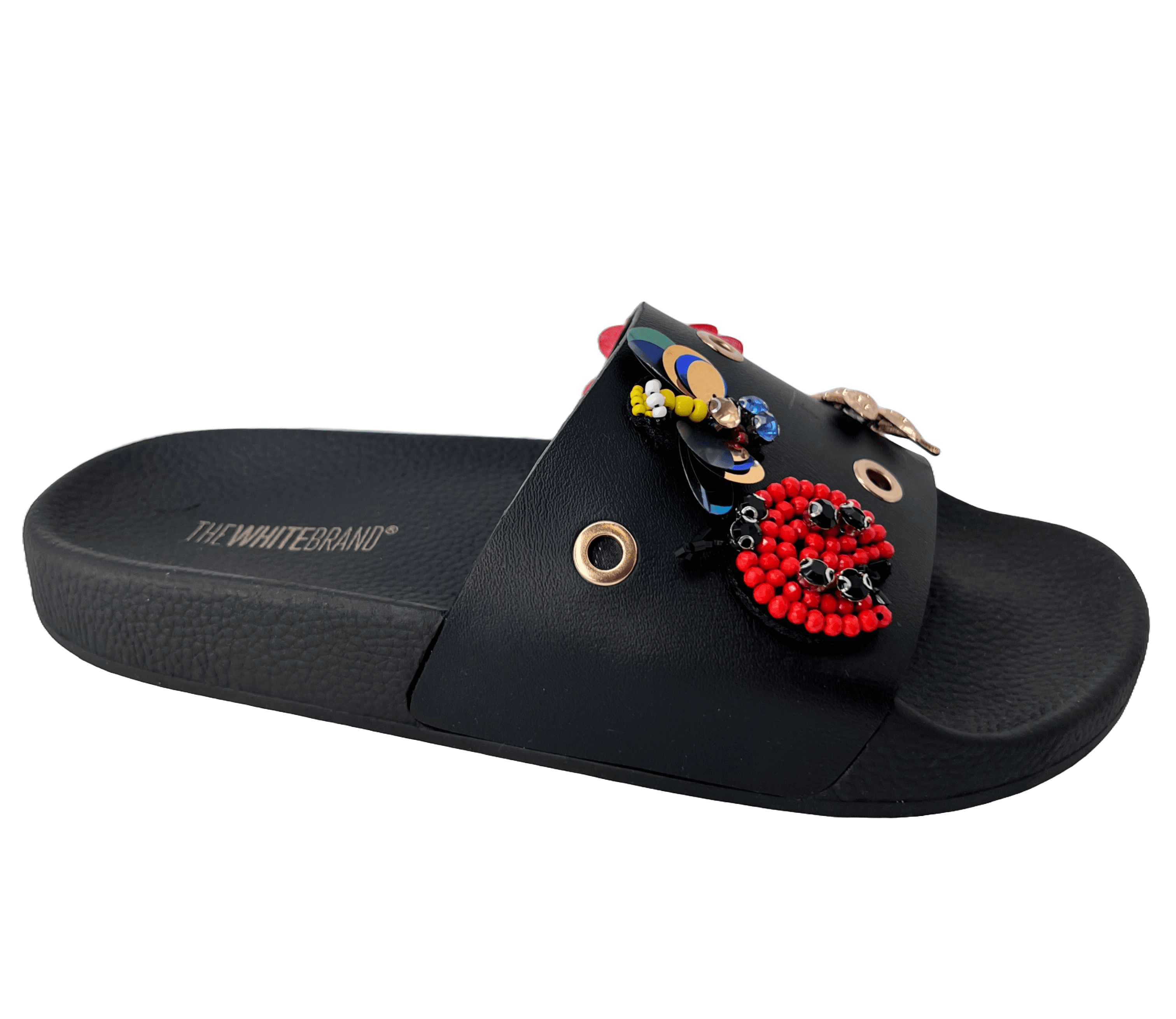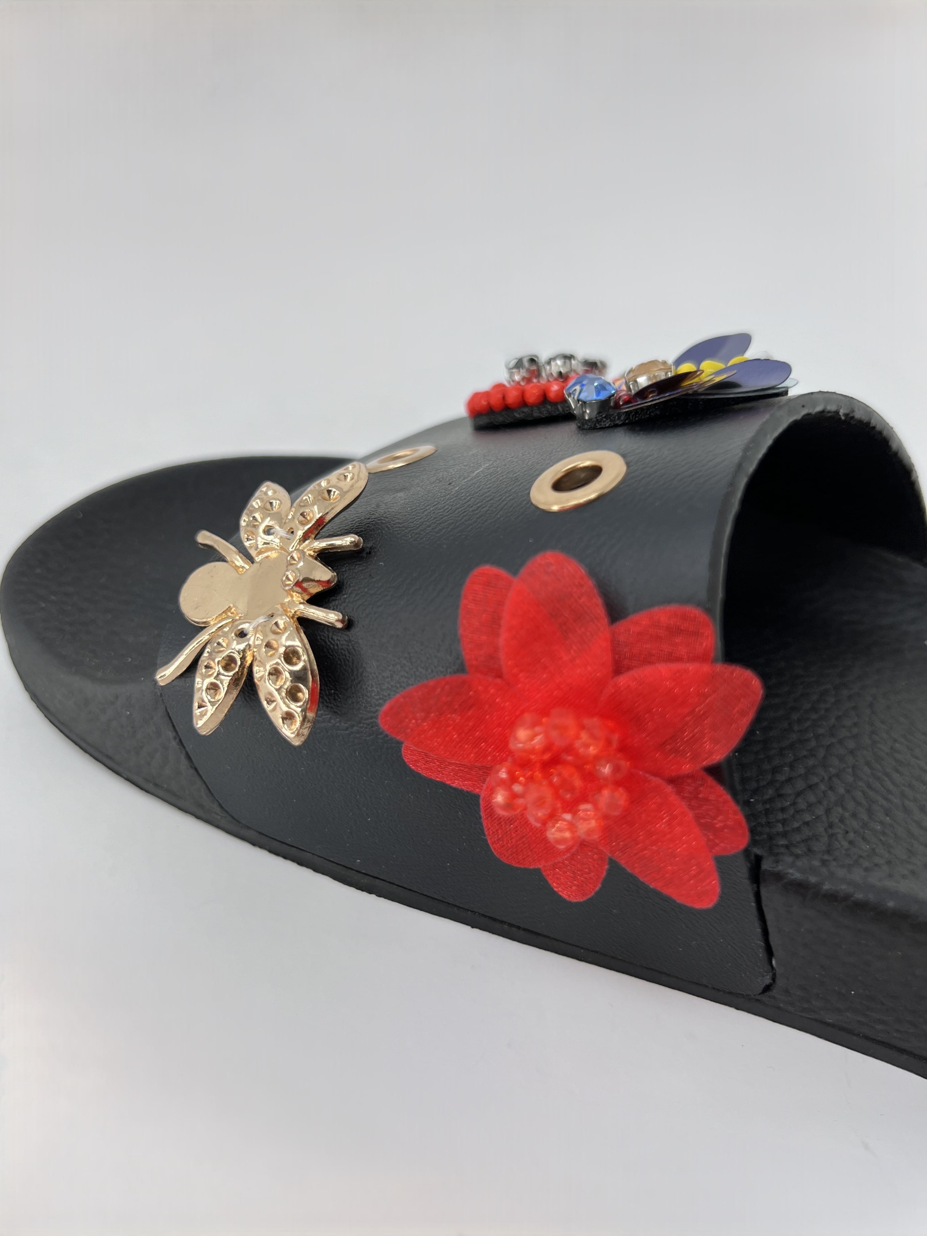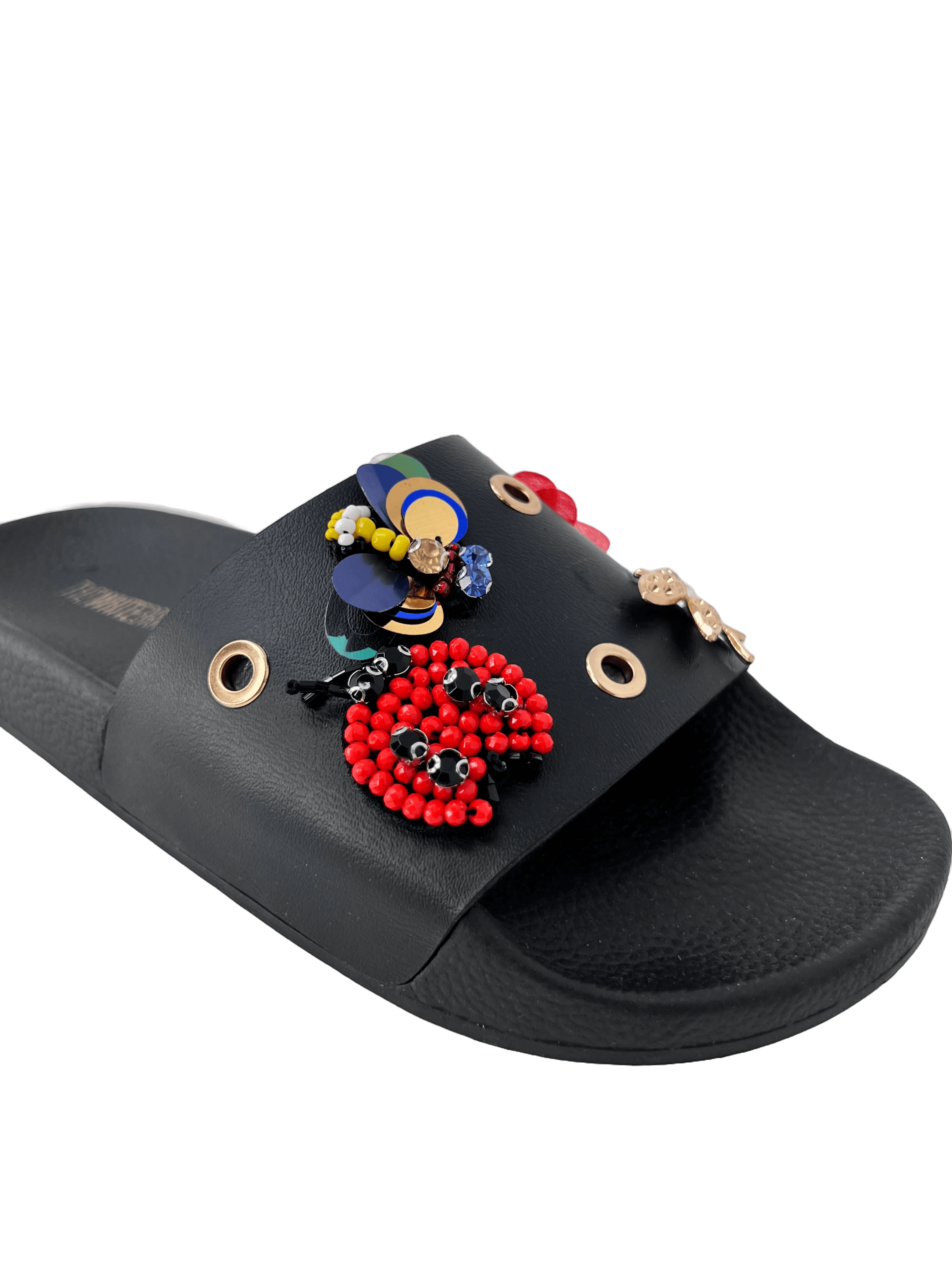 Auffällige Damen Pantoletten "Fly" von The White Brand. Insekten-Charms aus Perlen verzieren die Pantoletten und machen sie zu einem wahren Hingucker.