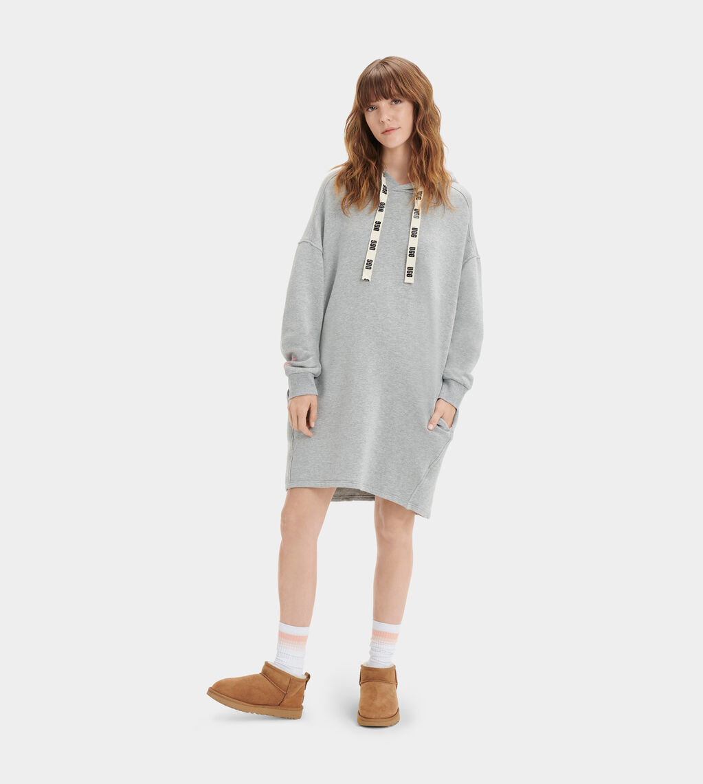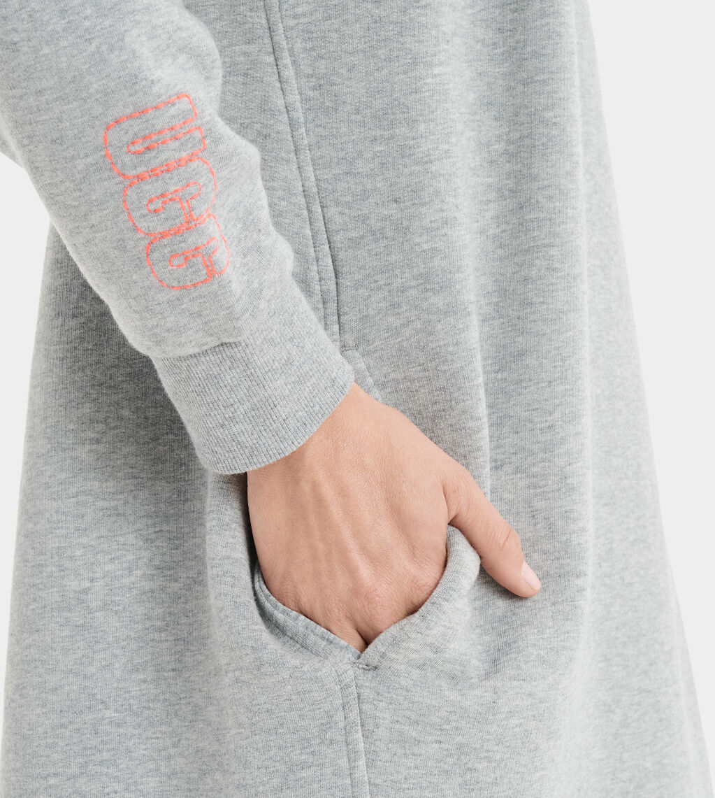 Aderyn von UGG ist ein Kaputzenkleid oder auch ein Longhoodie mit bedrucktem Ugg Logo am Tunnelzug der Kaputze. Es ist aus kuscheligem Sweat mit flauschigem Innenfutter. Hinten ist das Sweatkleid leicht abgerunden und hat zwei Seitentaschen. Trag es zu Leggins mit Sneaker oder derben Schnürrstiefel oder trag es zu enger Jeans oder mit Strumpfhose.