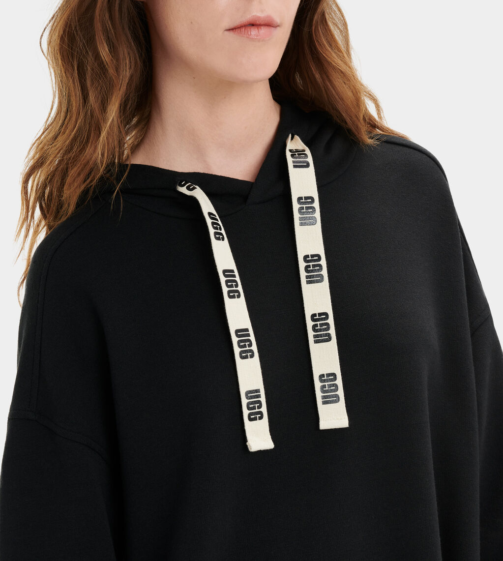 Aderyn von UGG ist ein Kaputzenkleid oder auch ein Longhoodie mit bedrucktem Ugg Logo am Tunnelzug der Kaputze. Es ist aus kuscheligem Sweat mit flauschigem Innenfutter. Hinten ist das Sweatkleid leicht abgerunden und hat zwei Seitentaschen. Trag es zu Leggins mit Sneaker oder derben Schnürrstiefel oder trag es zu enger Jeans oder mit Strumpfhose.