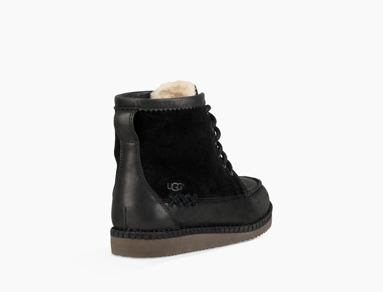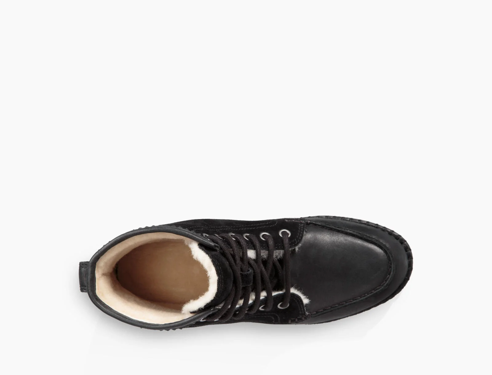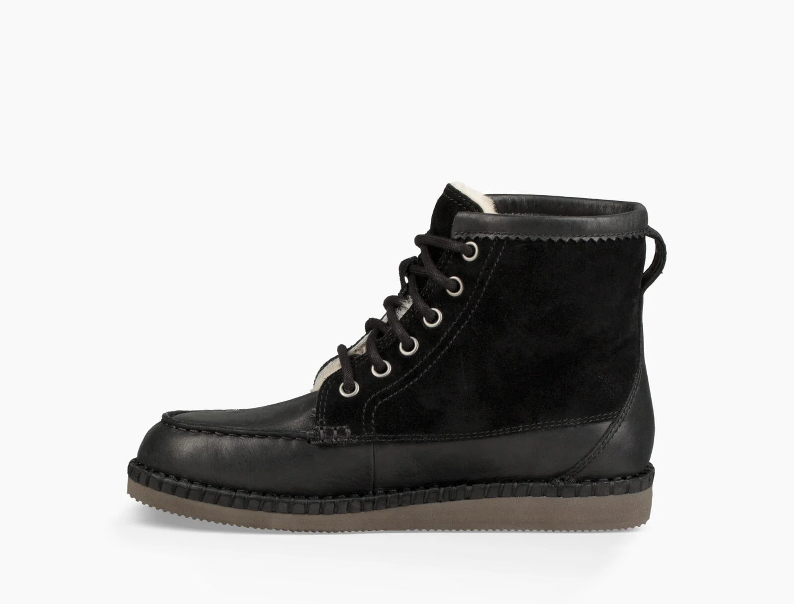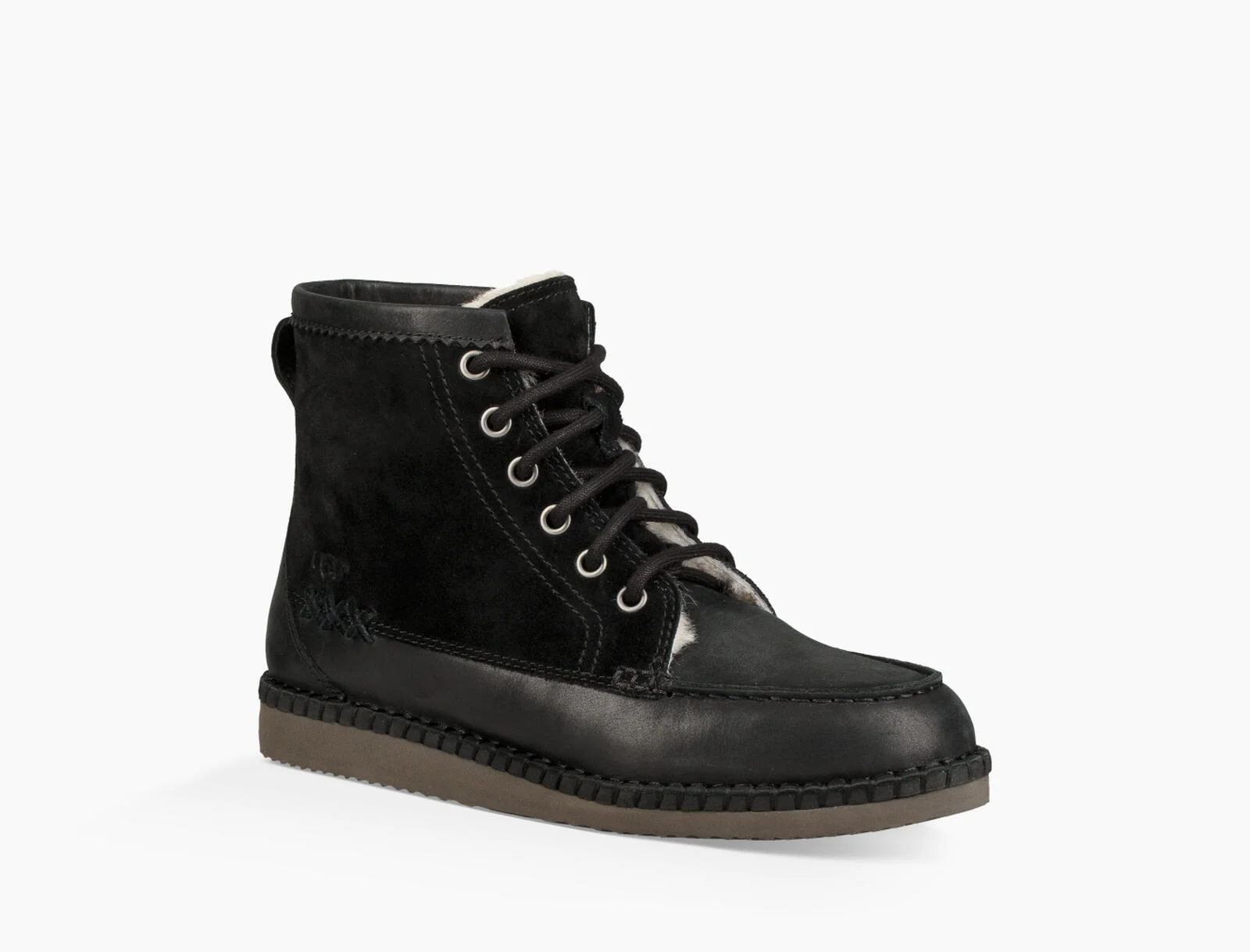 Mokassin trifft Military Boot.Quinlin ist ein Leder Schnürr Schuh, gefüttert mit weichem Ugg Pure Lammwolle. Die gebondeten Nylon Nähte machen einen Eindurck wie ein Mokassin.
