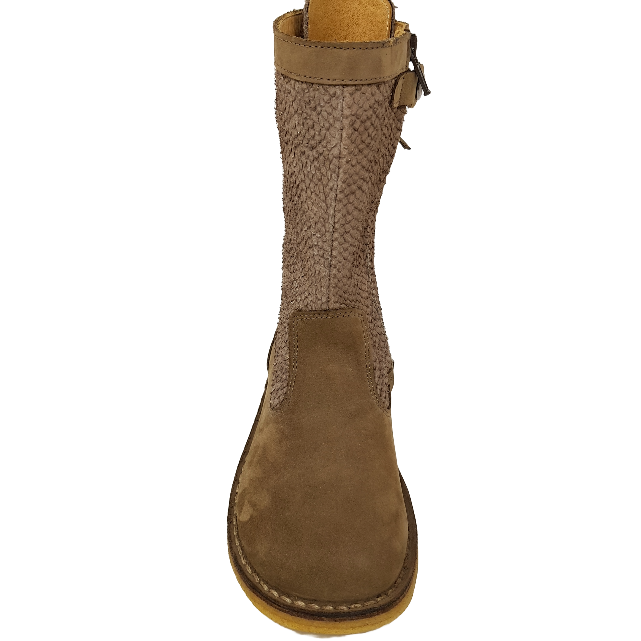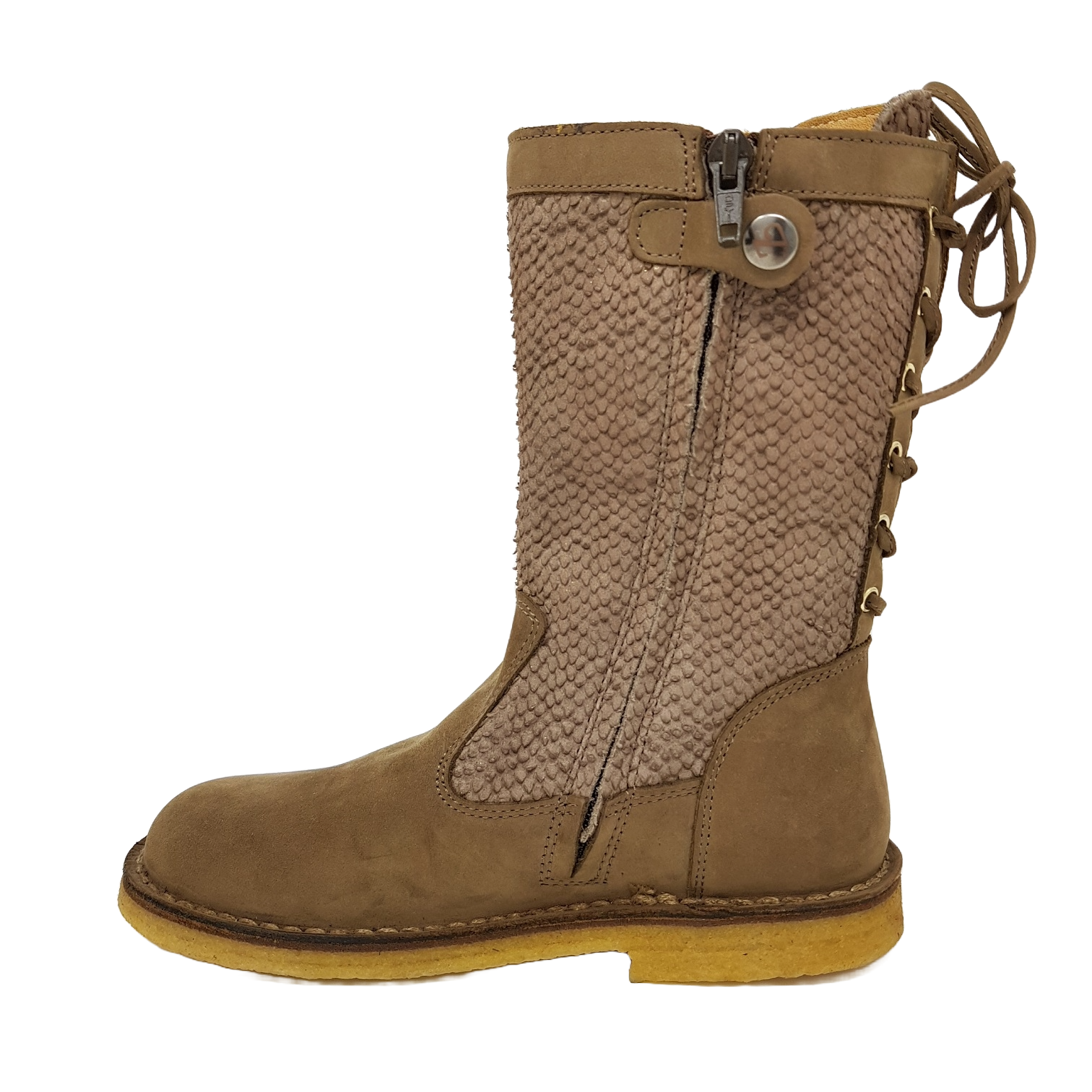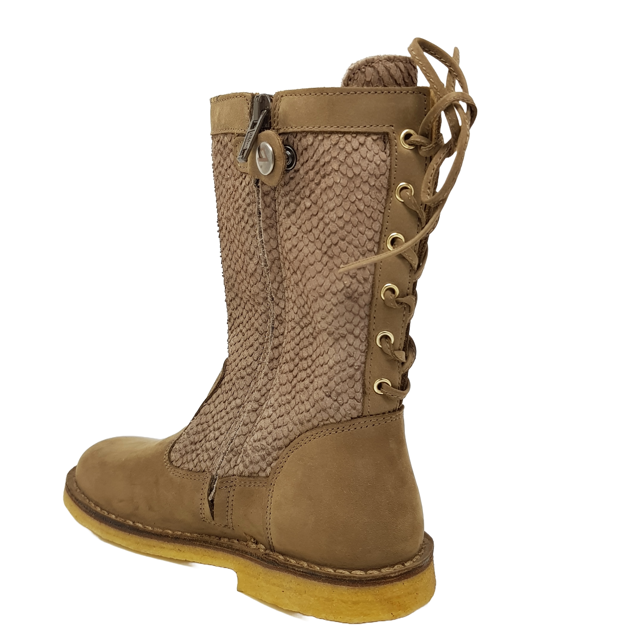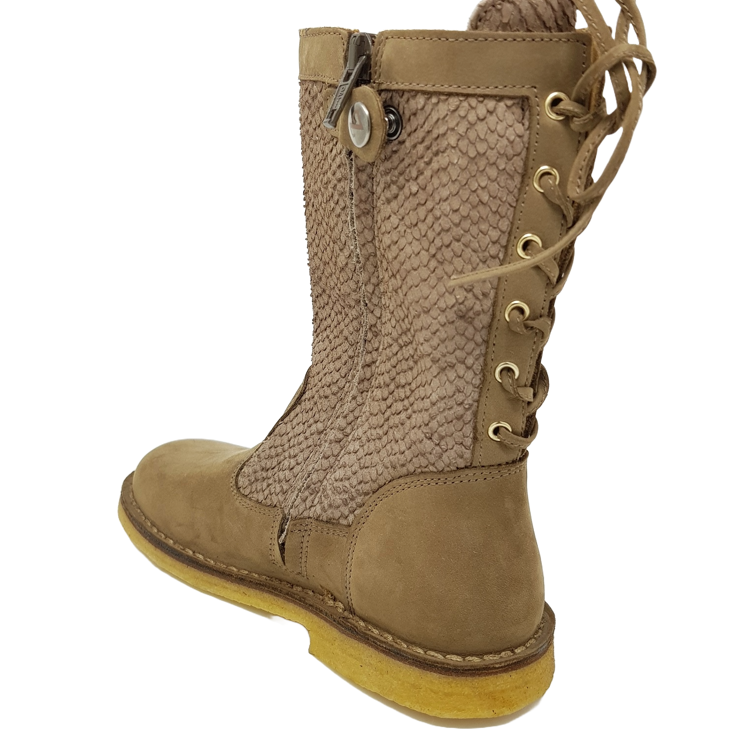Interessant ist die Schnürung hinten am Stiefel und das Krokuleder am Schaft.