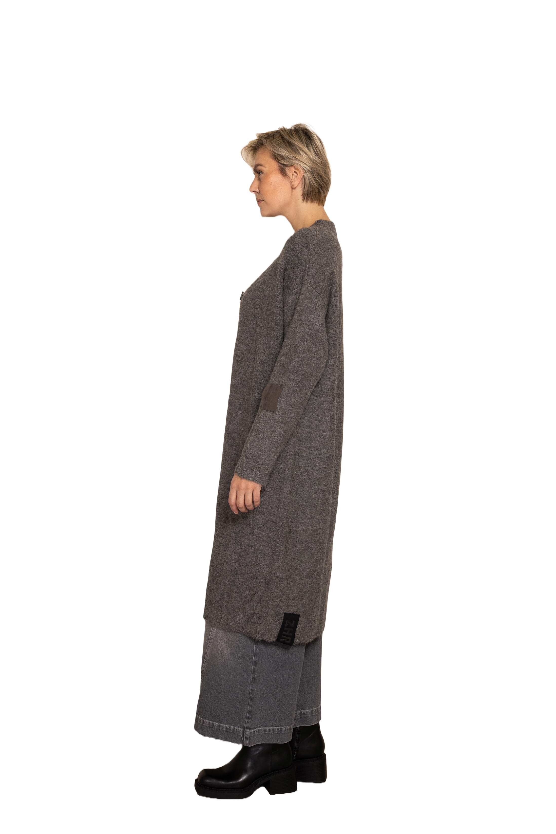 Mit seiner wadenlangen Regular-Fit-Silhouette eignet sich der Strickmantel perfekt für Layering-Looks.